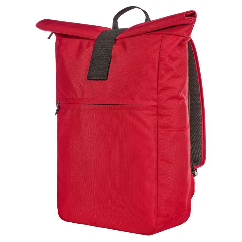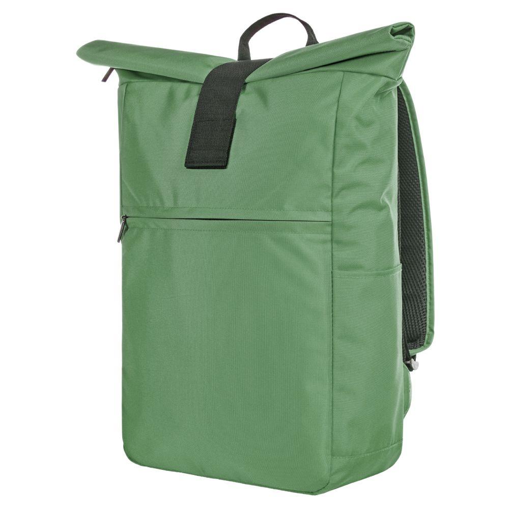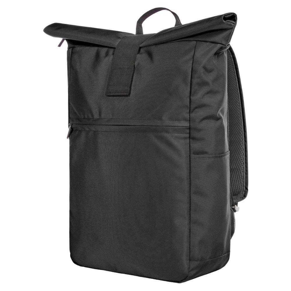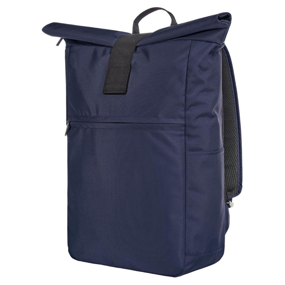 urbaner Überschlag-Rucksack; großes Hauptfach mit Reißverschluss und zusätzlicher Klettlasche; RPET-Obermaterial; gepolstertes Notebookfach und flaches Einsteckfach innen; große Reißverschluss-Vortasche auf der Front; zwei seitliche Einsteckfächer für z.B. Trinkflaschen; gepolstertes Tragesystem; Handgriff