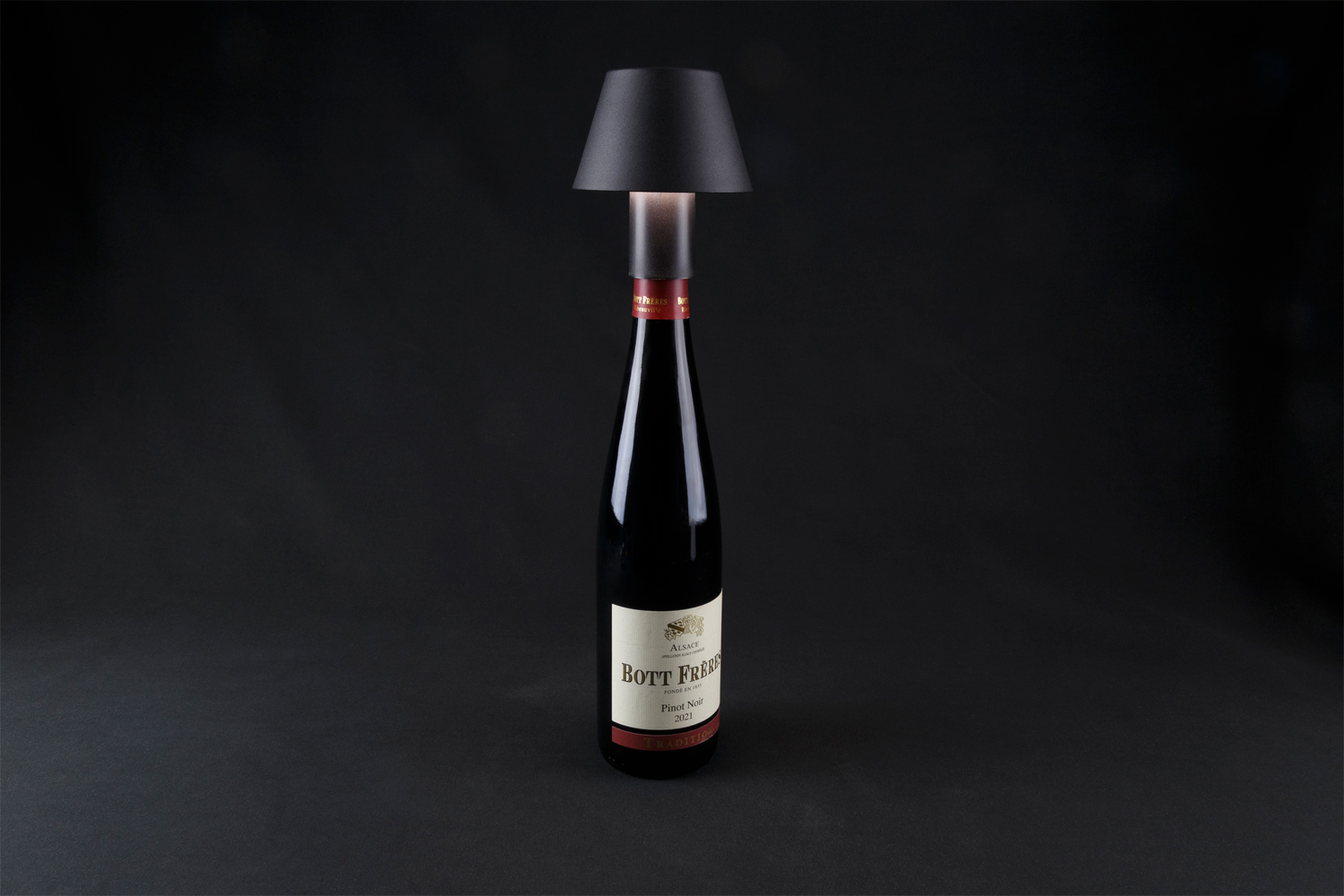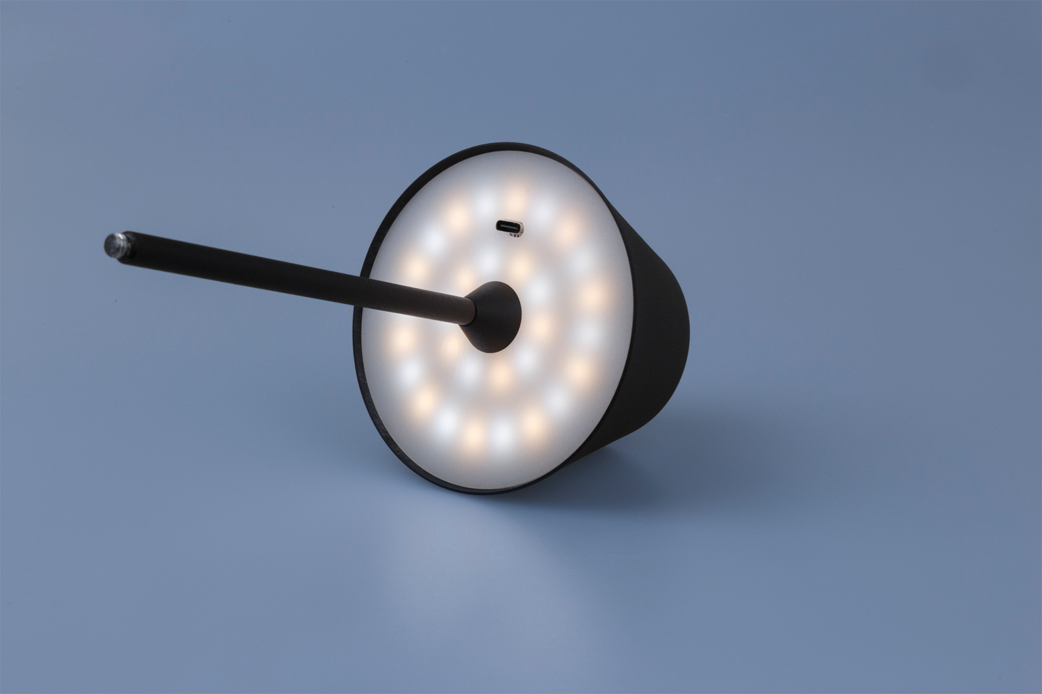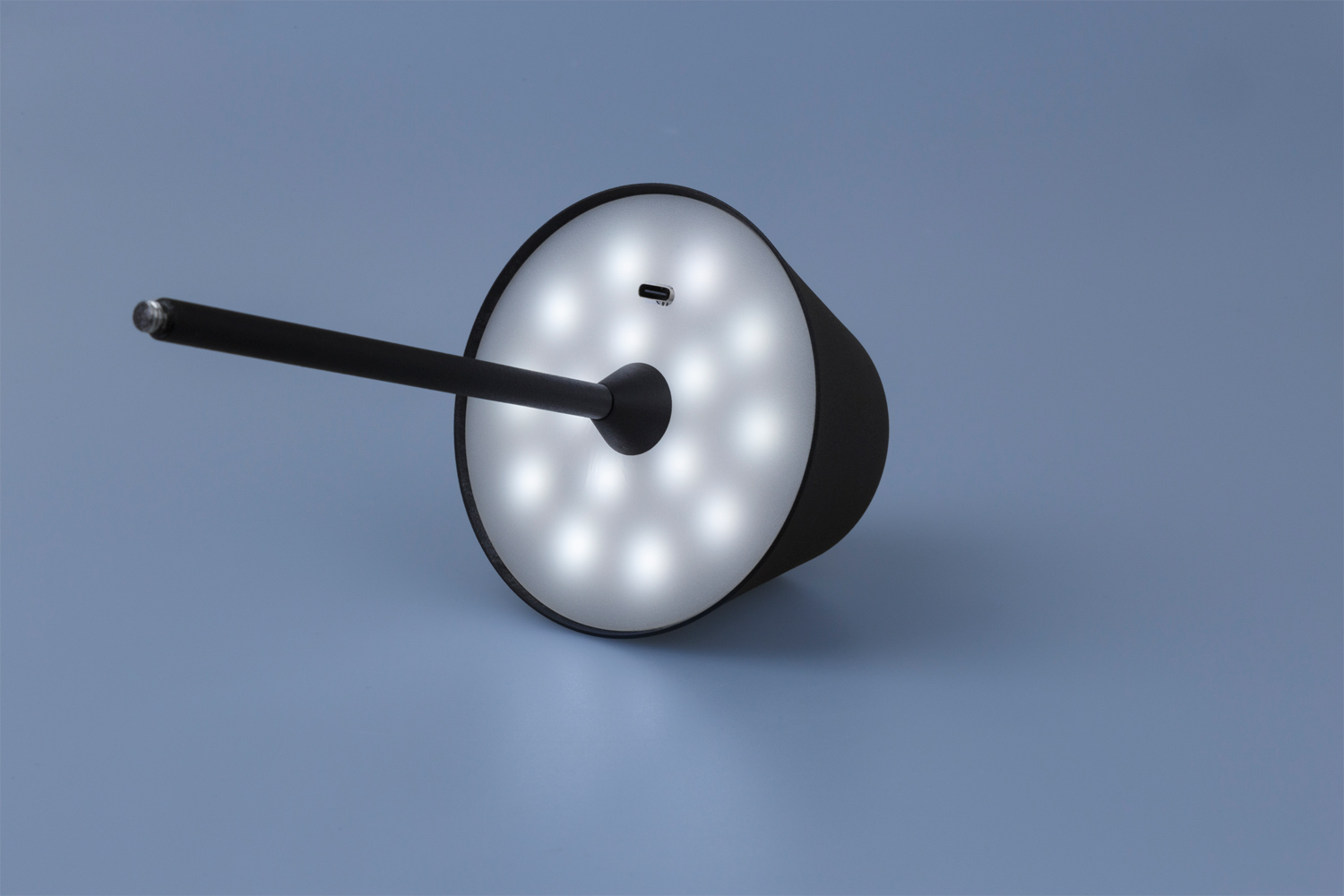 Mattschwarzes Aluminiumdesign, Anti-Rutsch-Schutz und dimmbares Licht in drei Farbtemperaturen. Wiederaufladbarer 1.200-mAh-Akku, ideal für Balkon, Wohnzimmer oder Garten. Inklusive Aufsatz für Flaschenhälse. Schutzklasse IPX44. Typ-C-Ladeanschluss.