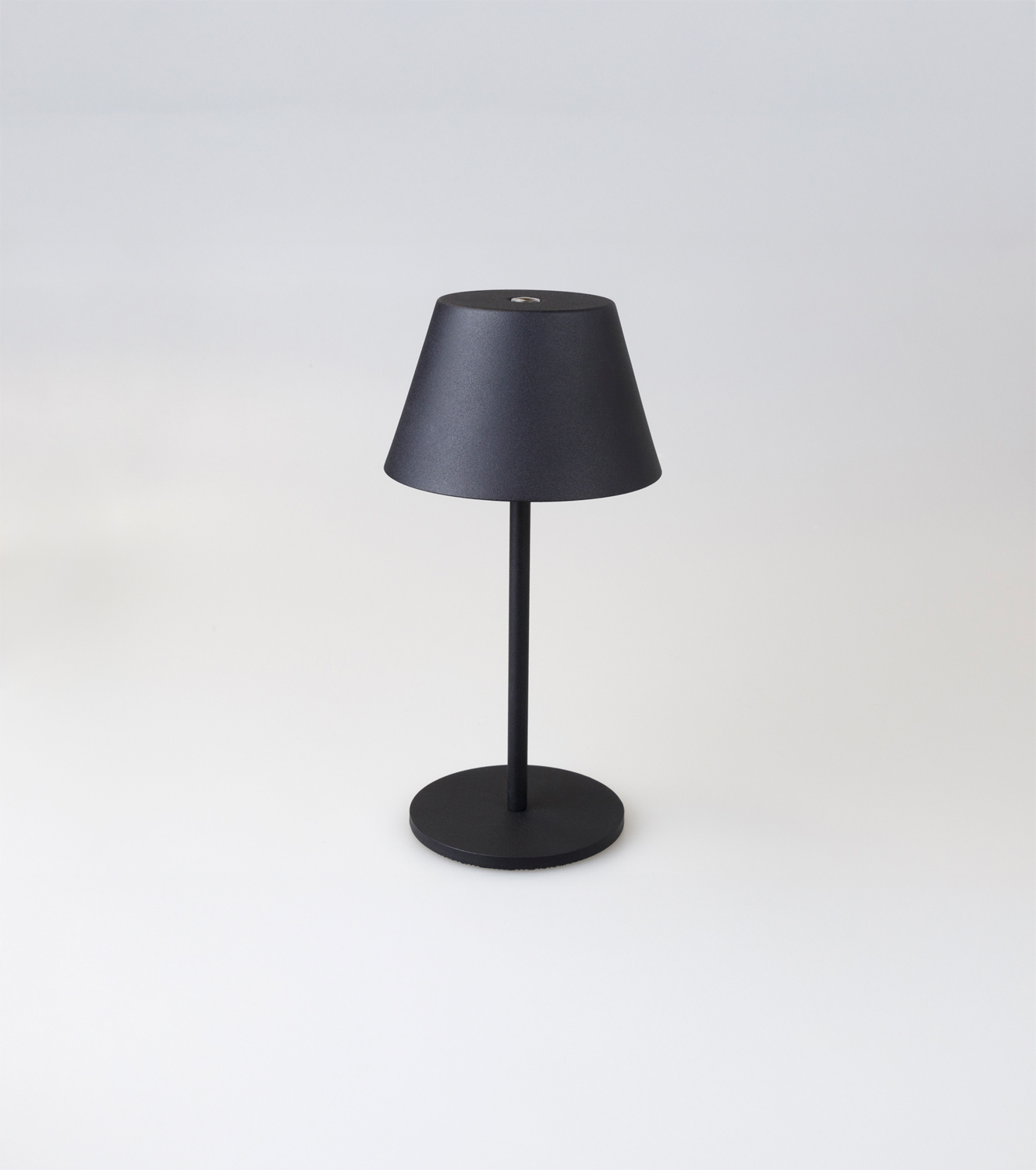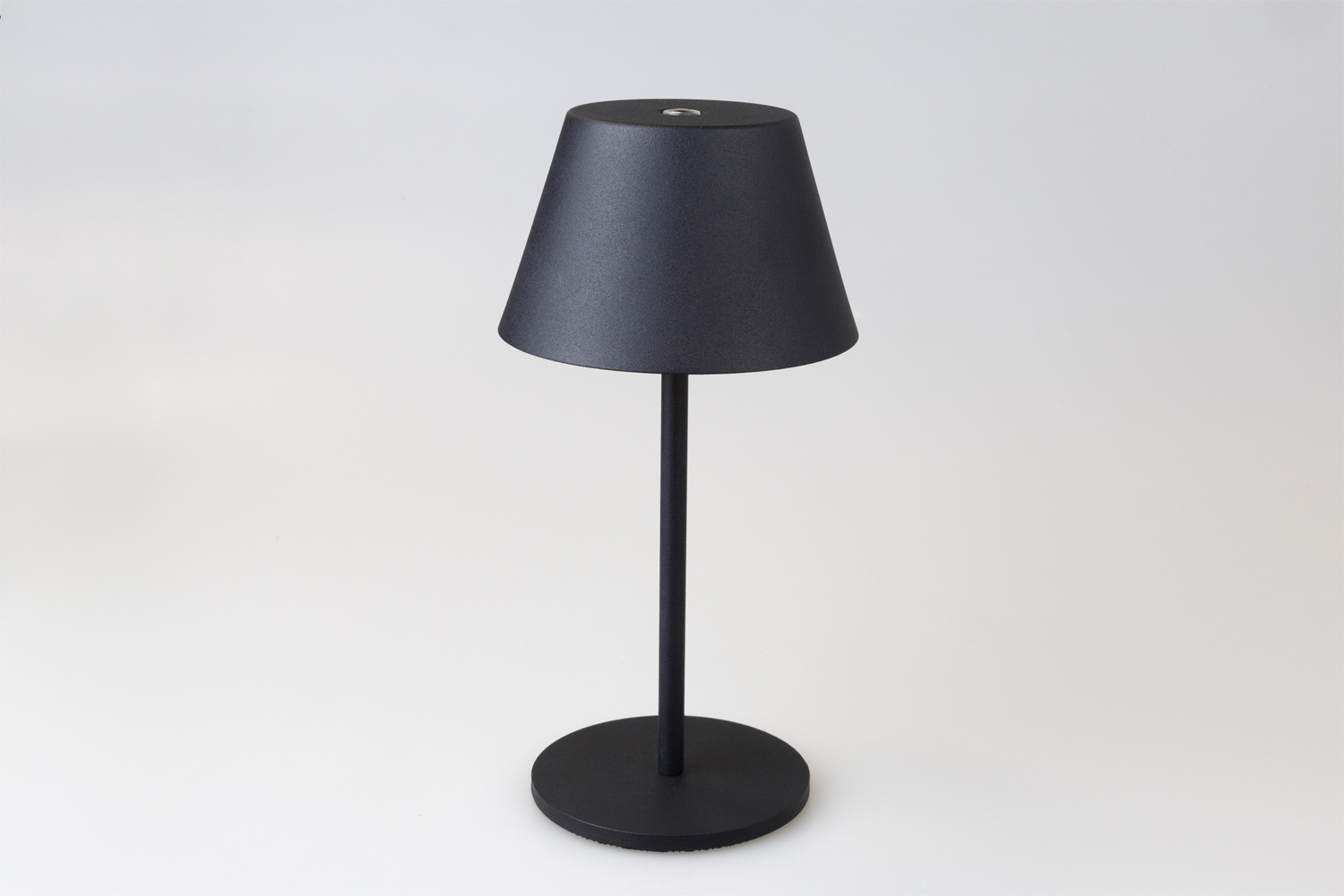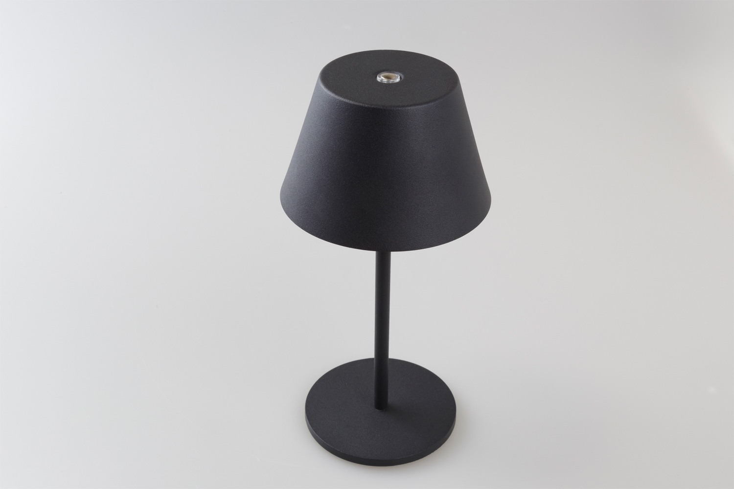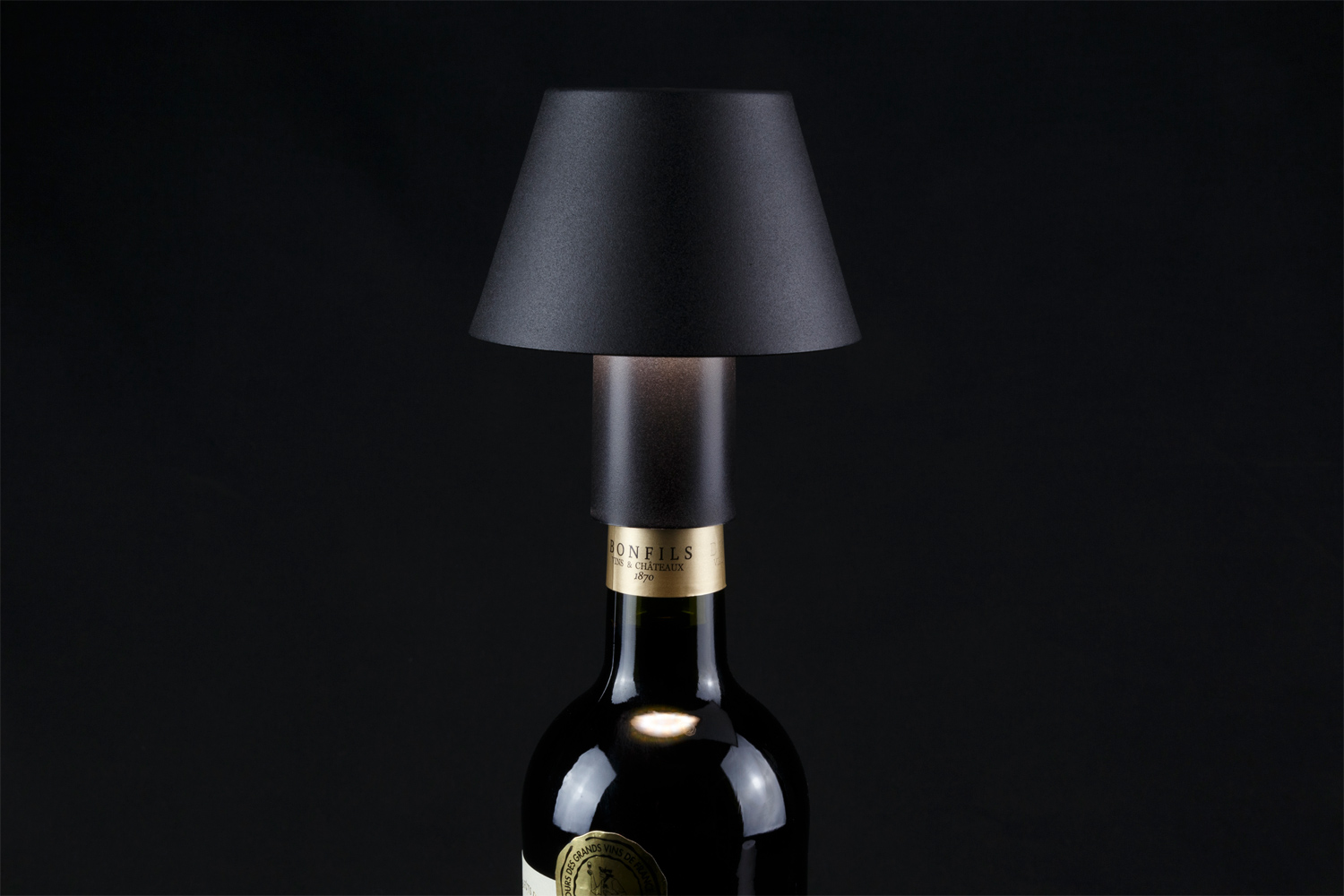 Mattschwarzes Aluminiumdesign, Anti-Rutsch-Schutz und dimmbares Licht in drei Farbtemperaturen. Wiederaufladbarer 1.200-mAh-Akku, ideal für Balkon, Wohnzimmer oder Garten. Inklusive Aufsatz für Flaschenhälse. Schutzklasse IPX44. Typ-C-Ladeanschluss.