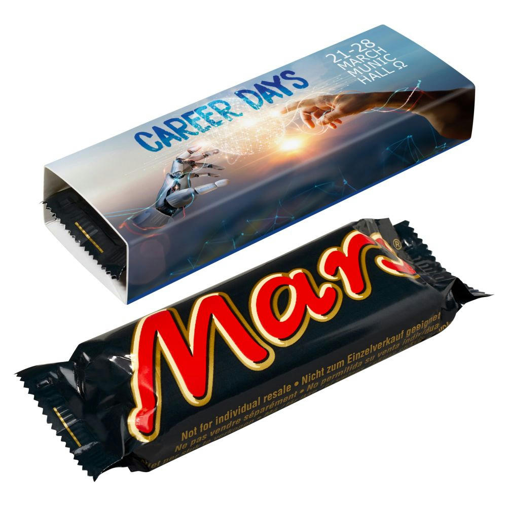 Nimm Mars – gib Gas! Der Powerriegel aus feinster Candycreme mit einer Schicht Karamell und umgeben von leckerer Milchschokolade. Ideal als Messe- oder Meeting-Snack, für zwischendurch im Büro oder unterwegs. In handelsüblicher Ausführung mit Werbeschuber. Haltbarkeit: ca. 3 Monate bei sachgerechter Lagerung. Preis inkl. 1-4c Druck.