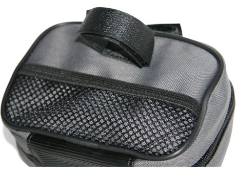 Täschchen aus grau/schwarzem D600-Nylon, mit 2 Klettstreifen zum problemlosen Befestigen am Fahrrad, Füllung Mini-Bike-Pack TM:1 Kombi-Fahrrad-Werkzeug-Tool aus Karbon-Stahl, 1 Schlauch-Reparatur-Set 17/XX, 2 Reifen