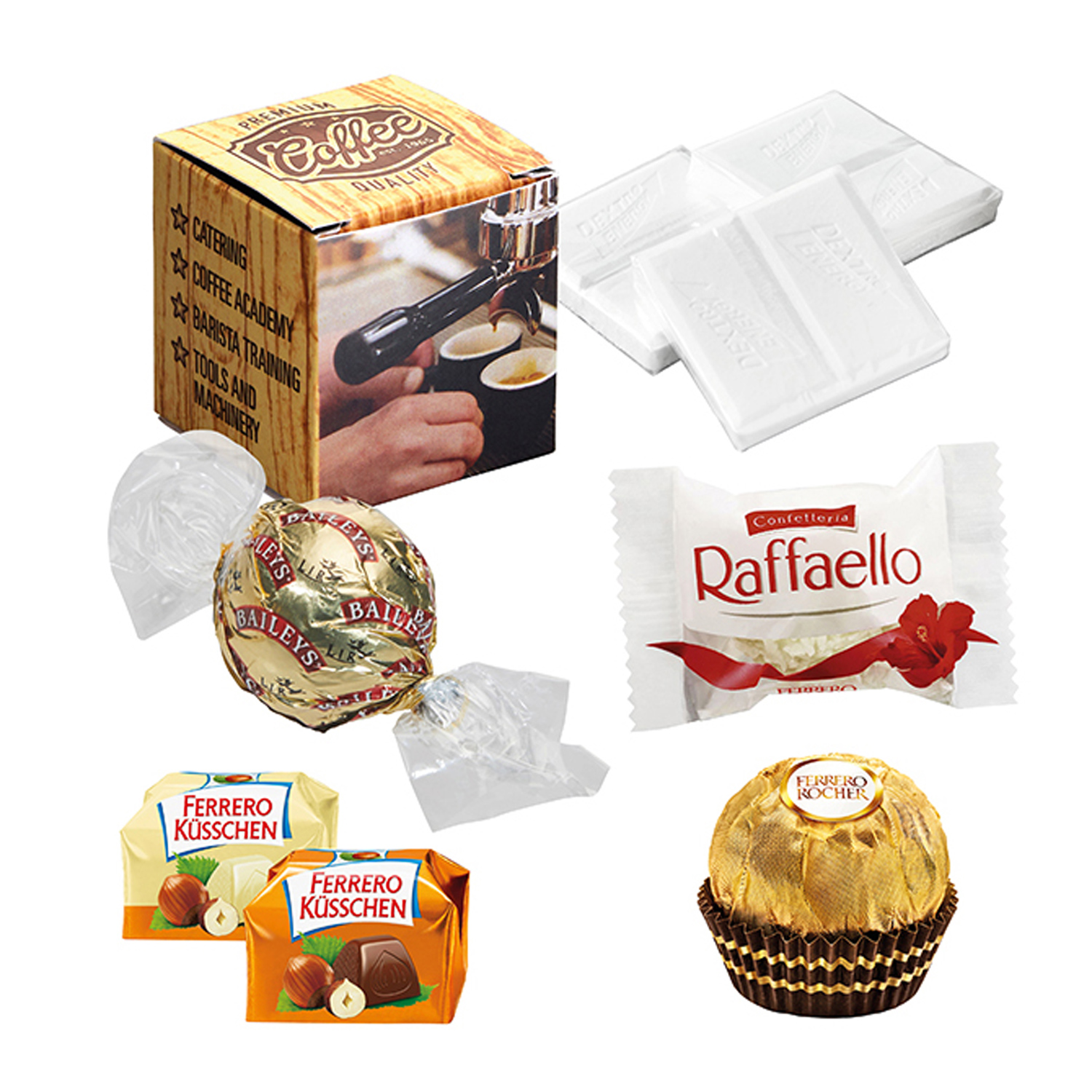 Gefüllte weiße Mini-Kartonage in Würfelform. Inhalt: 5 St. DEXTRO ENERGY* à ca. 5,75 g. Haltbarkeit: ca. 12 Monate. Weitere Füllvarianten auf Anfrage. Preis inkl. 4c-Druck