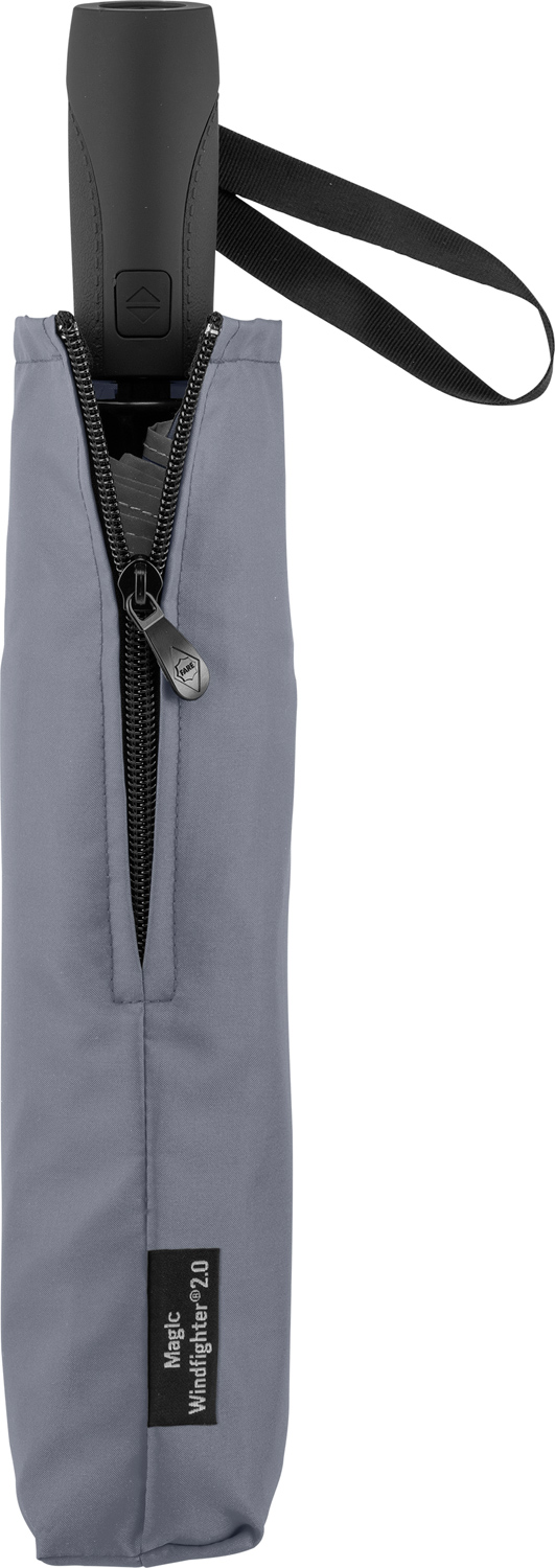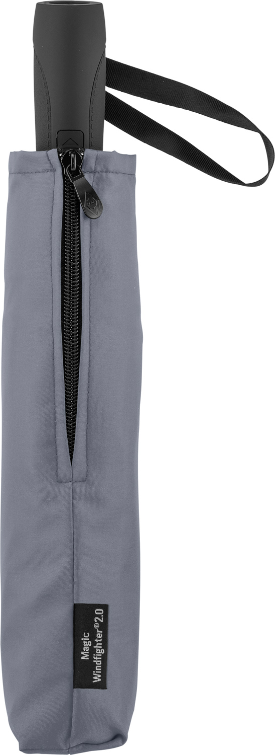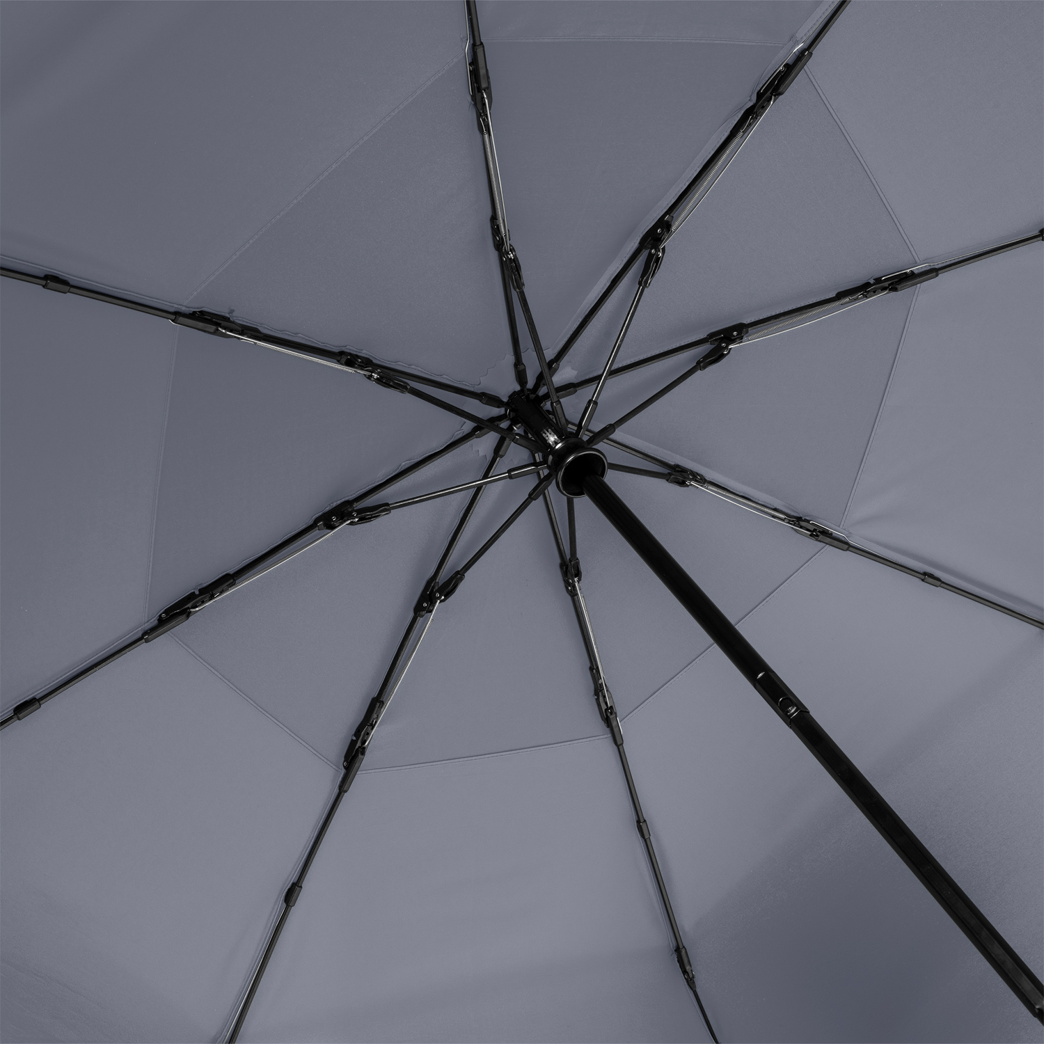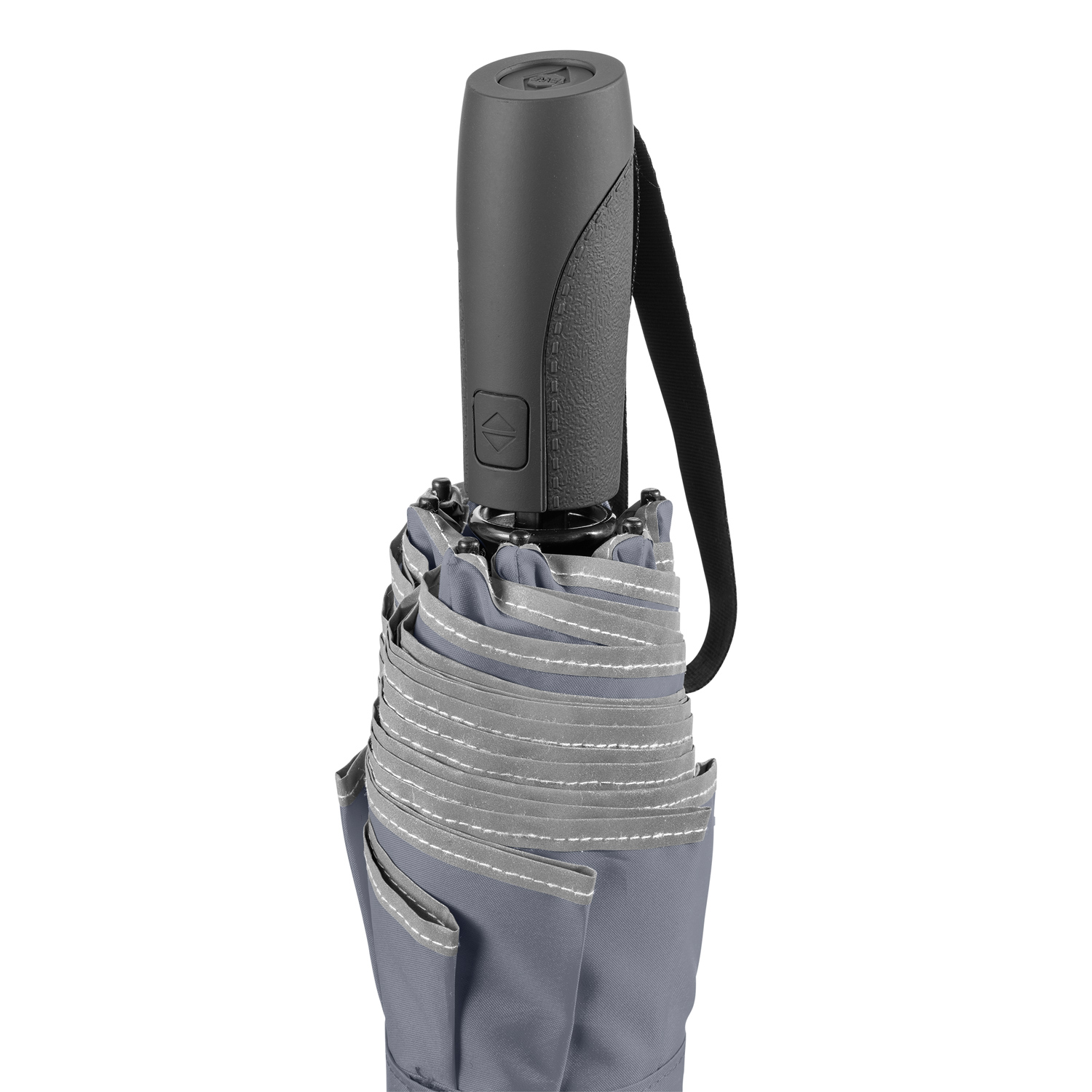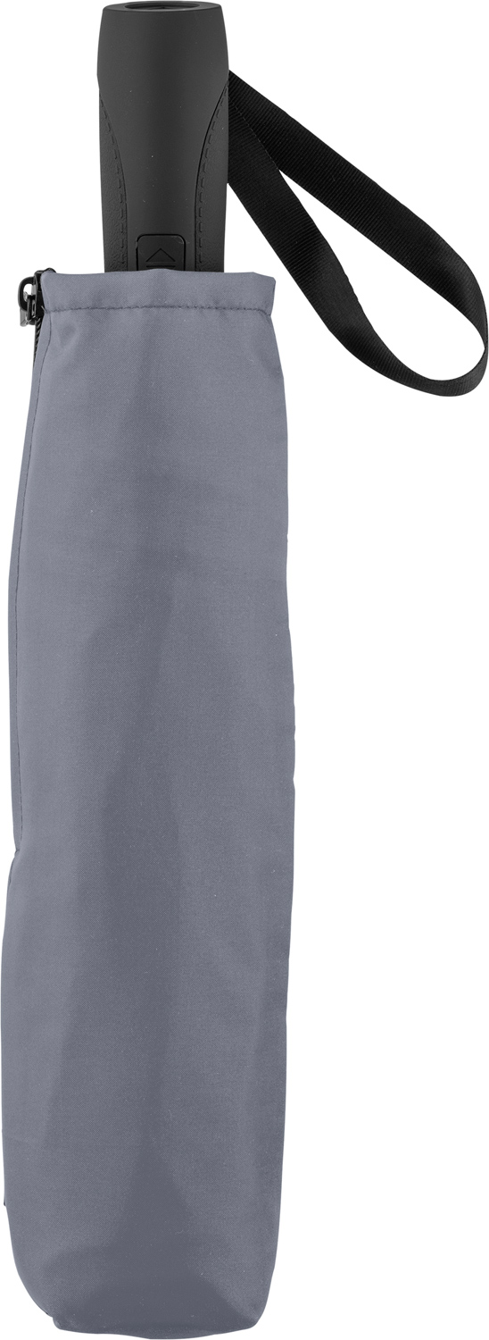 Filigraner Handöffner-Taschenschirm in ultraleichter Ausführung. Einfache Handhabung durch Sicherheitsschieber, hochwertiges Windproof-PLUS-System für eine maximale Gestell-Flexibilität bei stärkeren Windböen, schwarzer Aluminiumstock, Polyester-Pongee Bezugsmaterial aus recycelten Kunststoffen, extra leichter Bezug, matt-schwarzer Kunststoffgriff mit Werbeanbringungsmöglichkeit, handtaschentauglich durch ultraleichtes Gewicht und kompakte Größe