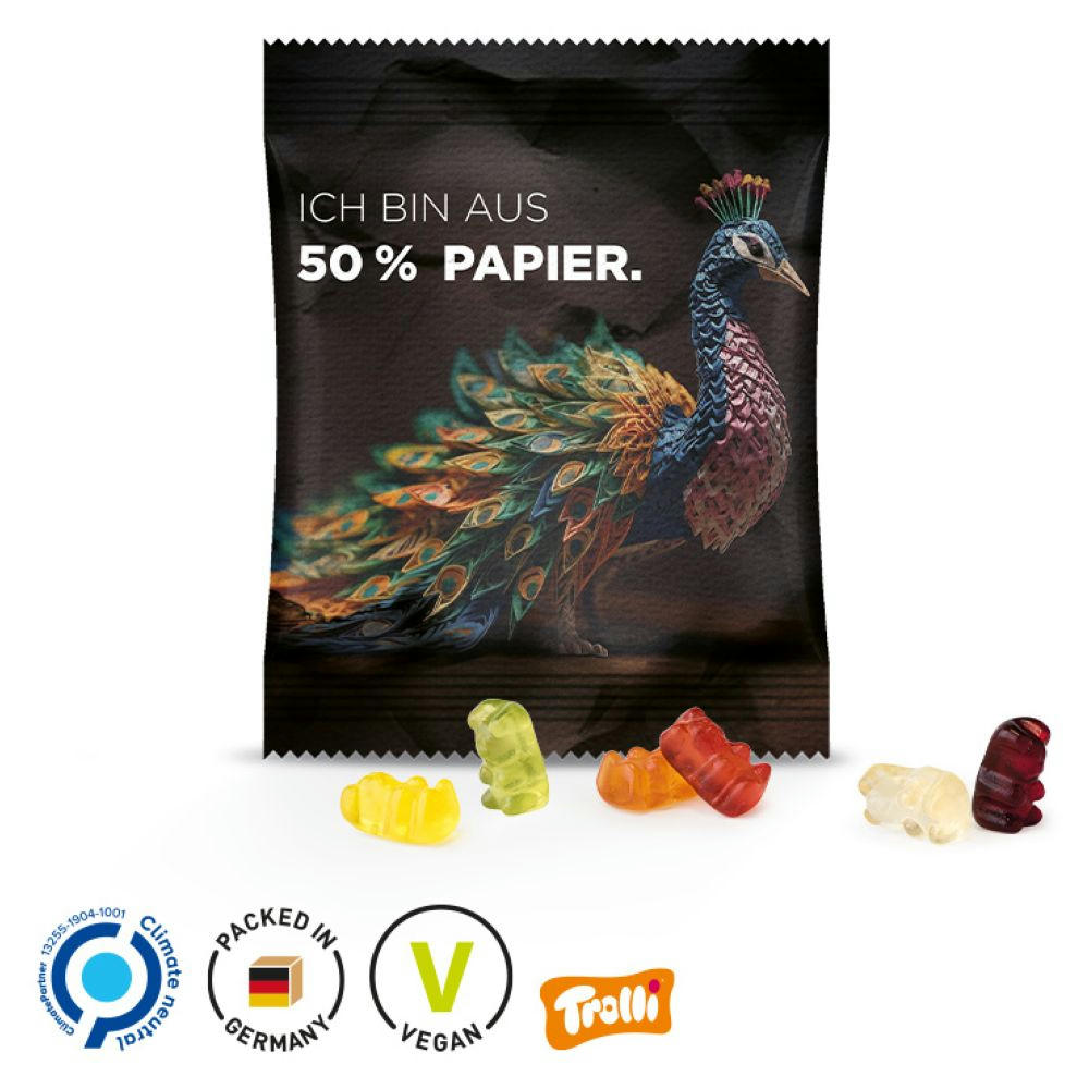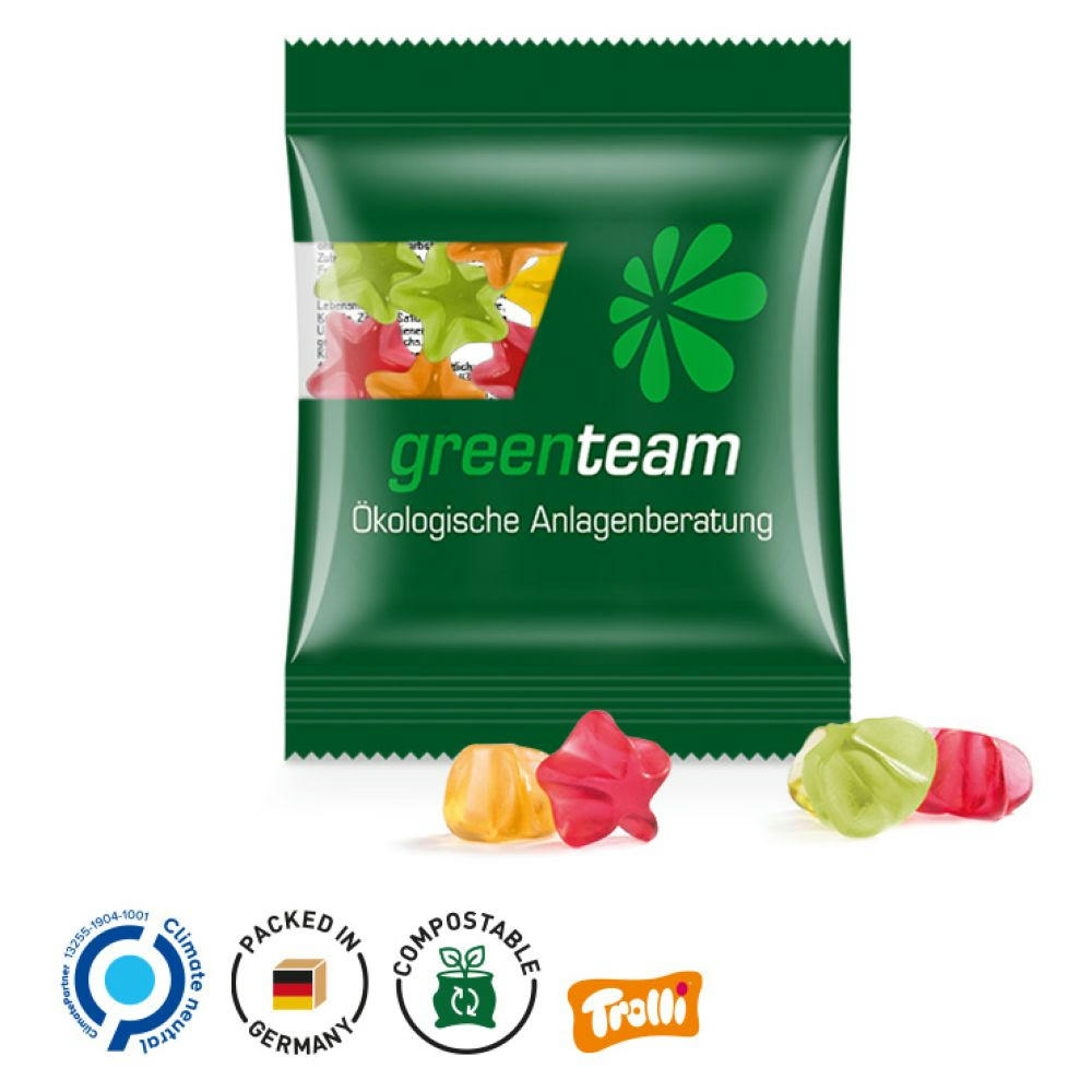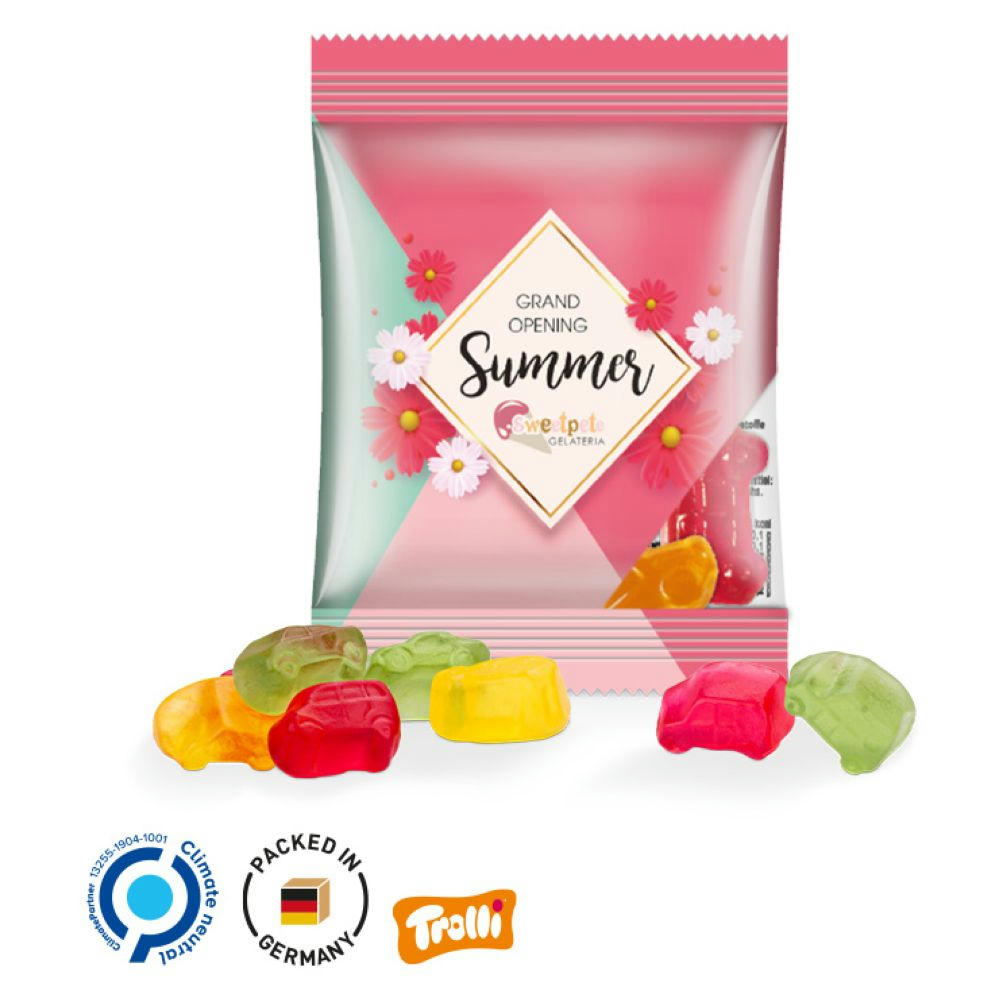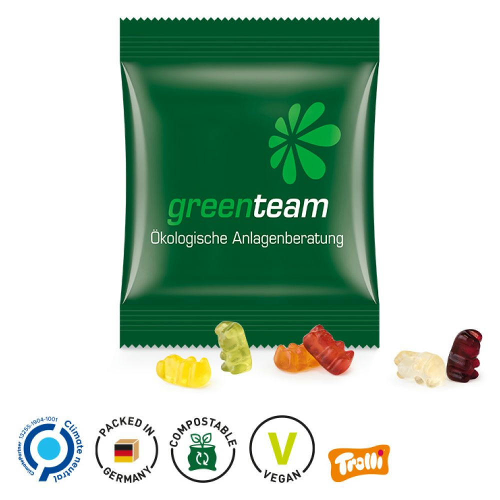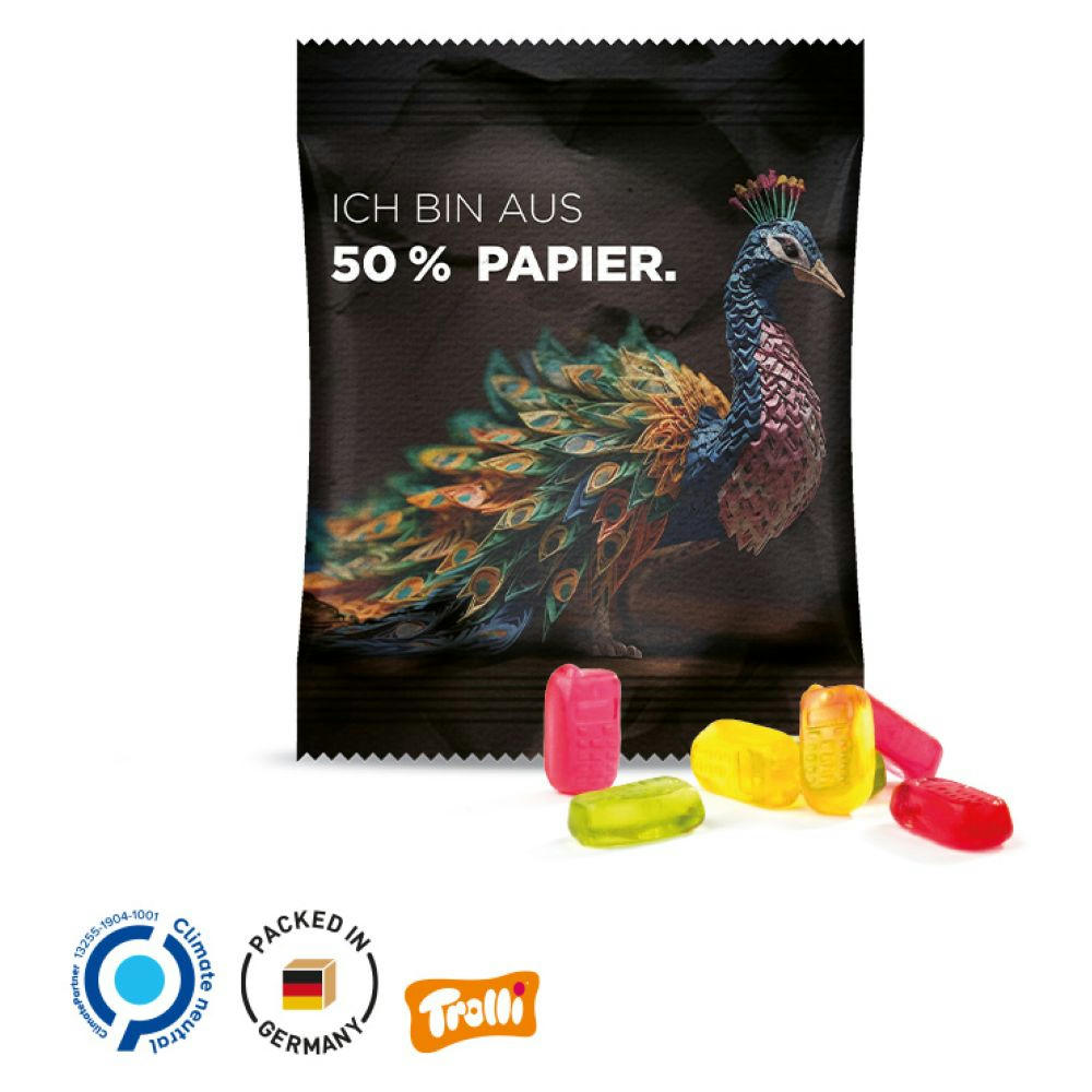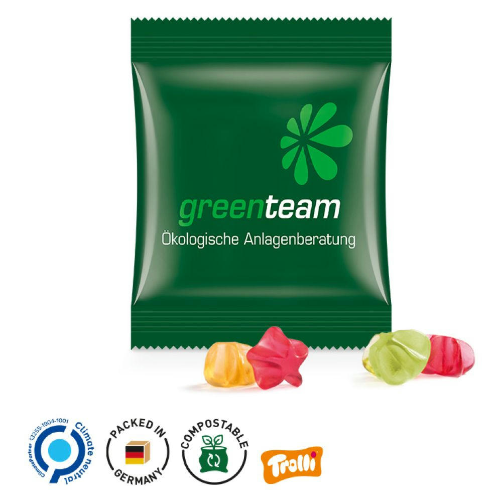 Trolli vegane Gummibärchen in Tüte aus transparenter Folie, kompostierbar, individuell bedruckt. Inhalt: Trolli vegane Gummibärchen mit 14 % Fruchtsaftanteil, bunt gemischt, 12 g