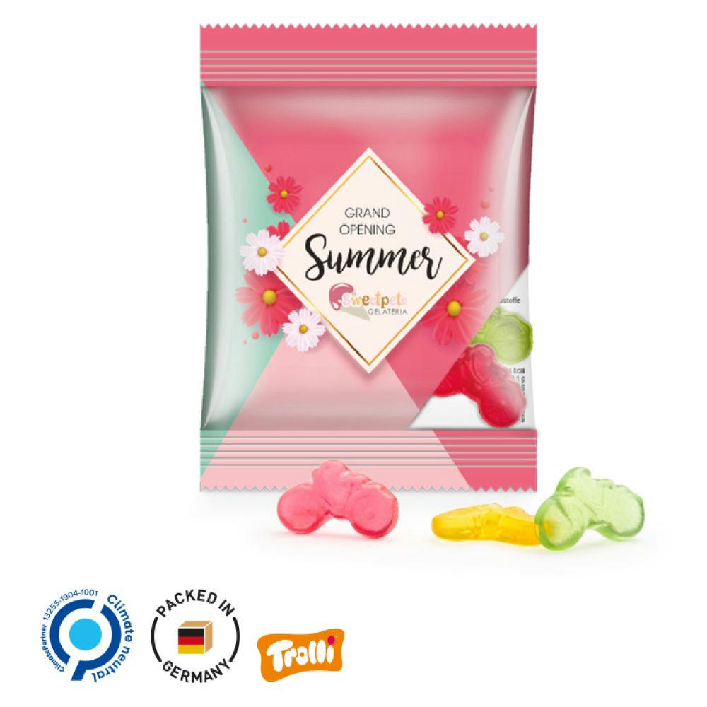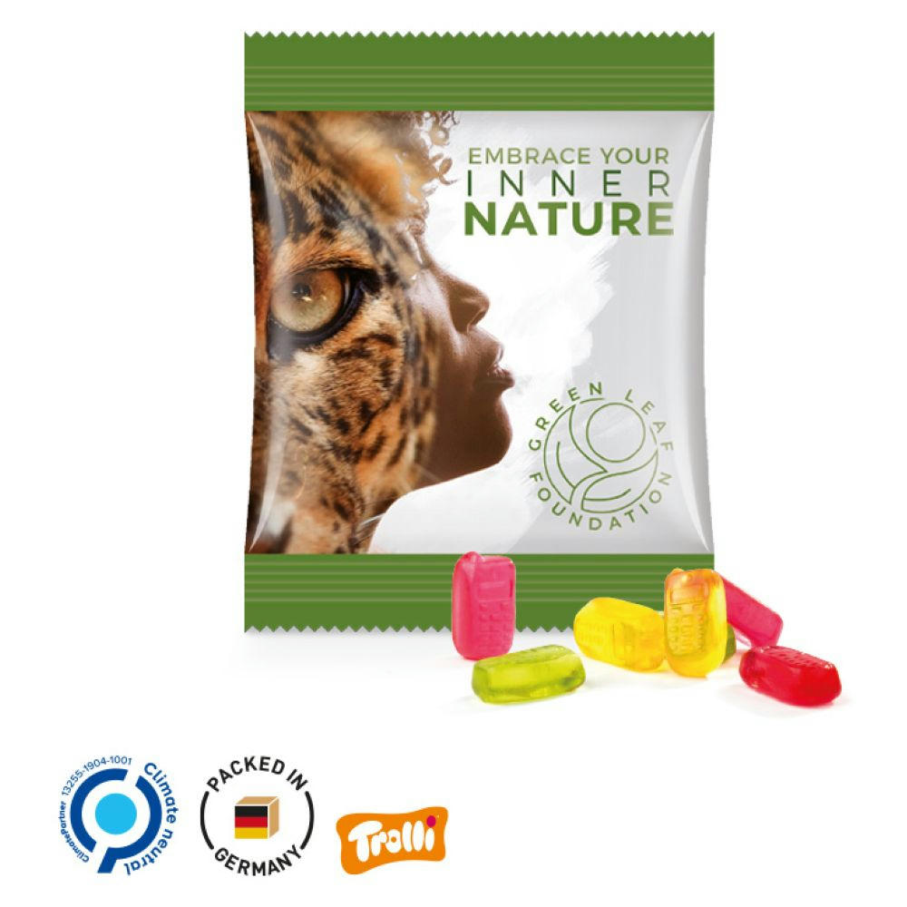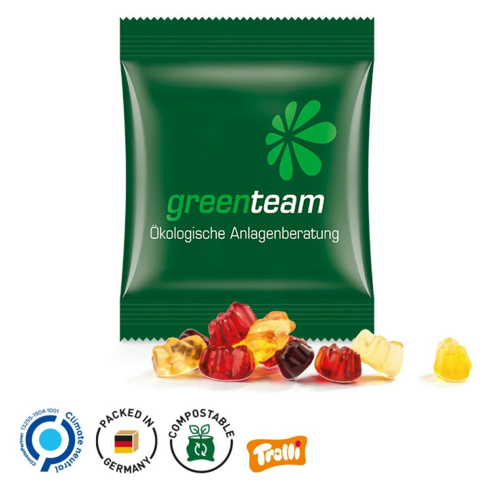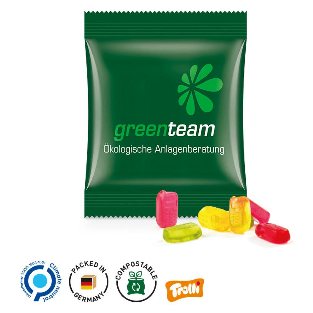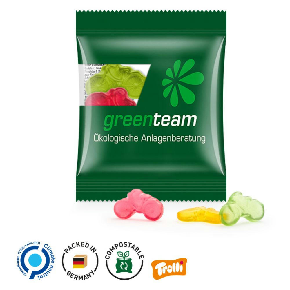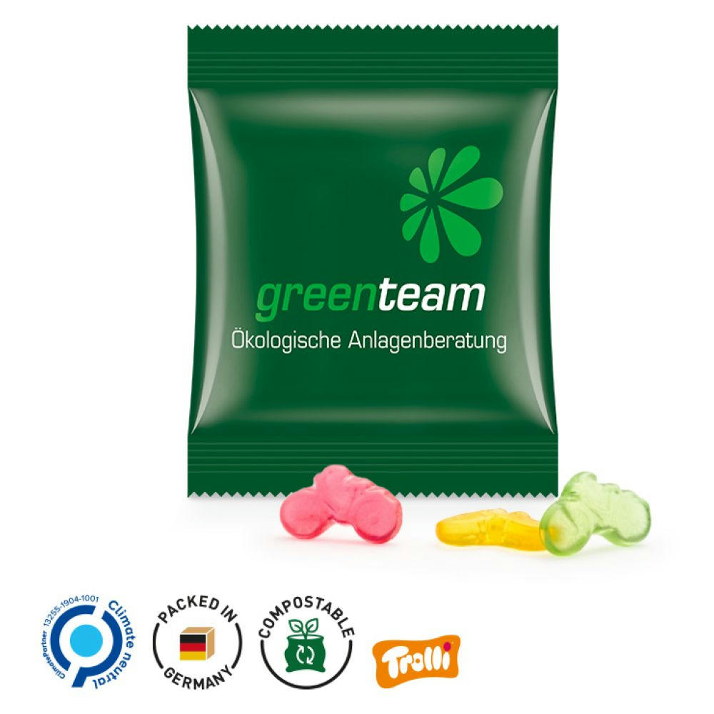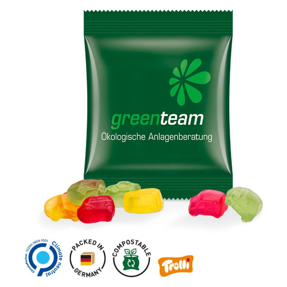 Trolli vegane Gummibärchen in Tüte aus transparenter Folie, kompostierbar, individuell bedruckt. Inhalt: Trolli vegane Gummibärchen mit 14 % Fruchtsaftanteil, bunt gemischt, 12 g