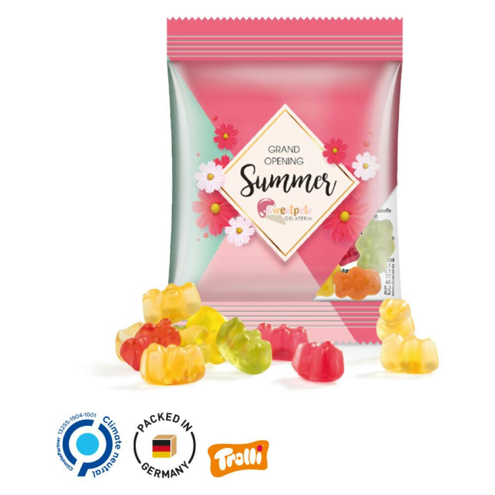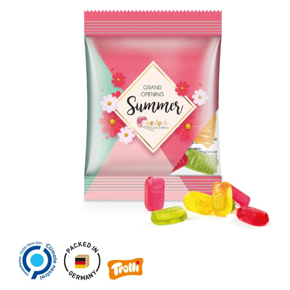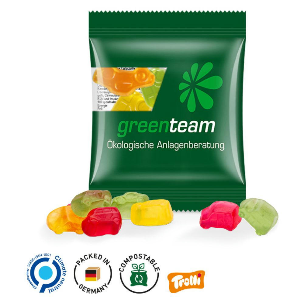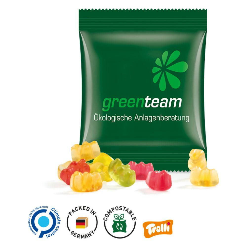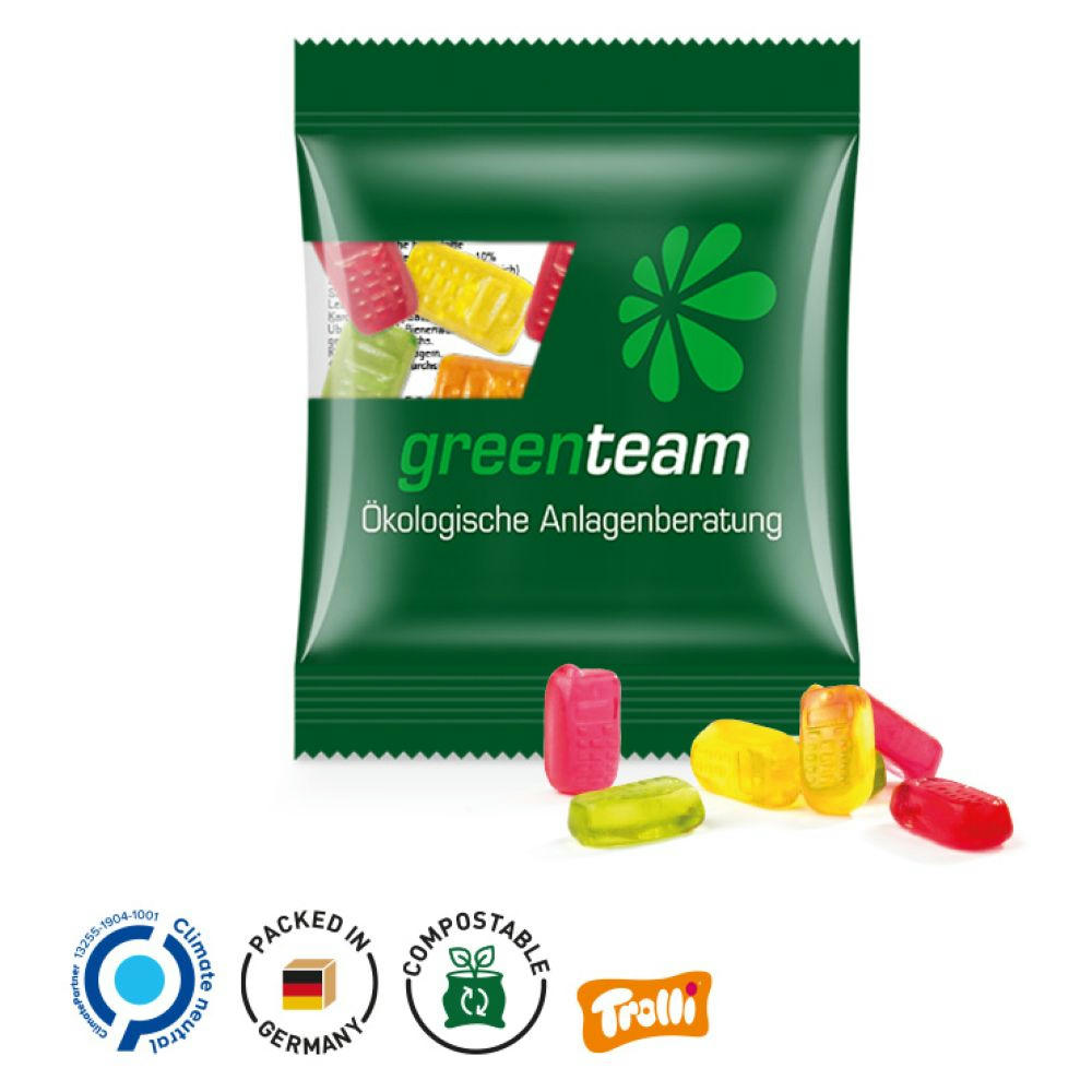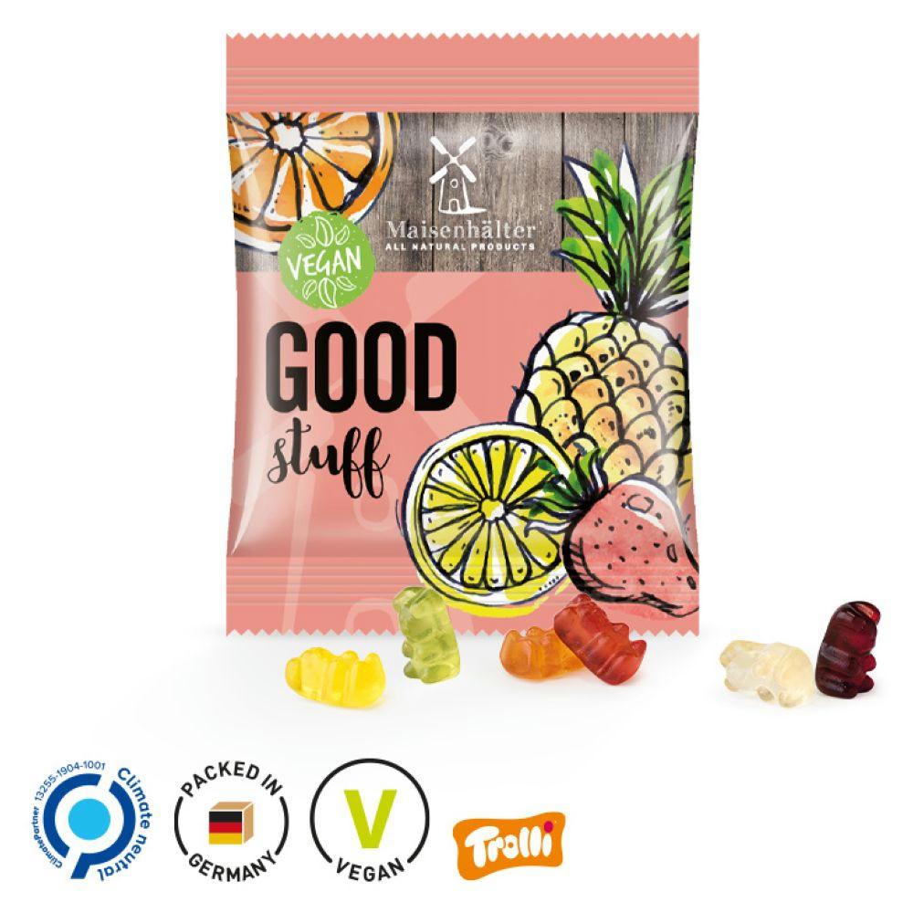 Trolli vegane Gummibärchen in Tüte aus transparenter Folie, kompostierbar, individuell bedruckt. Inhalt: Trolli vegane Gummibärchen mit 14 % Fruchtsaftanteil, bunt gemischt, 12 g