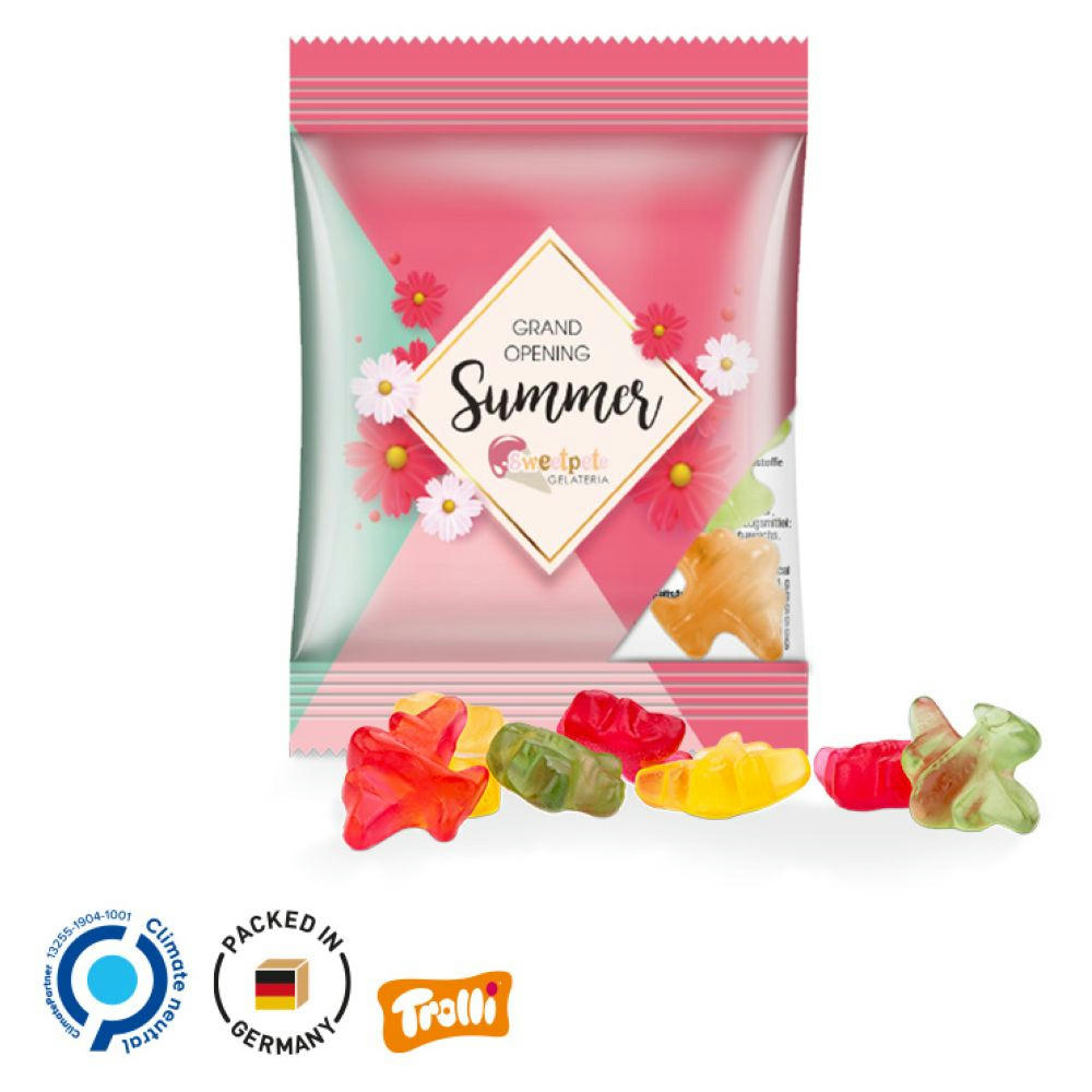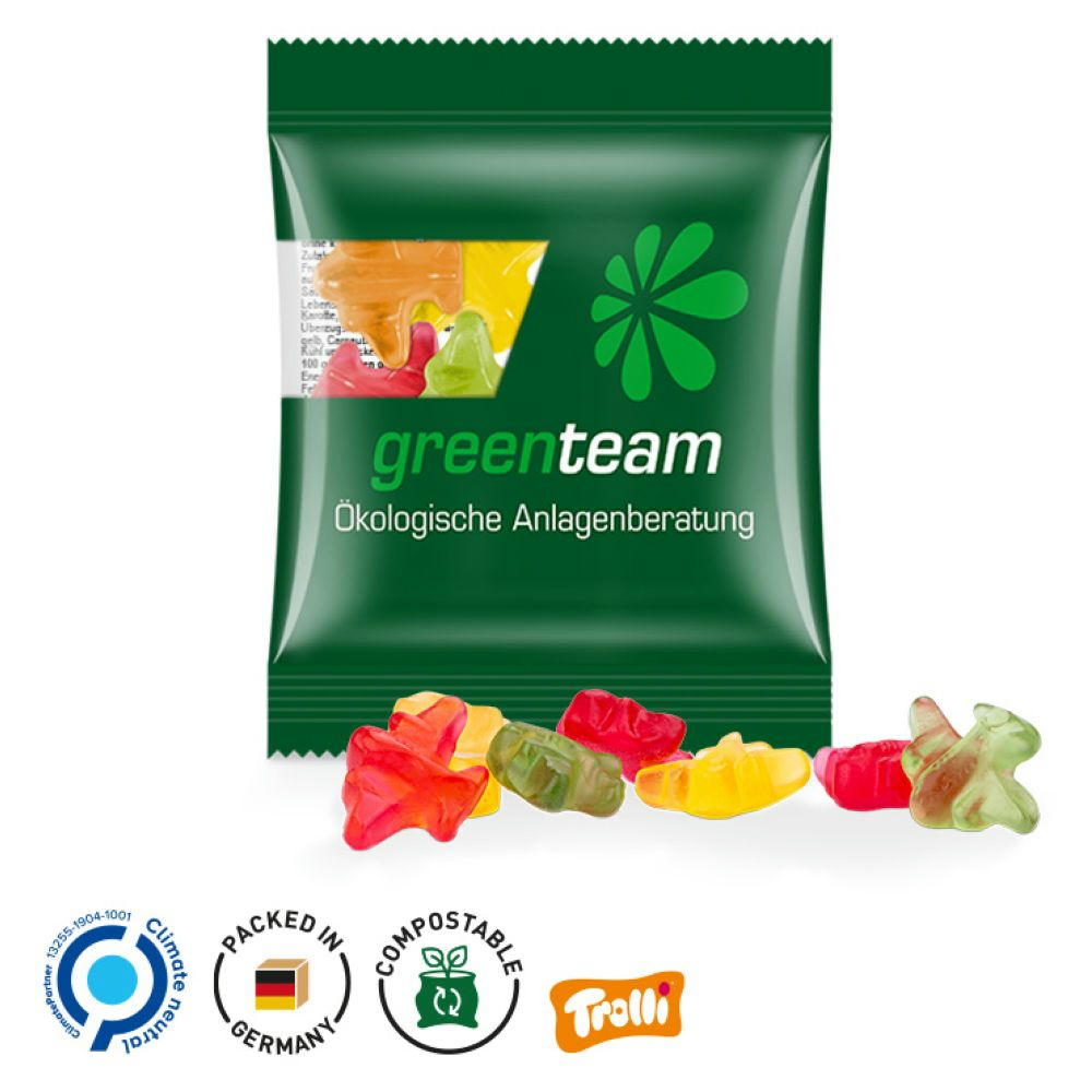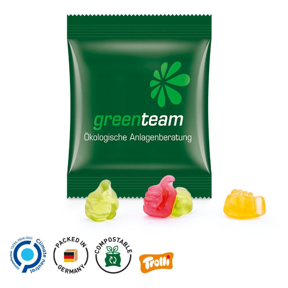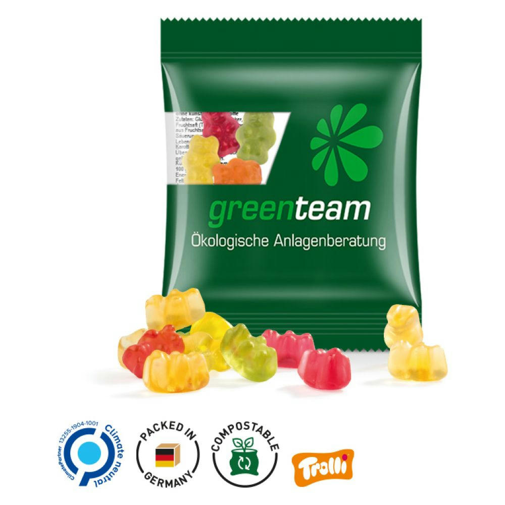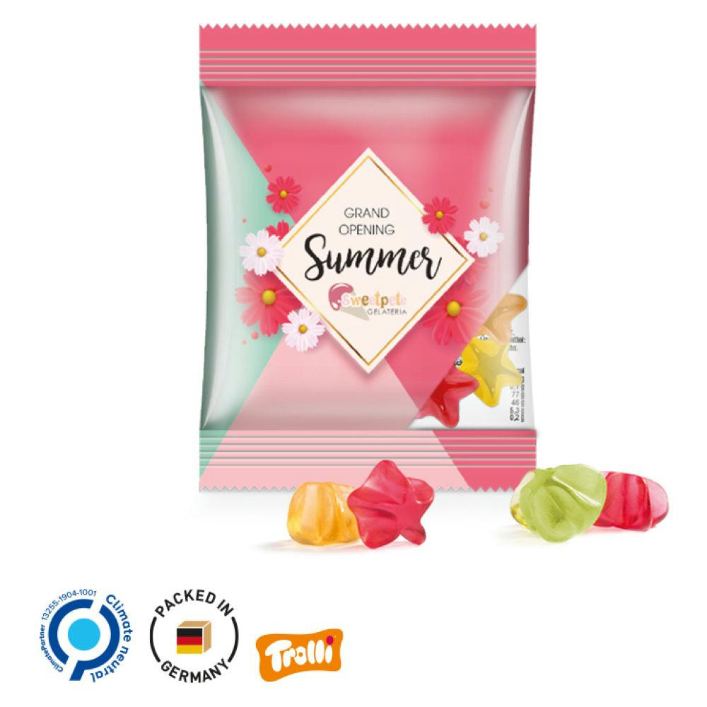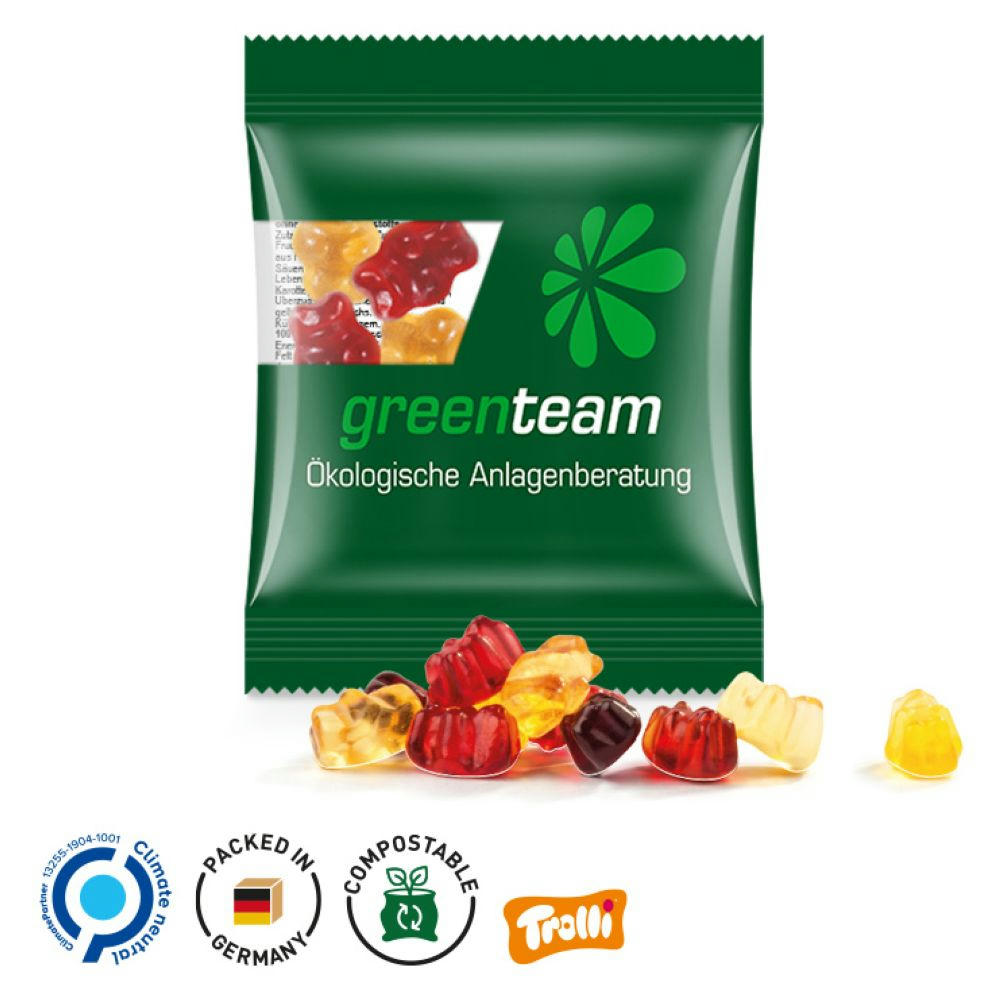 Trolli vegane Gummibärchen in Tüte aus transparenter Folie, kompostierbar, individuell bedruckt. Inhalt: Trolli vegane Gummibärchen mit 14 % Fruchtsaftanteil, bunt gemischt, 12 g