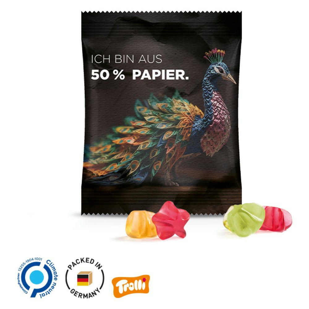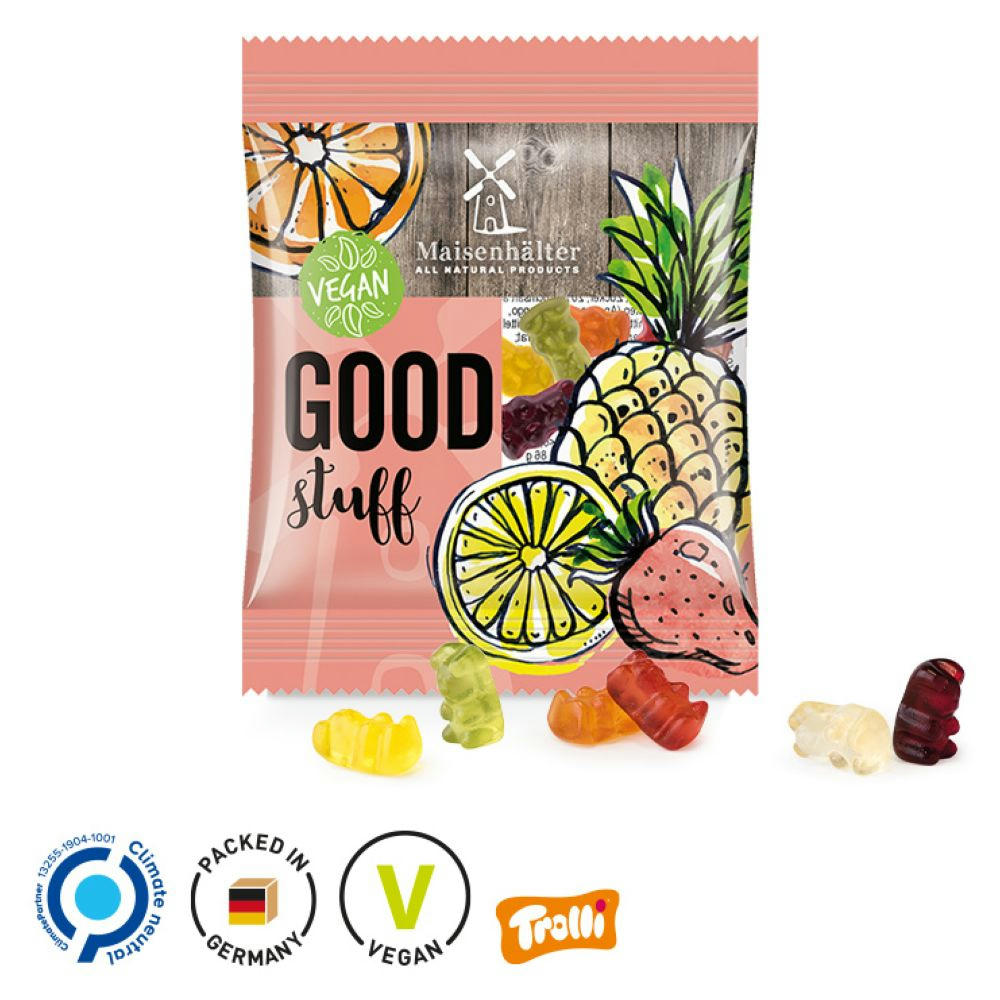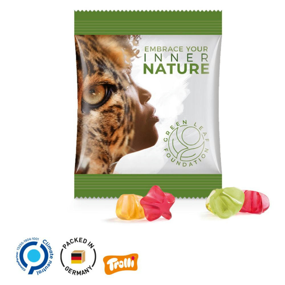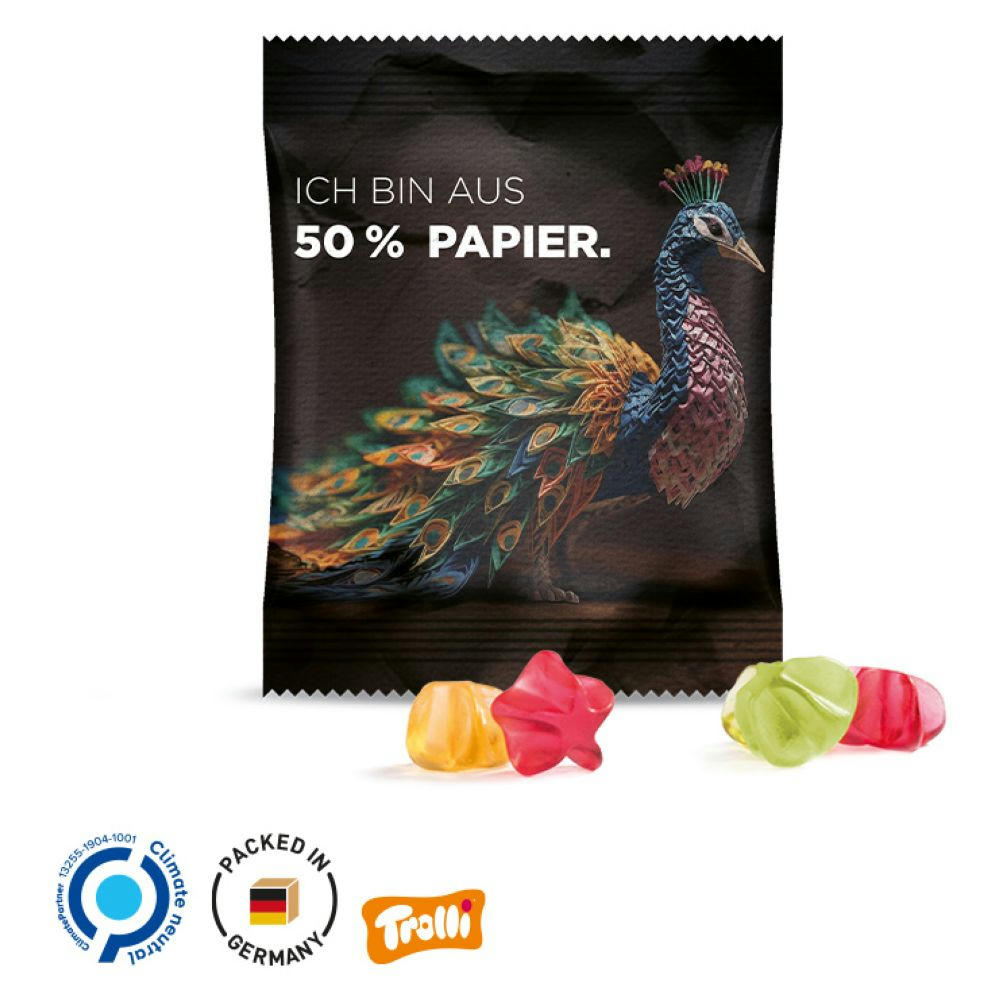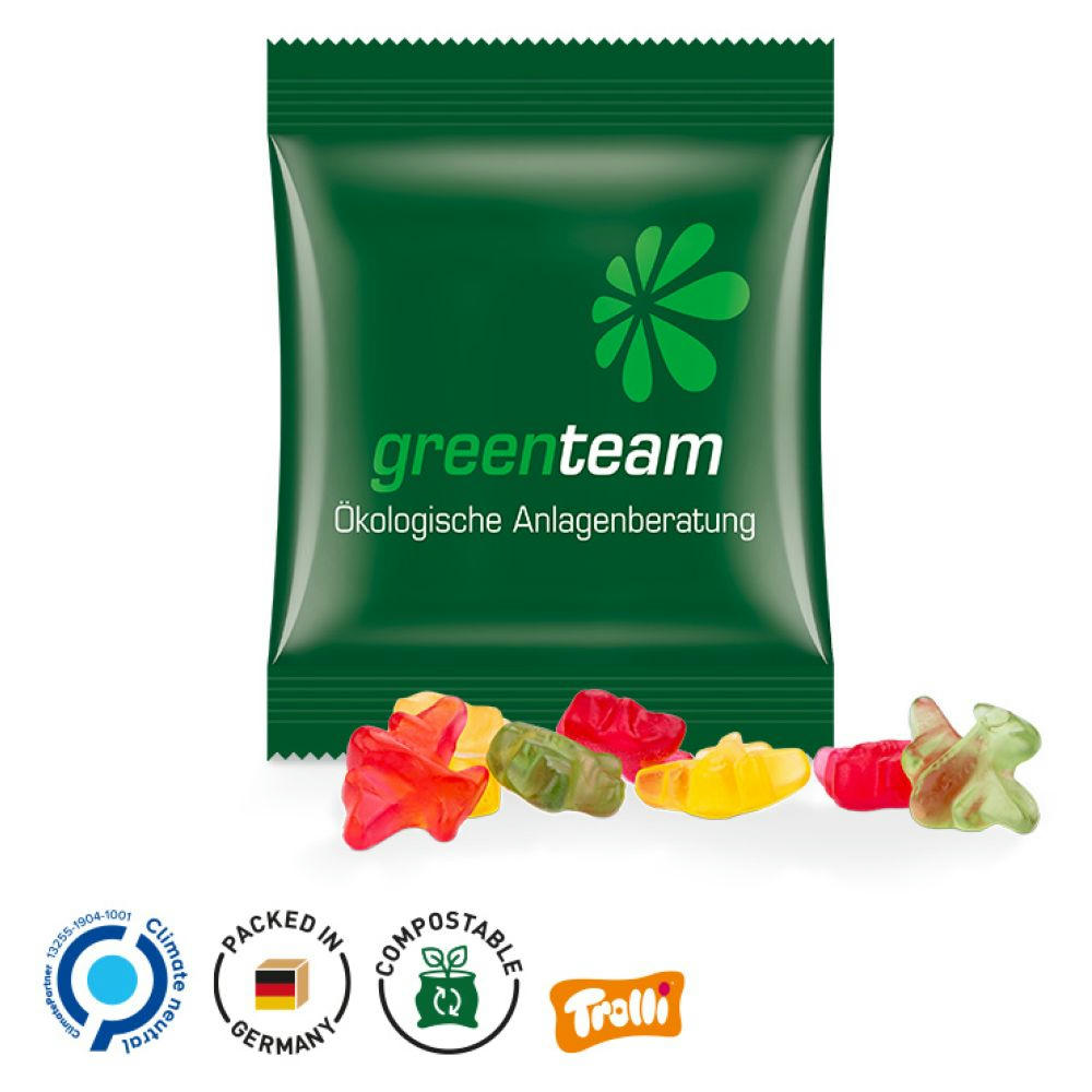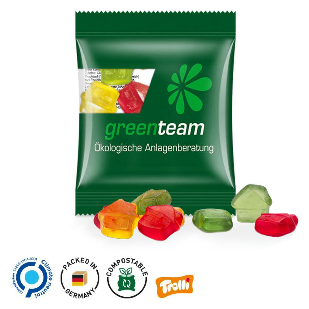 Trolli vegane Gummibärchen in Tüte aus transparenter Folie, kompostierbar, individuell bedruckt. Inhalt: Trolli vegane Gummibärchen mit 14 % Fruchtsaftanteil, bunt gemischt, 12 g