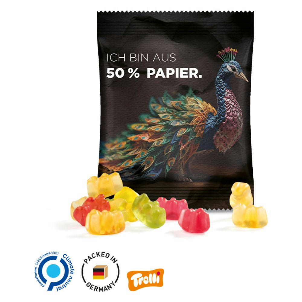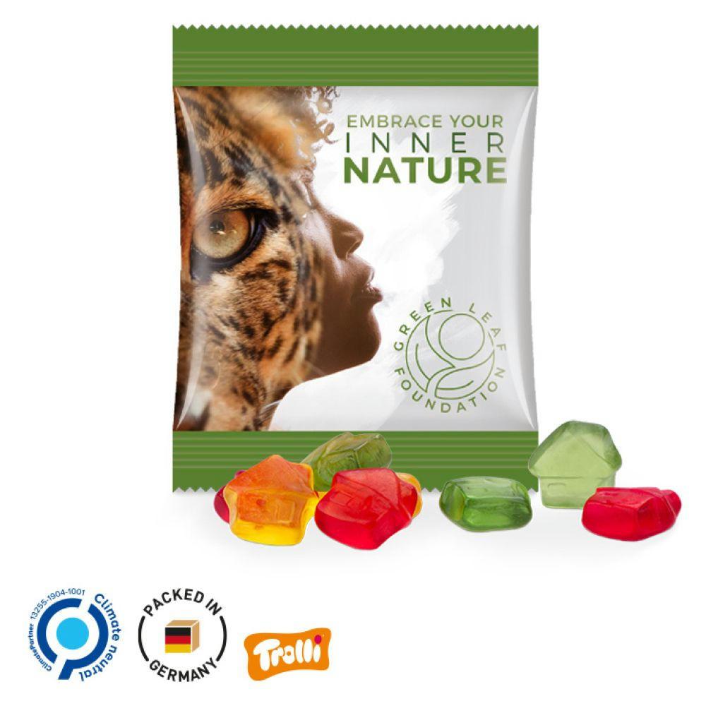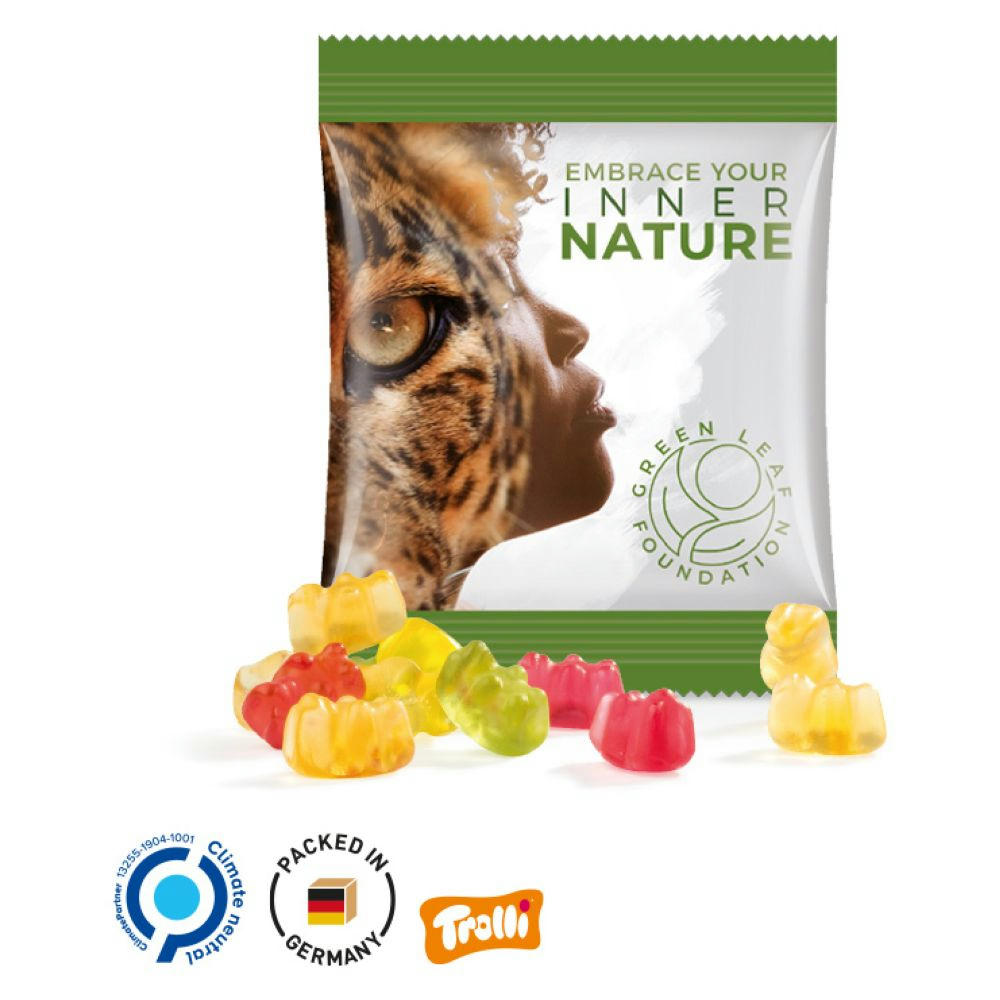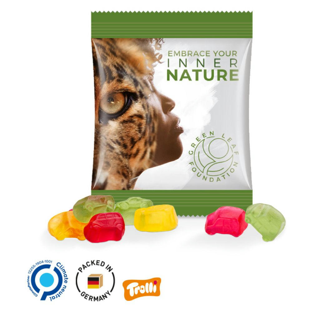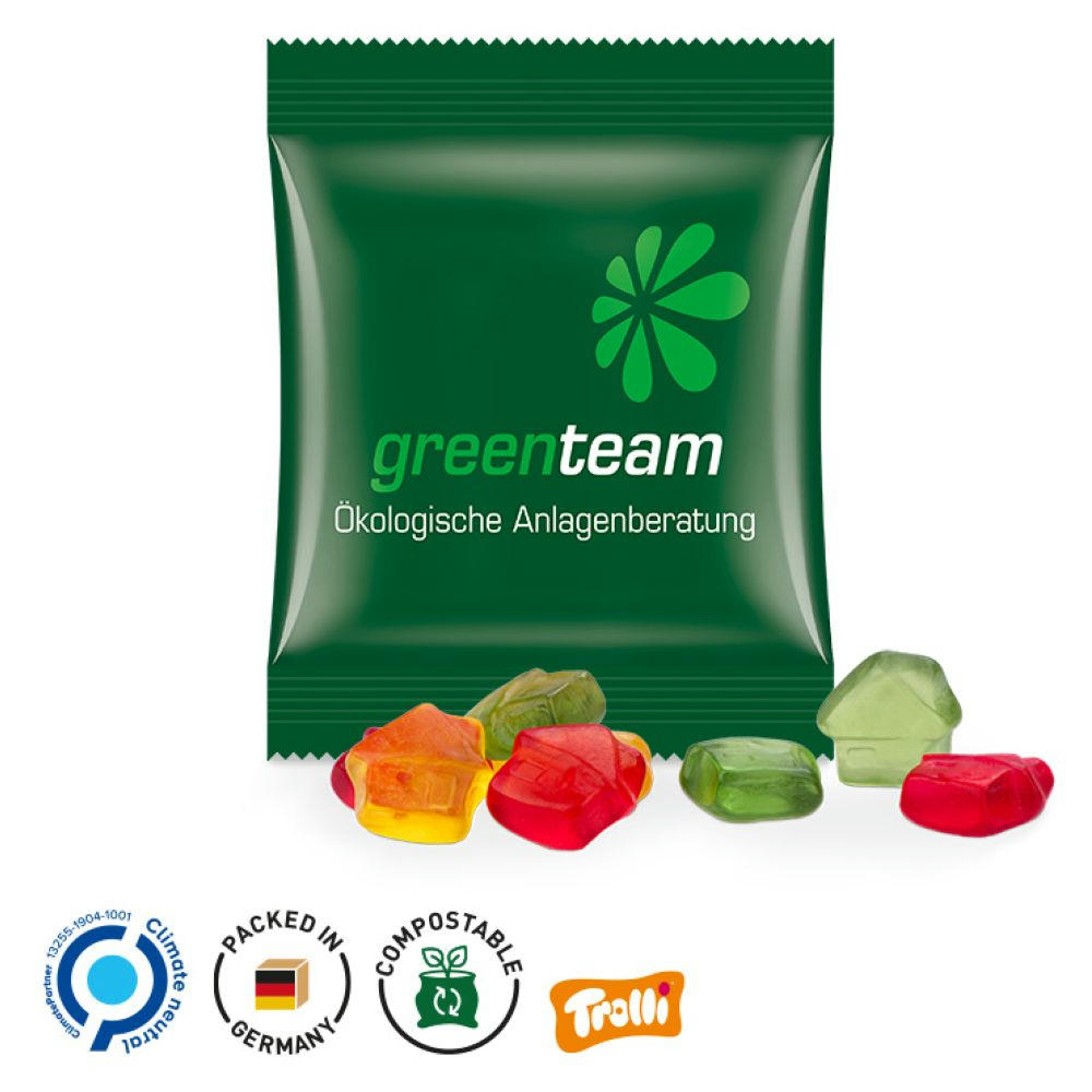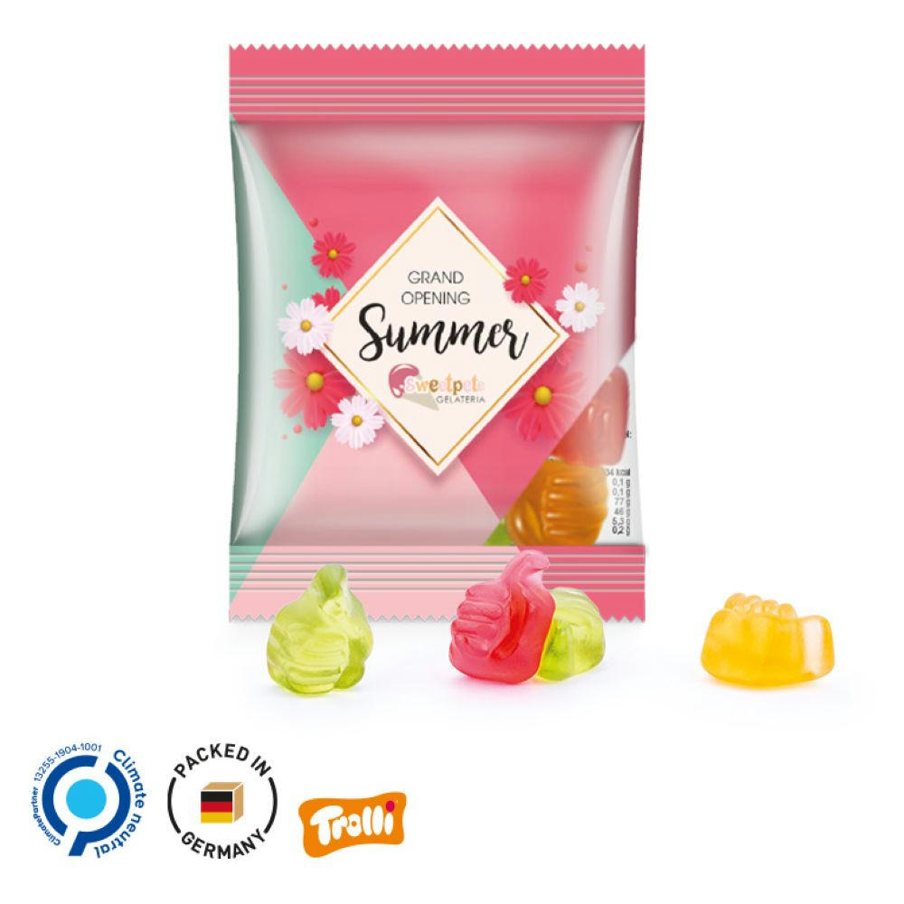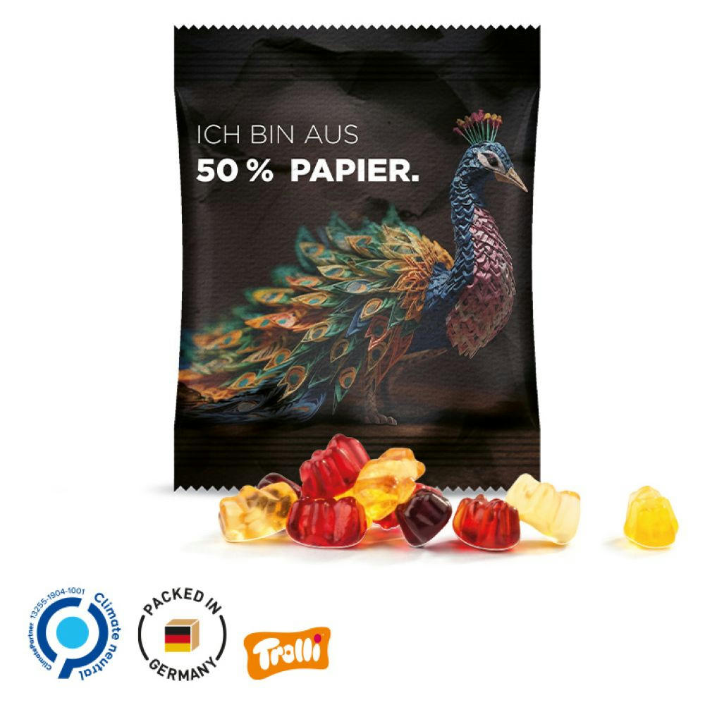 Trolli vegane Gummibärchen in Tüte aus transparenter Folie, kompostierbar, individuell bedruckt. Inhalt: Trolli vegane Gummibärchen mit 14 % Fruchtsaftanteil, bunt gemischt, 12 g