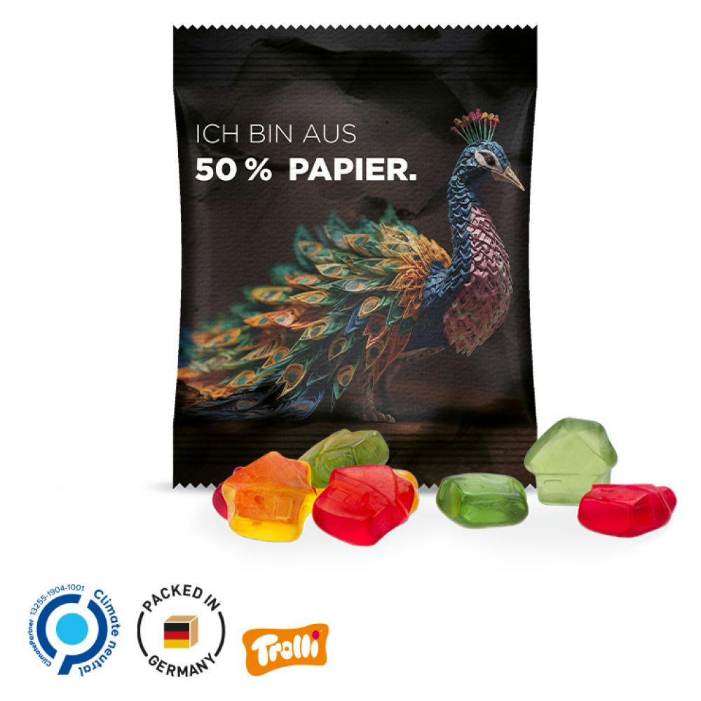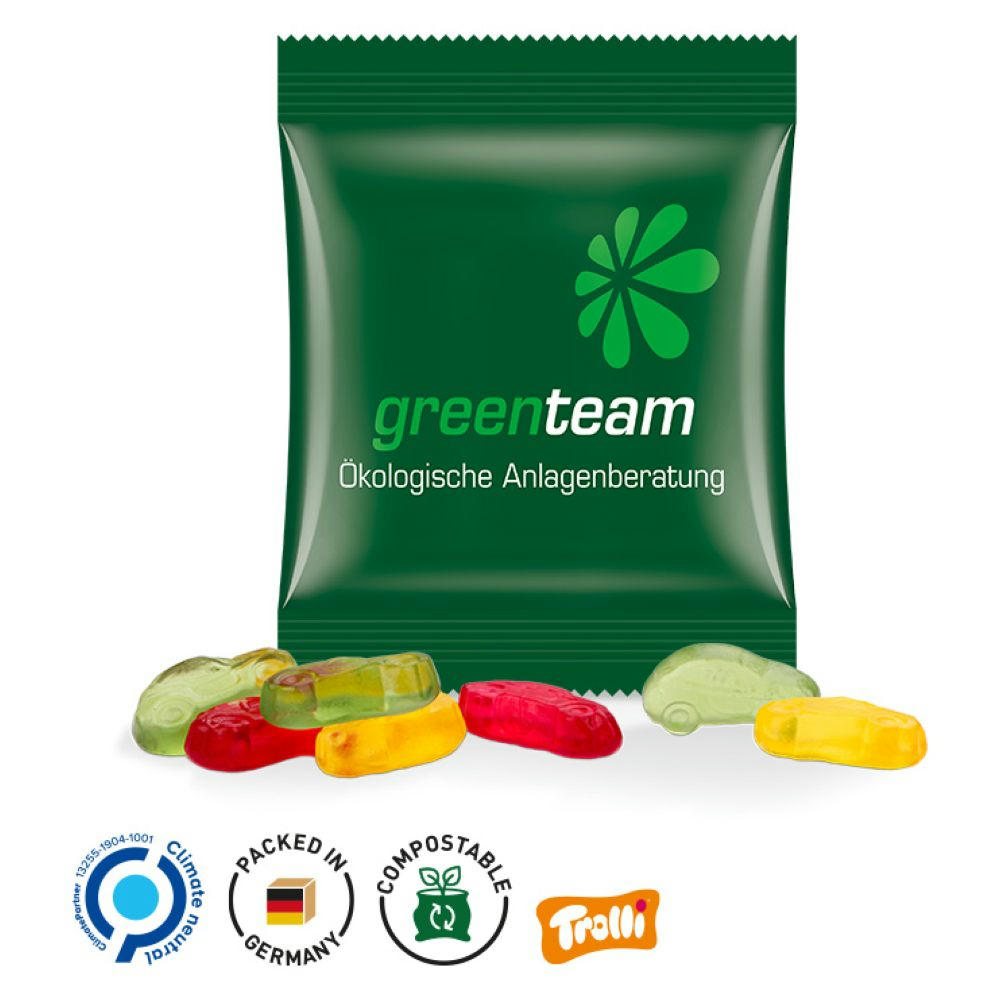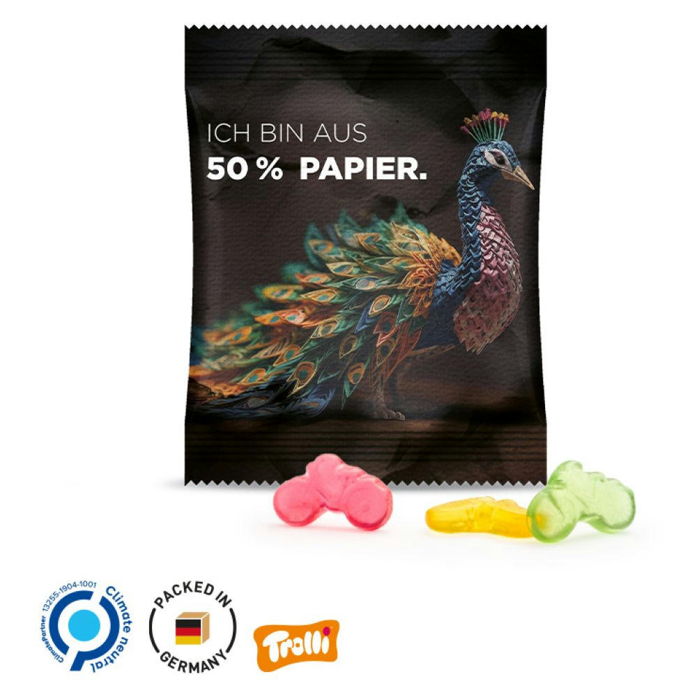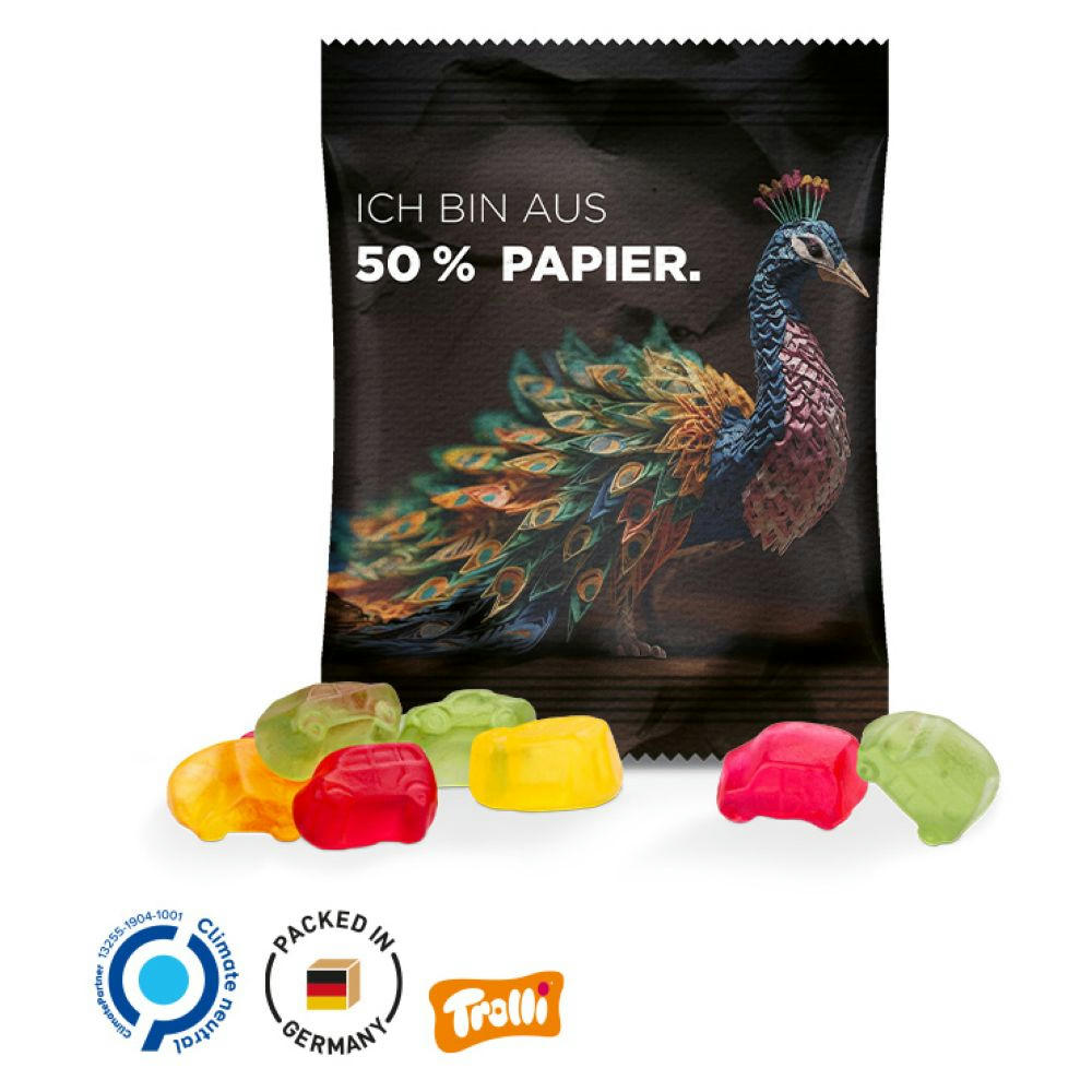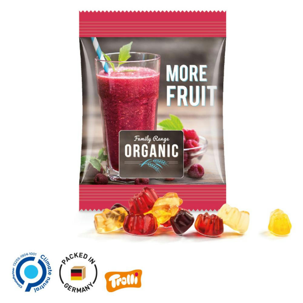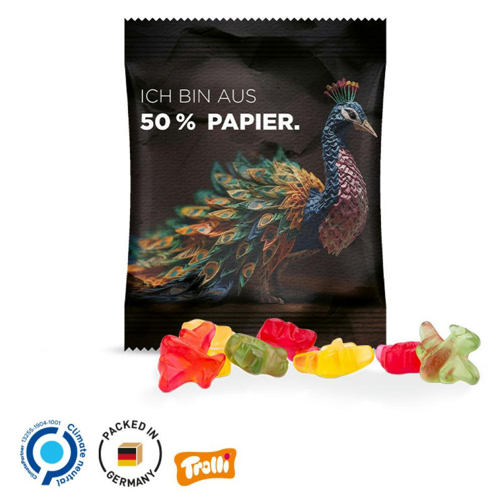 Trolli vegane Gummibärchen in Tüte aus transparenter Folie, kompostierbar, individuell bedruckt. Inhalt: Trolli vegane Gummibärchen mit 14 % Fruchtsaftanteil, bunt gemischt, 12 g