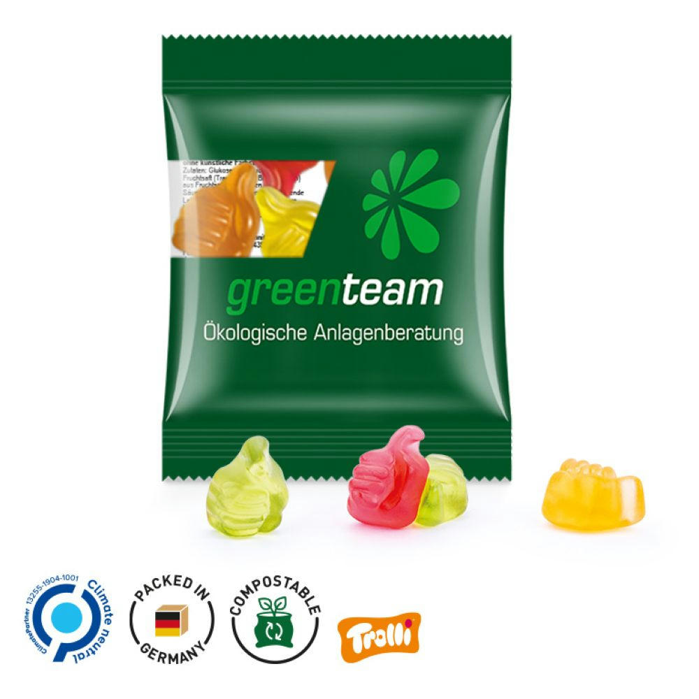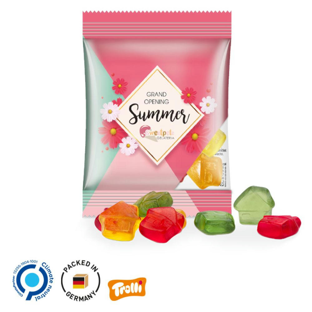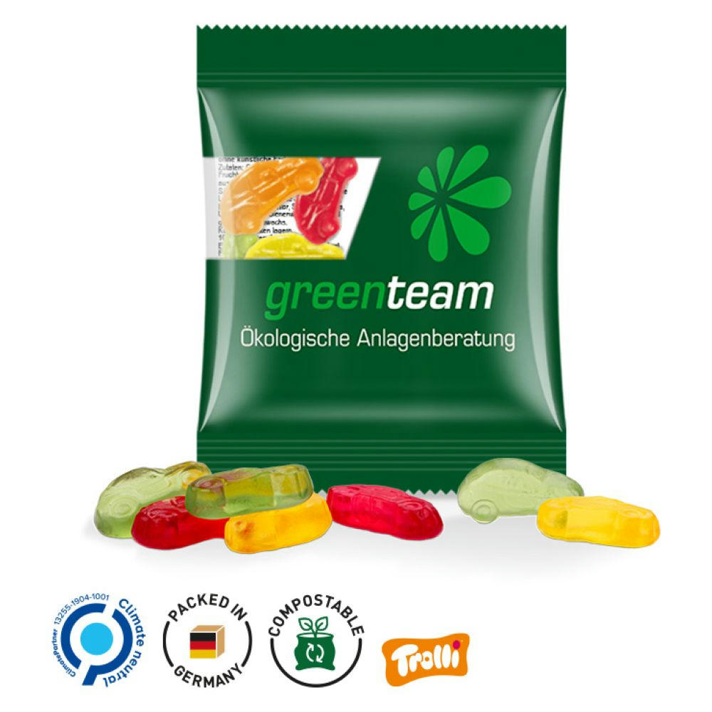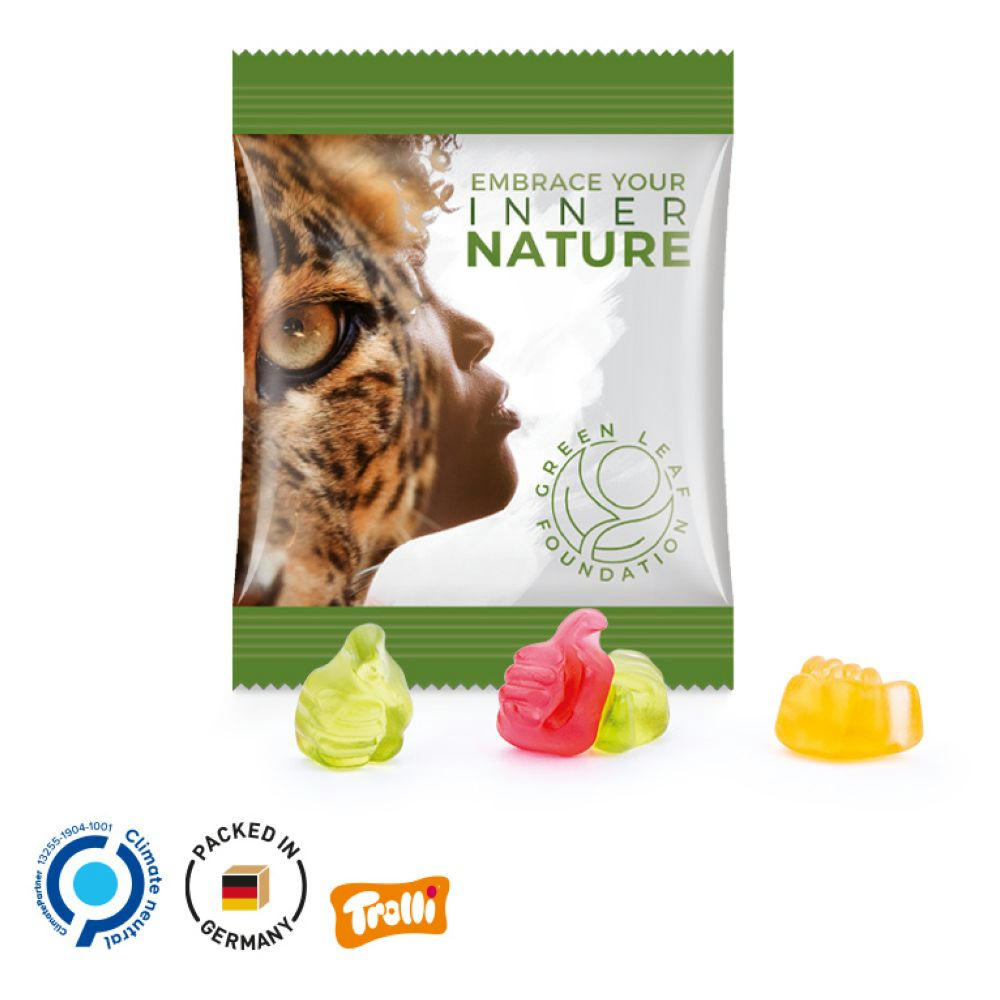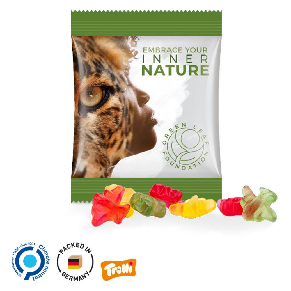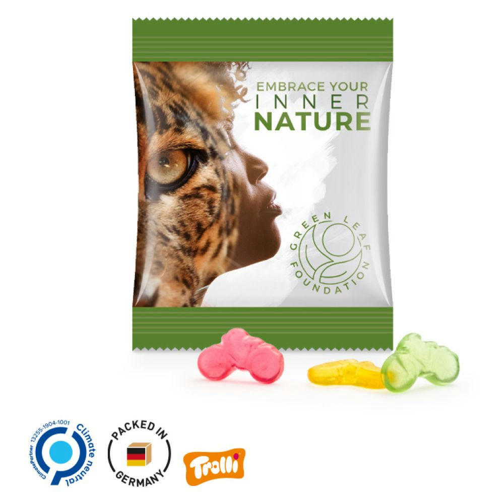 Trolli vegane Gummibärchen in Tüte aus transparenter Folie, kompostierbar, individuell bedruckt. Inhalt: Trolli vegane Gummibärchen mit 14 % Fruchtsaftanteil, bunt gemischt, 12 g
