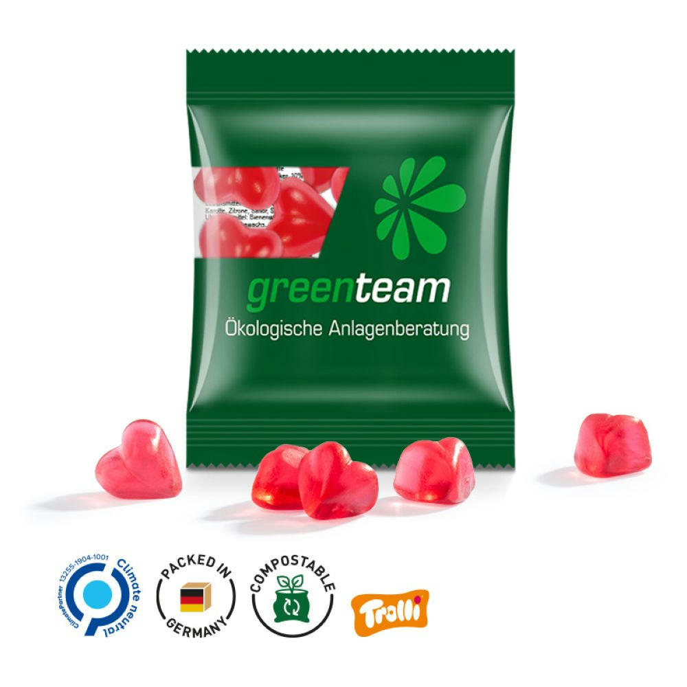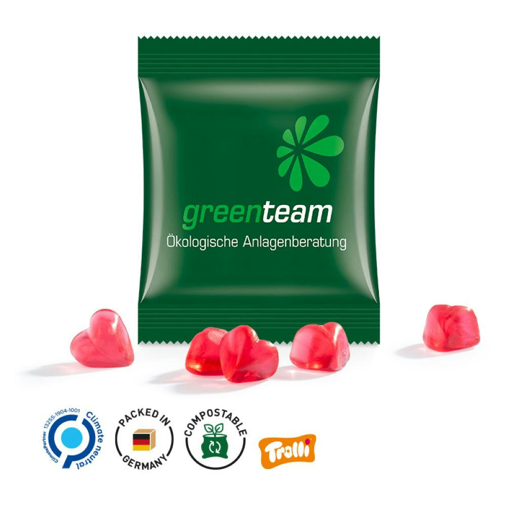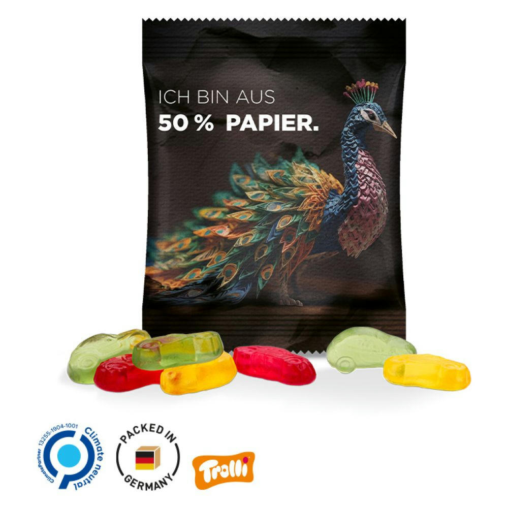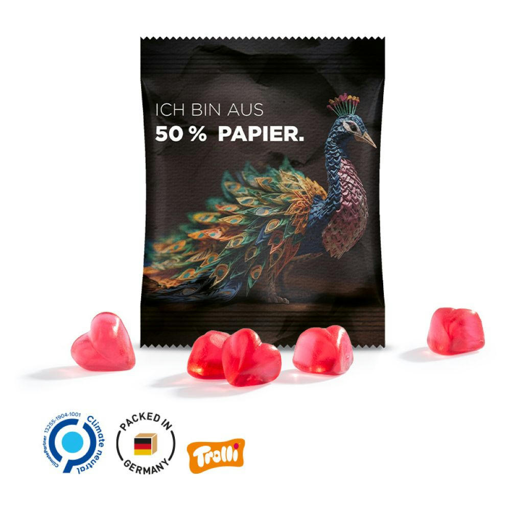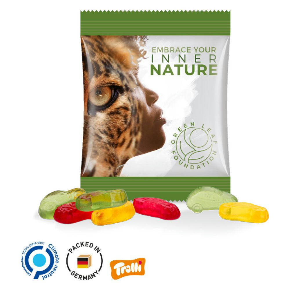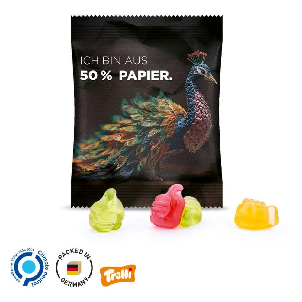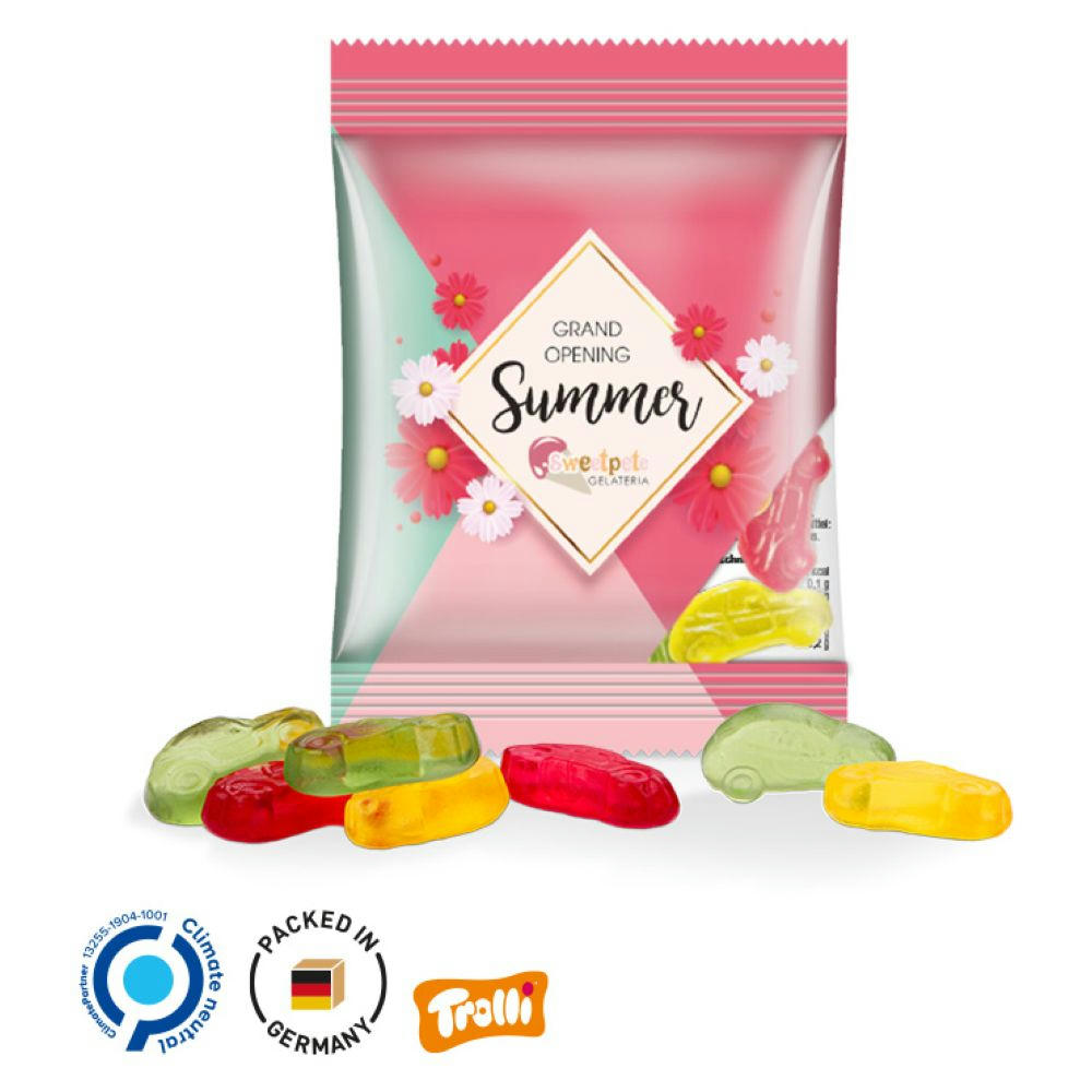 Trolli vegane Gummibärchen in Tüte aus transparenter Folie, kompostierbar, individuell bedruckt. Inhalt: Trolli vegane Gummibärchen mit 14 % Fruchtsaftanteil, bunt gemischt, 12 g