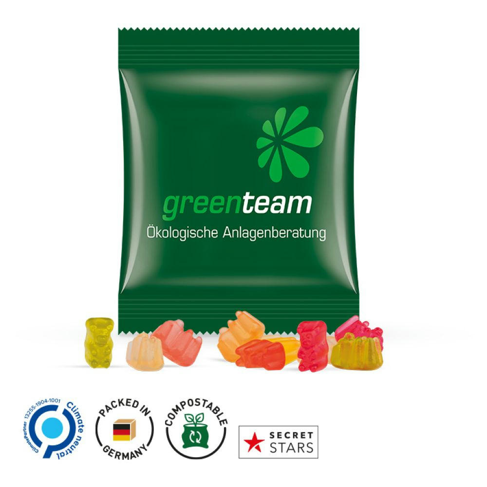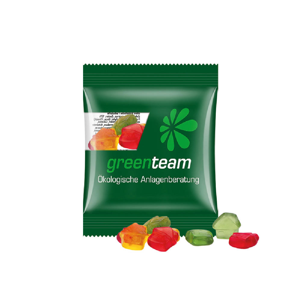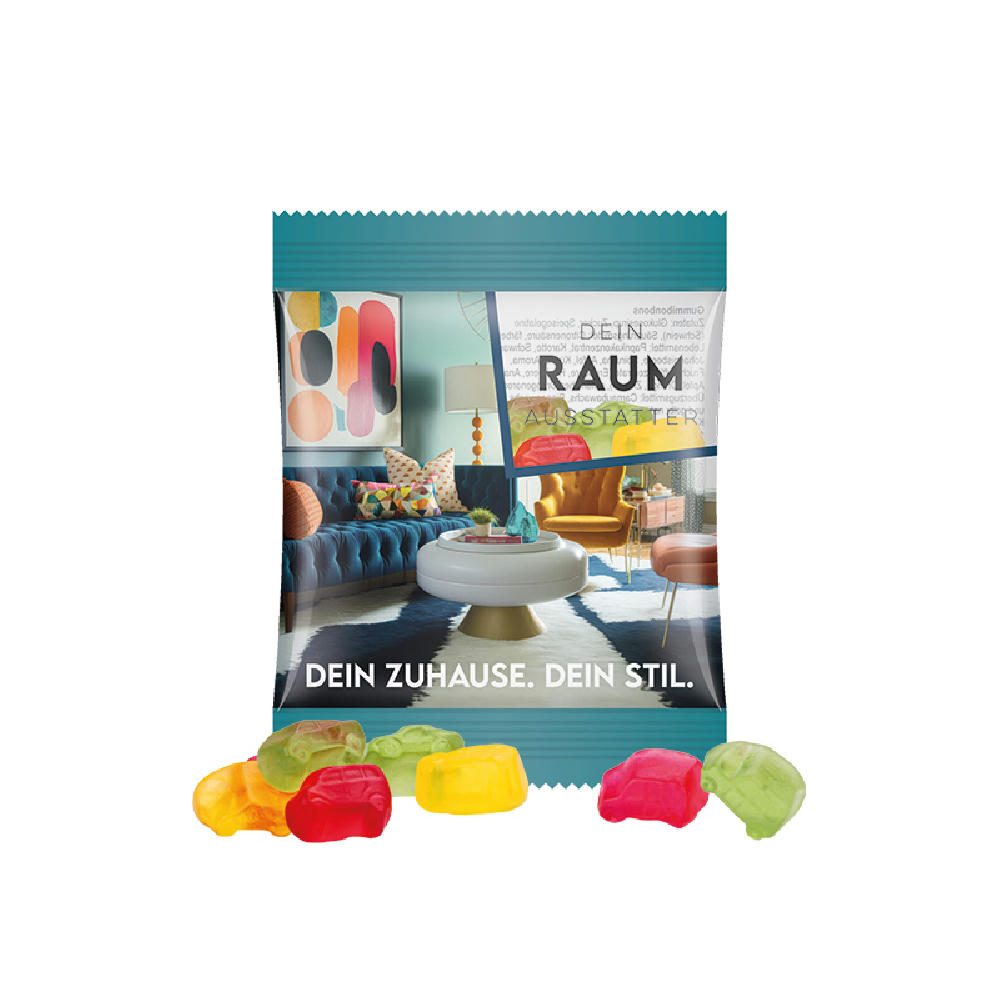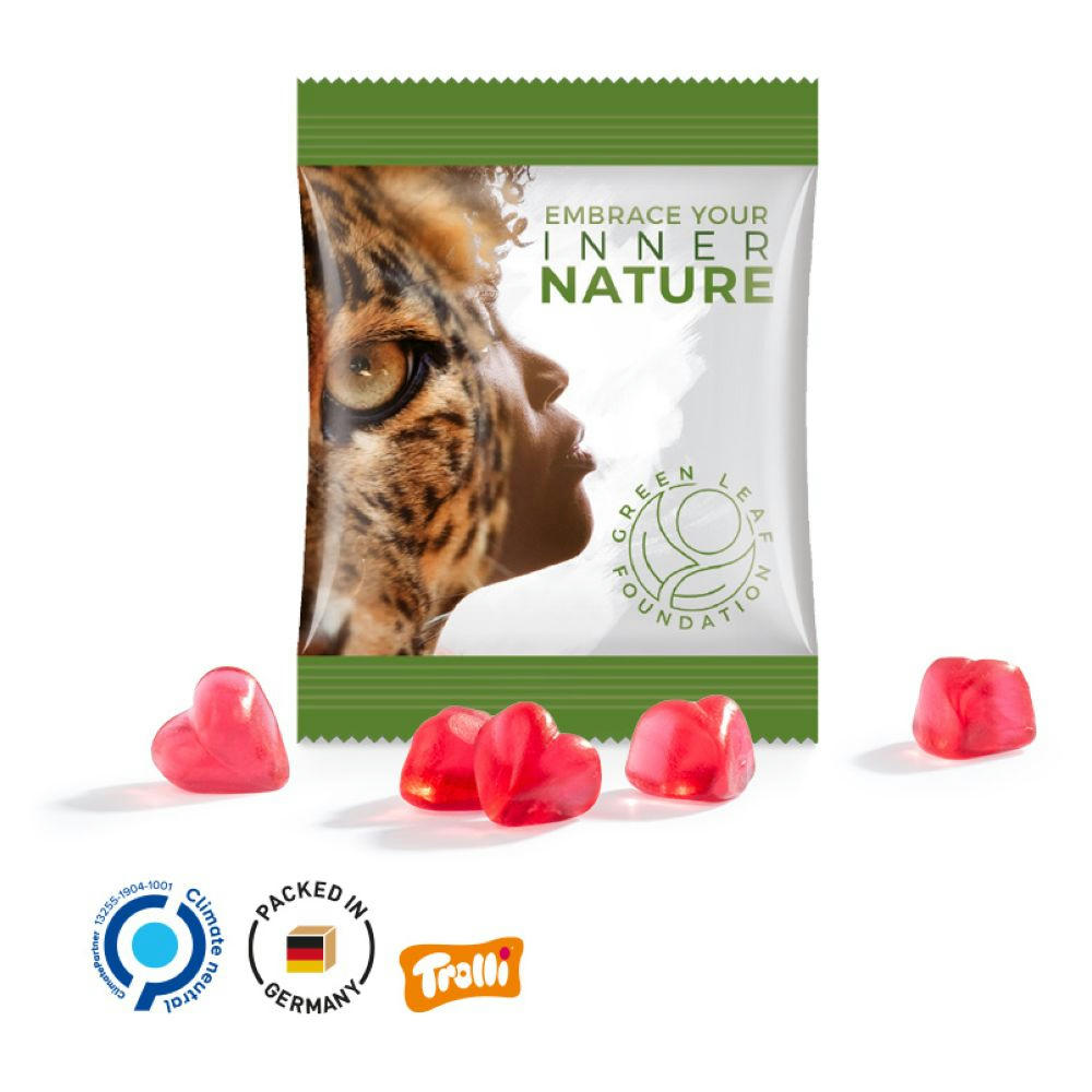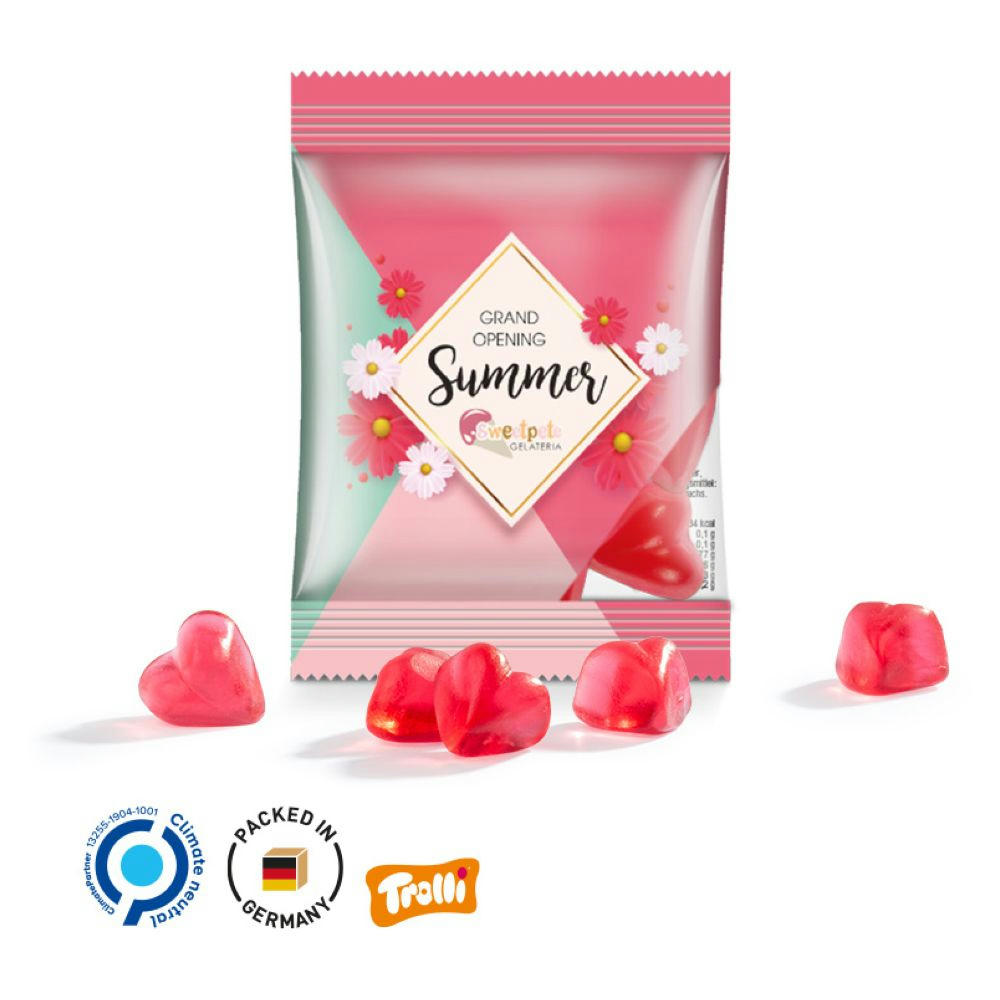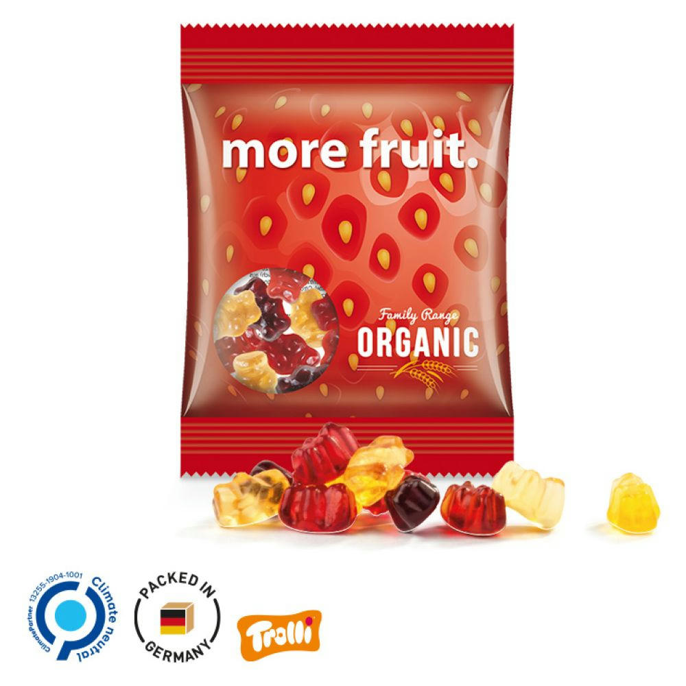 Trolli vegane Gummibärchen in Tüte aus transparenter Folie, kompostierbar, individuell bedruckt. Inhalt: Trolli vegane Gummibärchen mit 14 % Fruchtsaftanteil, bunt gemischt, 12 g
