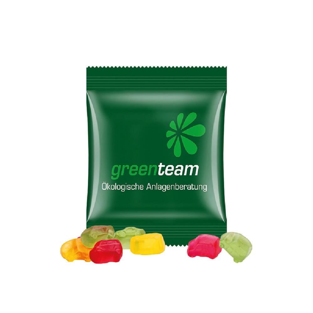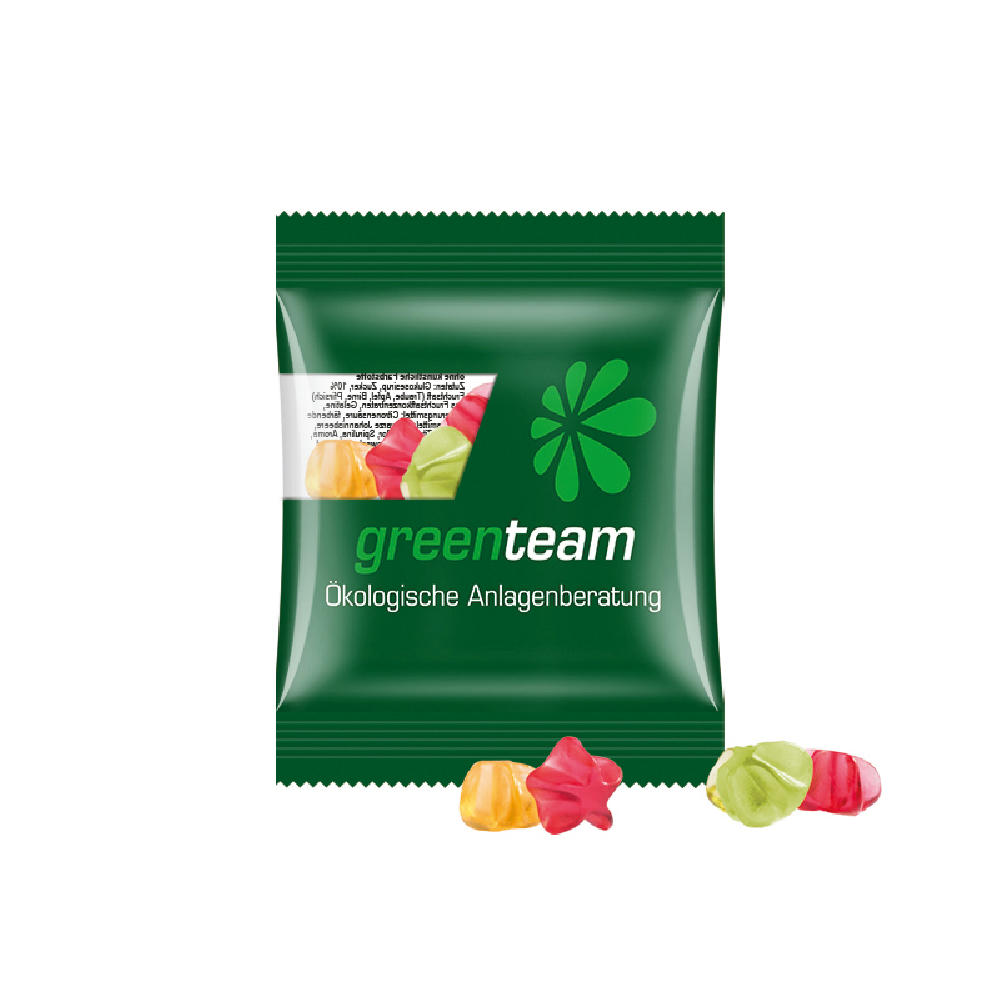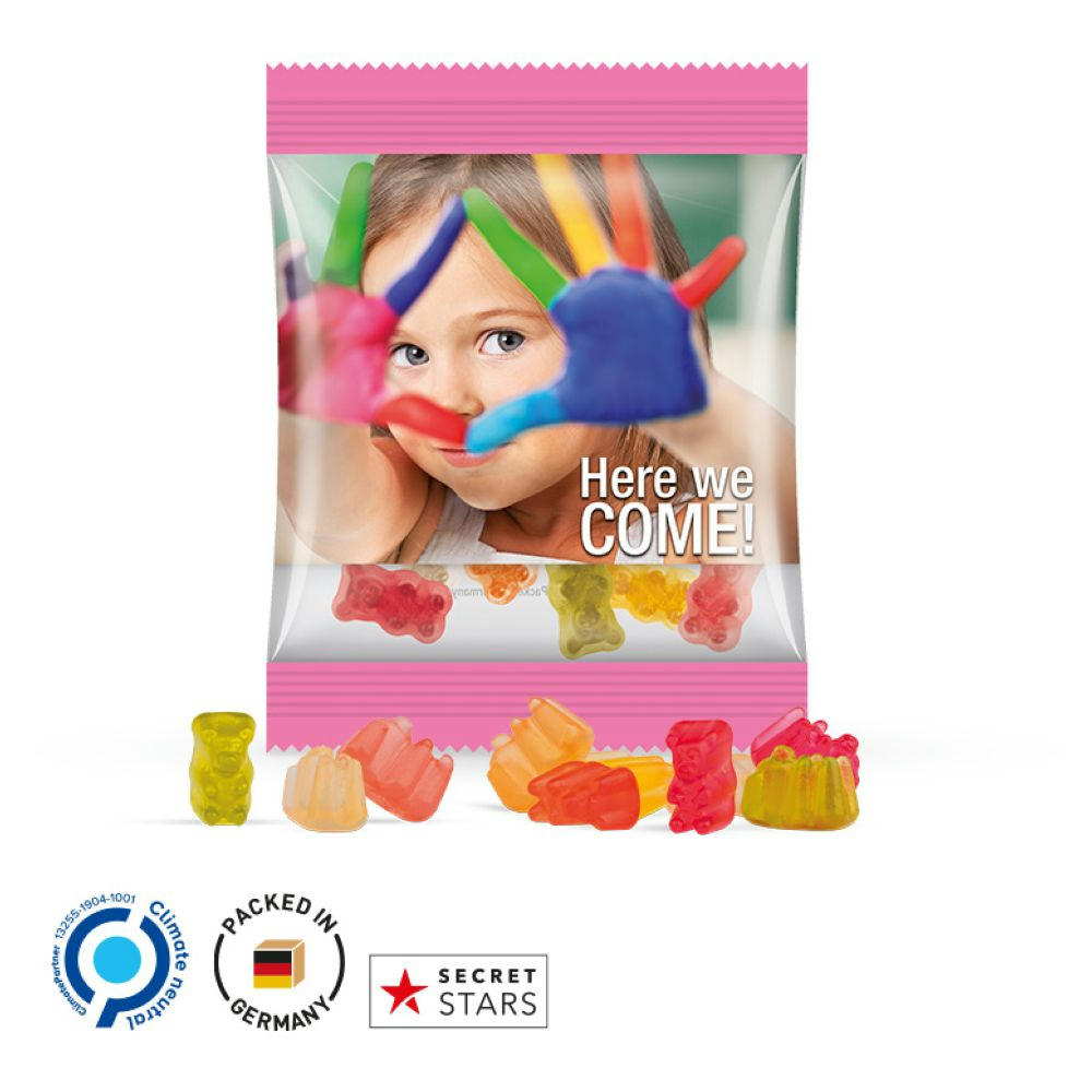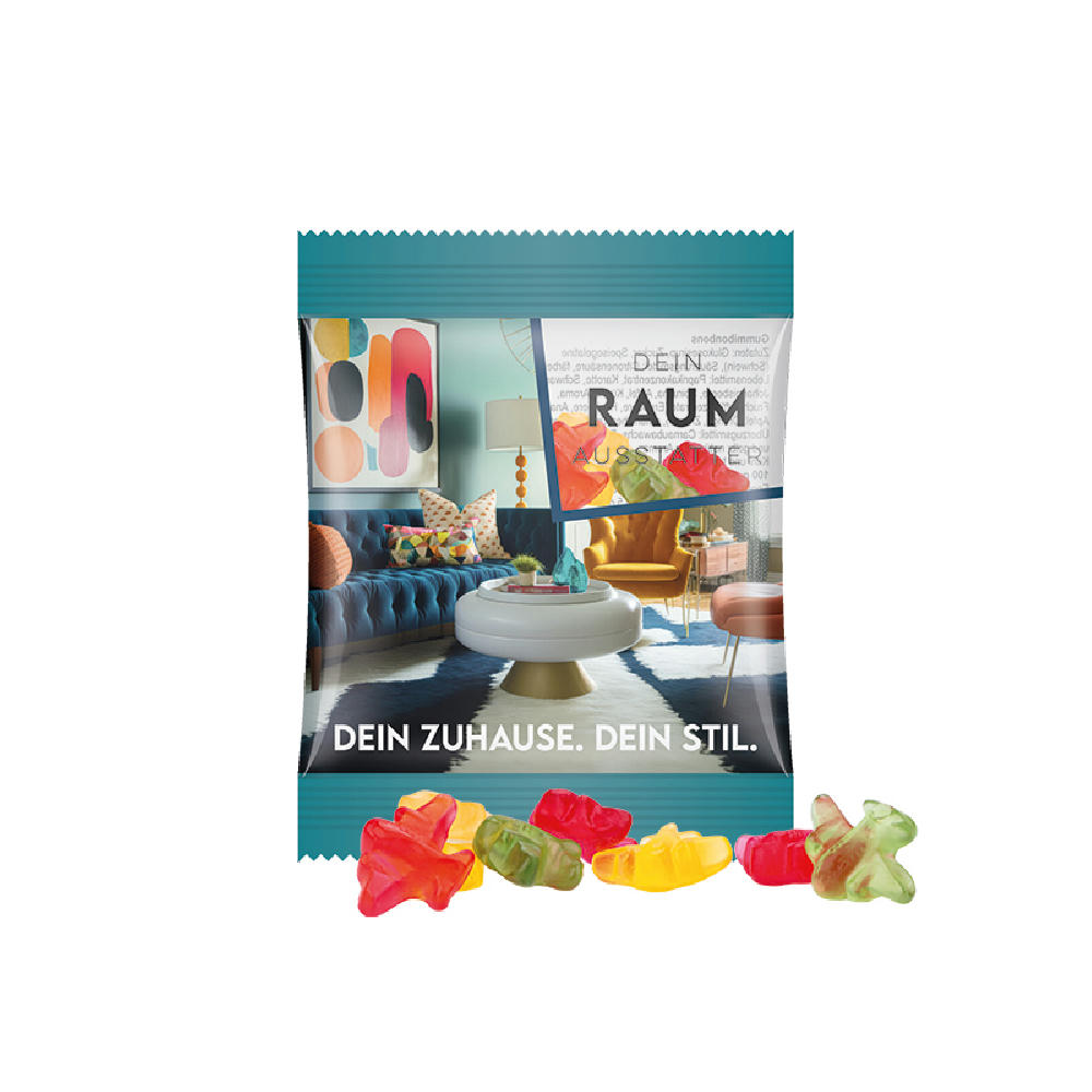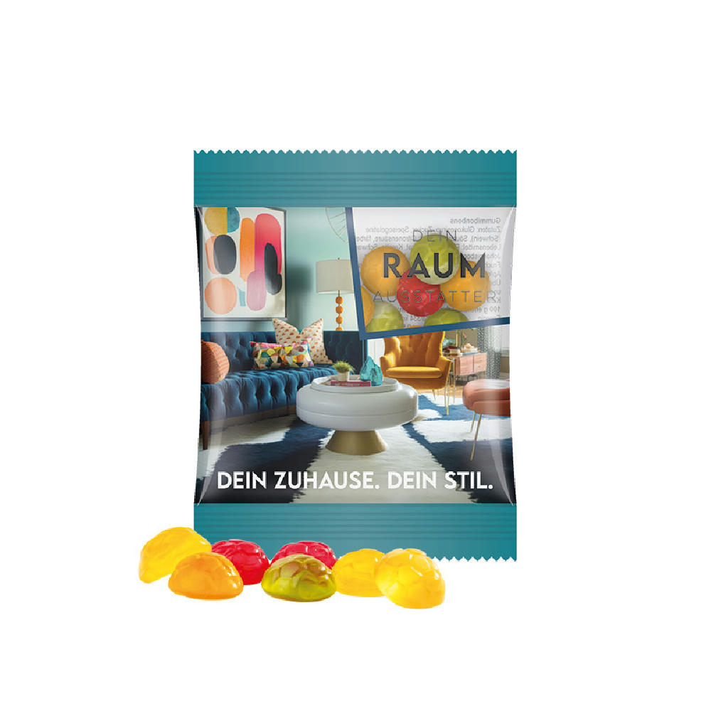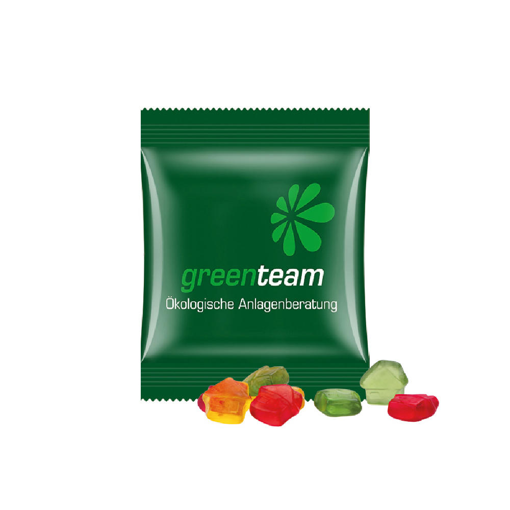 Trolli vegane Gummibärchen in Tüte aus transparenter Folie, kompostierbar, individuell bedruckt. Inhalt: Trolli vegane Gummibärchen mit 14 % Fruchtsaftanteil, bunt gemischt, 12 g