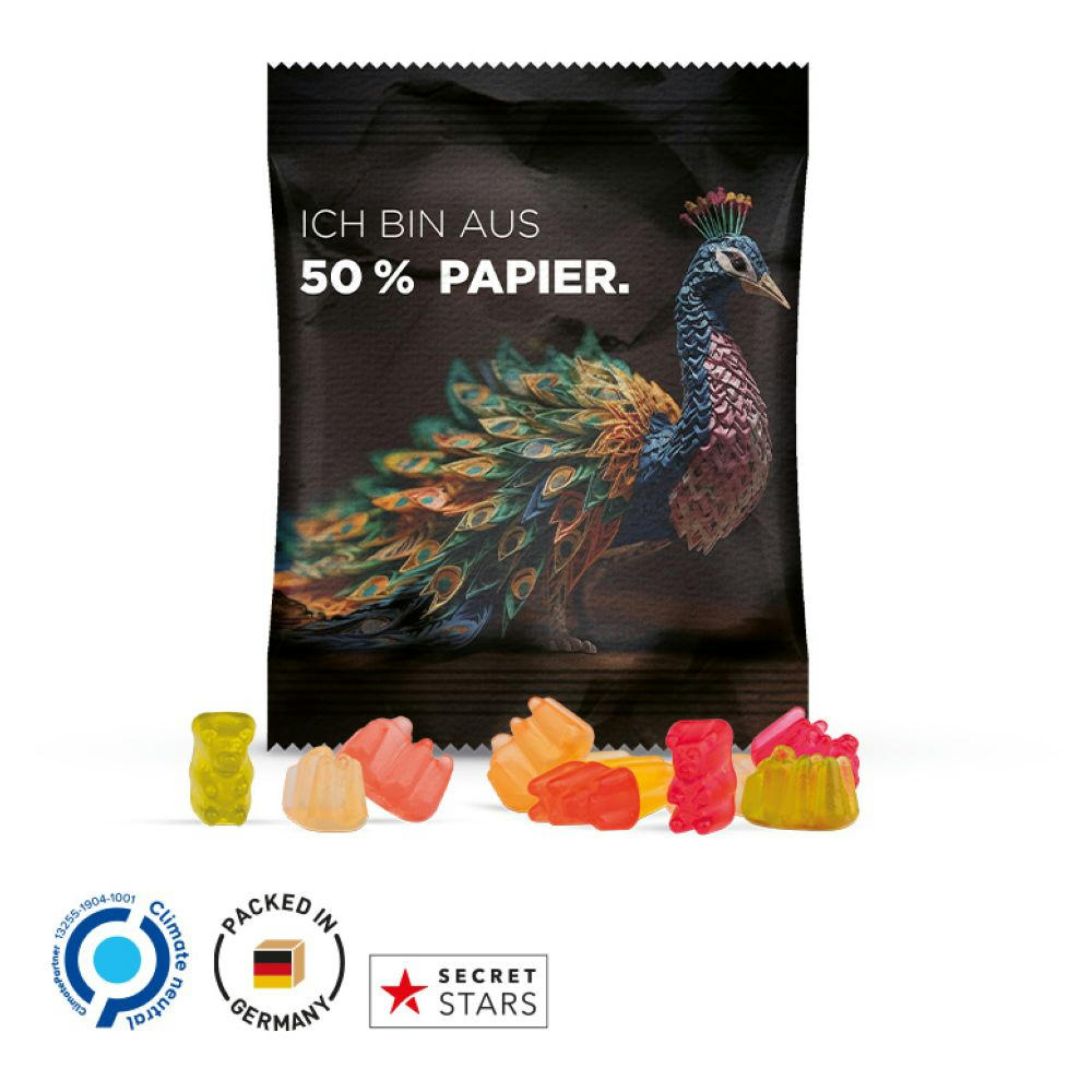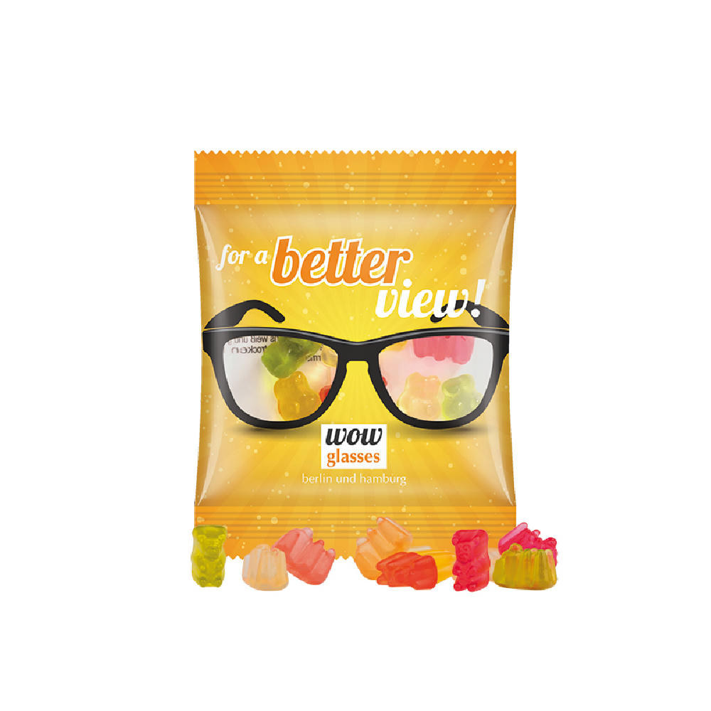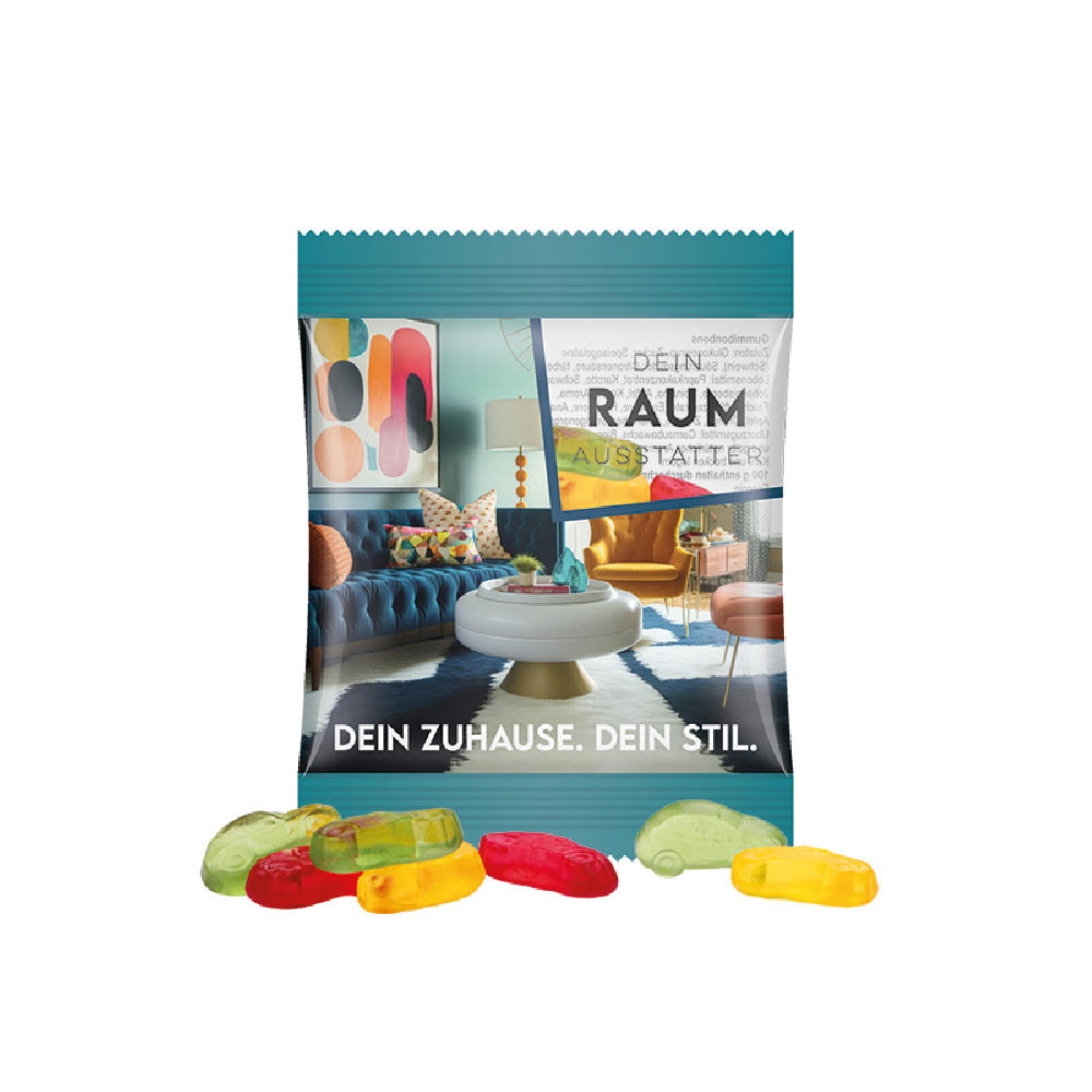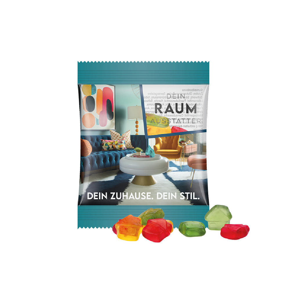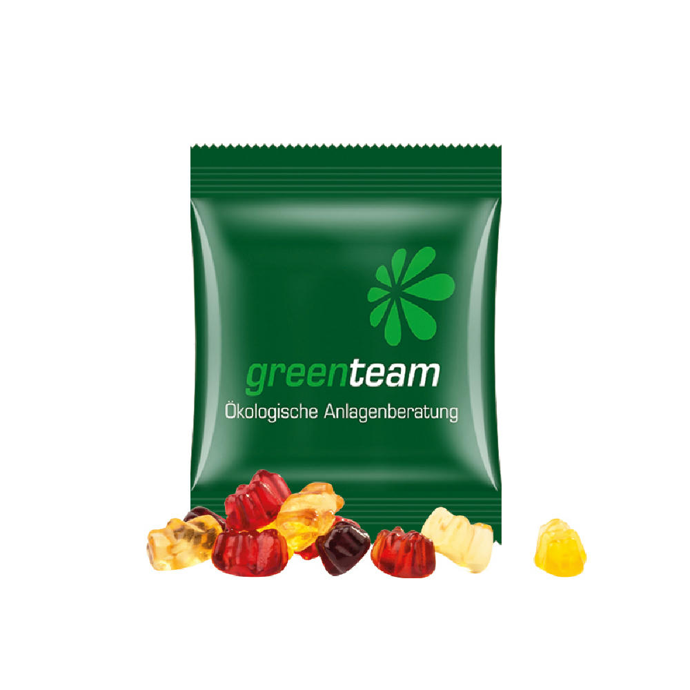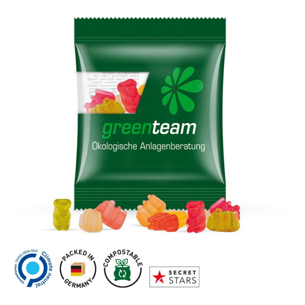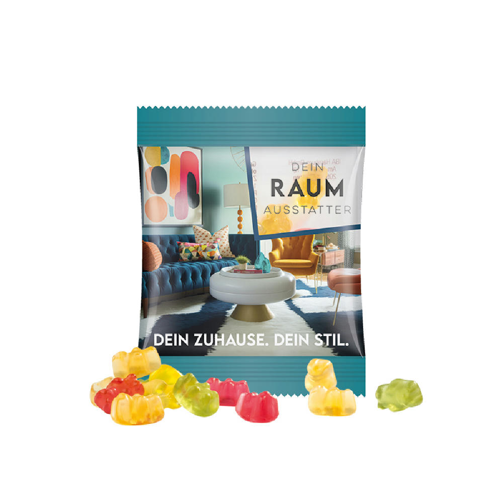 Trolli vegane Gummibärchen in Tüte aus transparenter Folie, kompostierbar, individuell bedruckt. Inhalt: Trolli vegane Gummibärchen mit 14 % Fruchtsaftanteil, bunt gemischt, 12 g