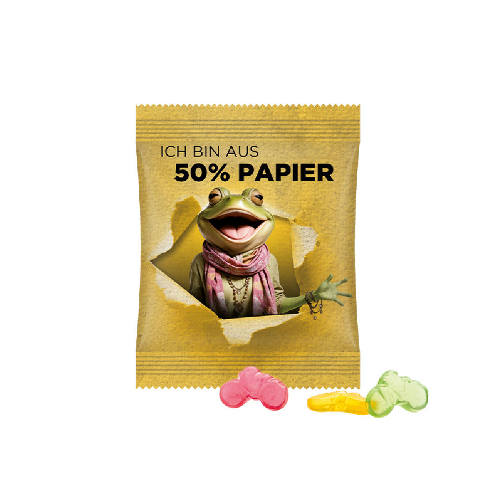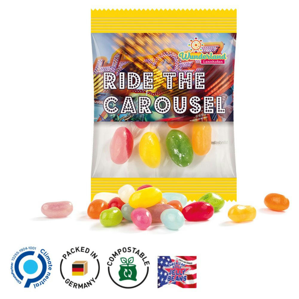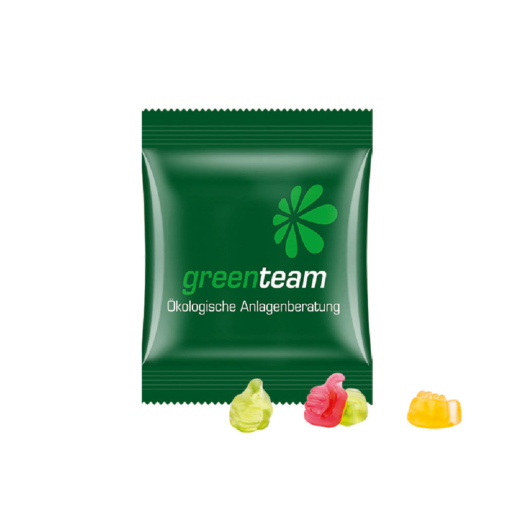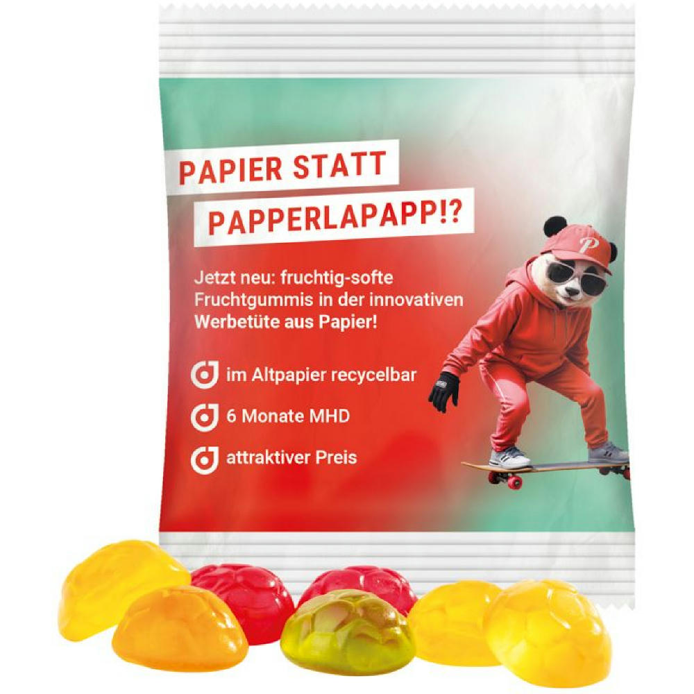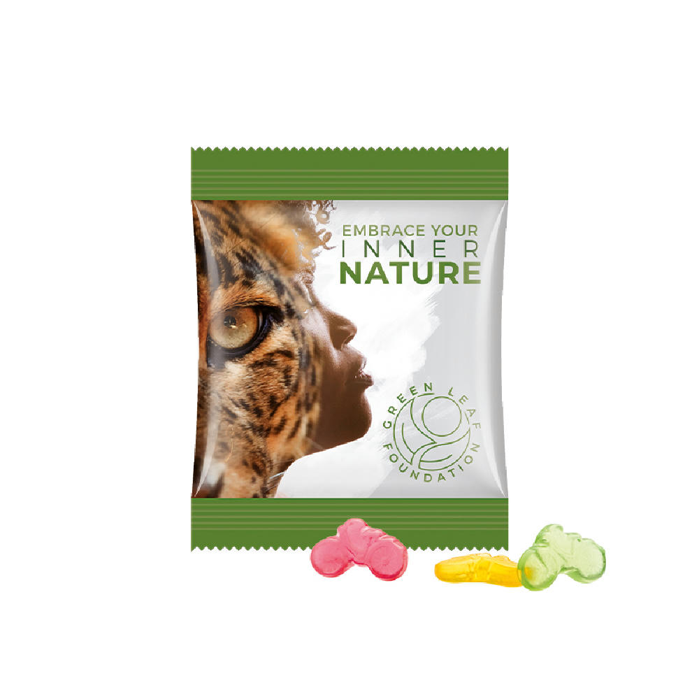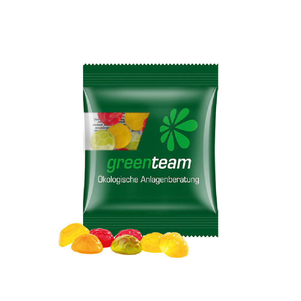 Trolli vegane Gummibärchen in Tüte aus transparenter Folie, kompostierbar, individuell bedruckt. Inhalt: Trolli vegane Gummibärchen mit 14 % Fruchtsaftanteil, bunt gemischt, 12 g