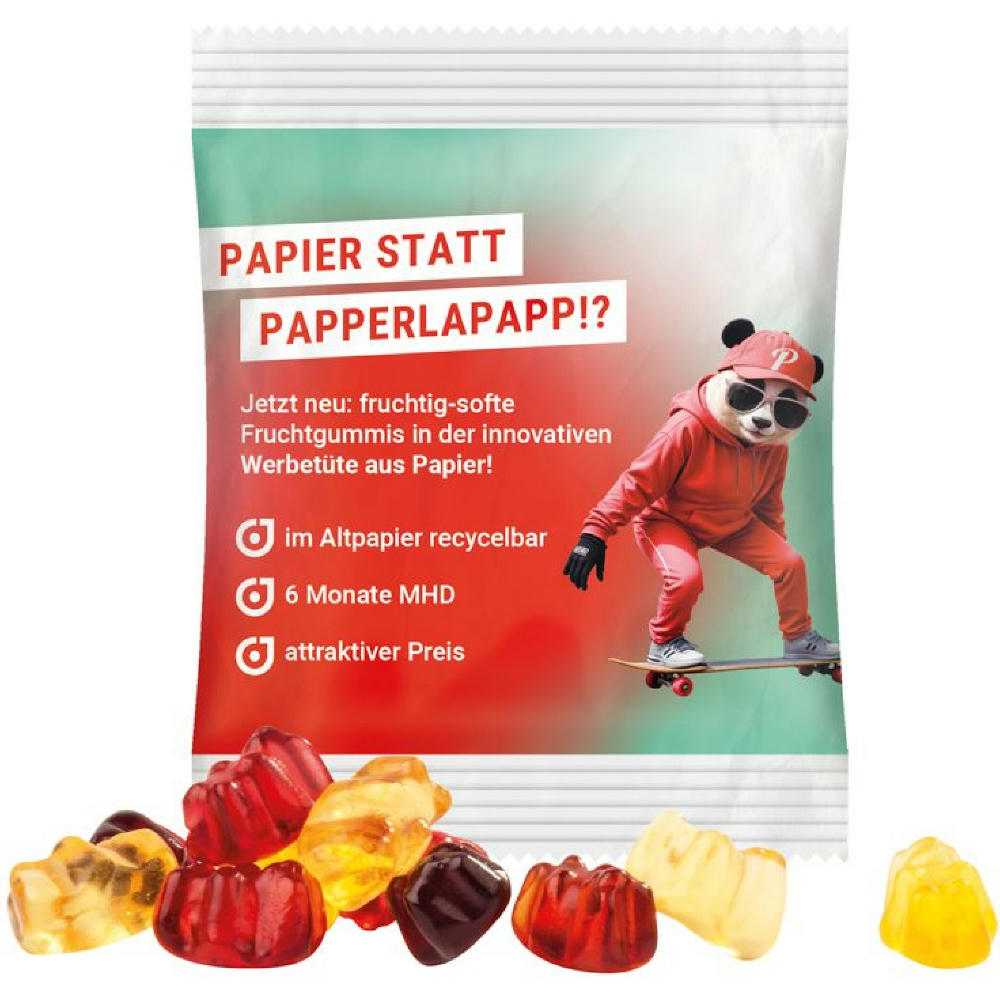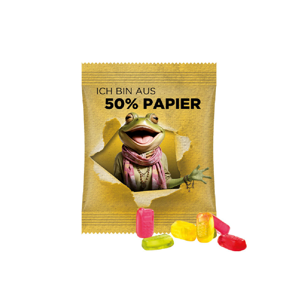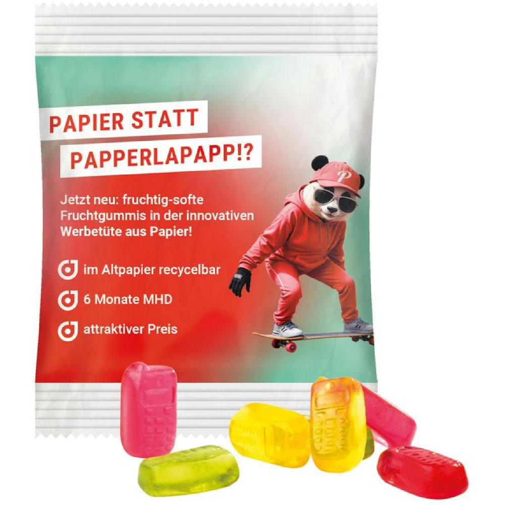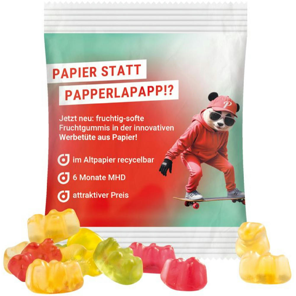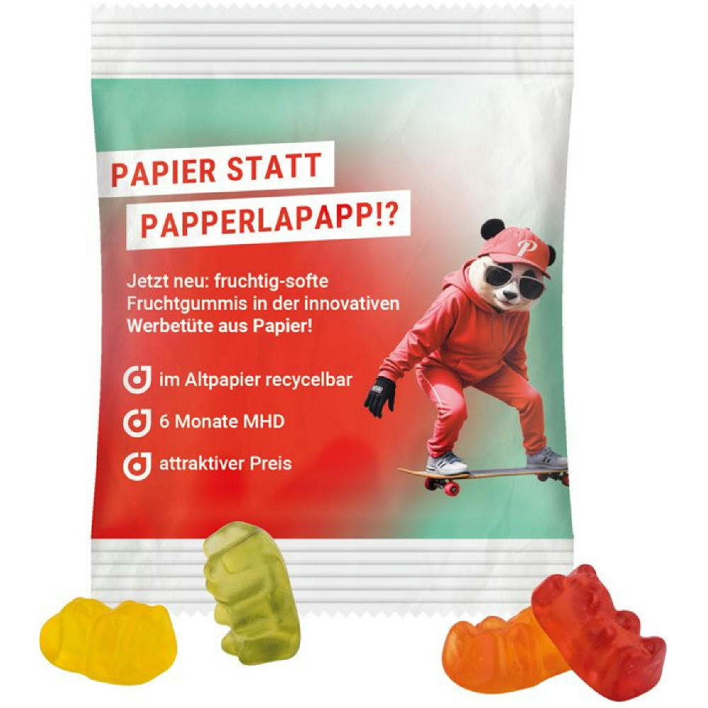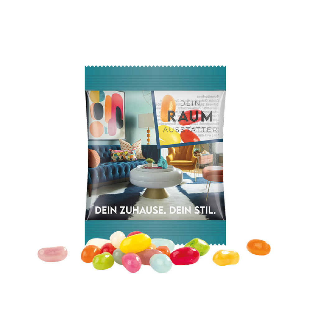 Trolli vegane Gummibärchen in Tüte aus transparenter Folie, kompostierbar, individuell bedruckt. Inhalt: Trolli vegane Gummibärchen mit 14 % Fruchtsaftanteil, bunt gemischt, 12 g