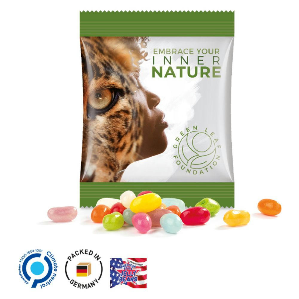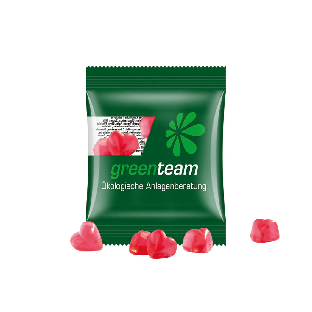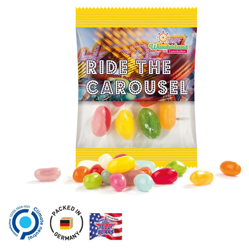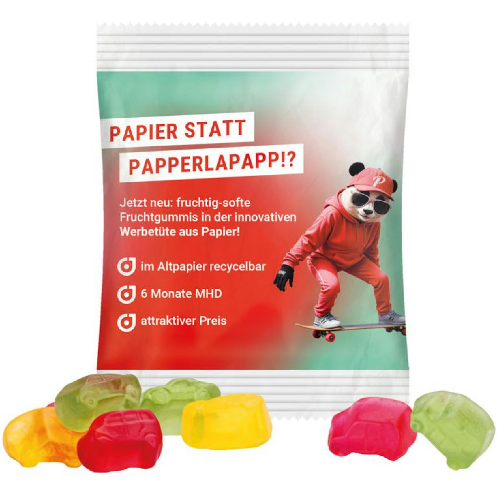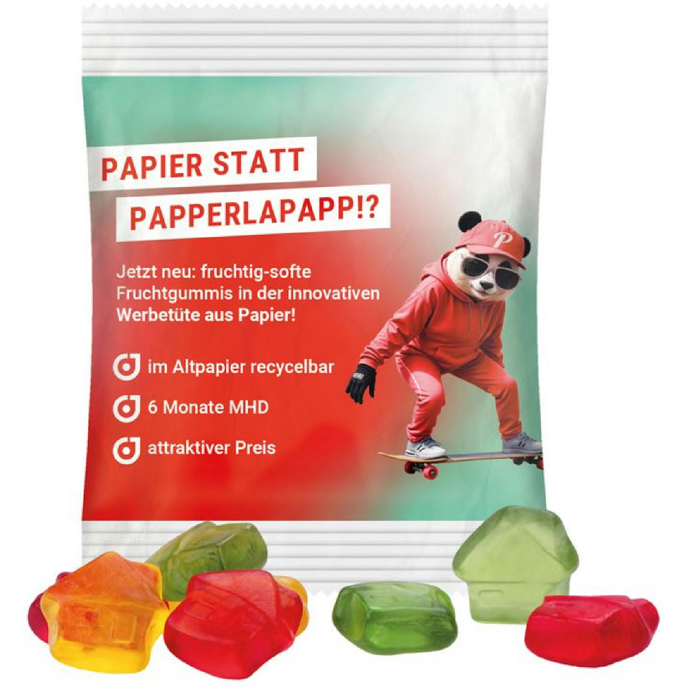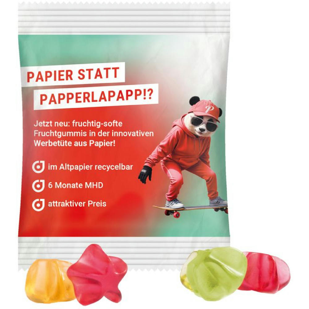 Trolli vegane Gummibärchen in Tüte aus transparenter Folie, kompostierbar, individuell bedruckt. Inhalt: Trolli vegane Gummibärchen mit 14 % Fruchtsaftanteil, bunt gemischt, 12 g