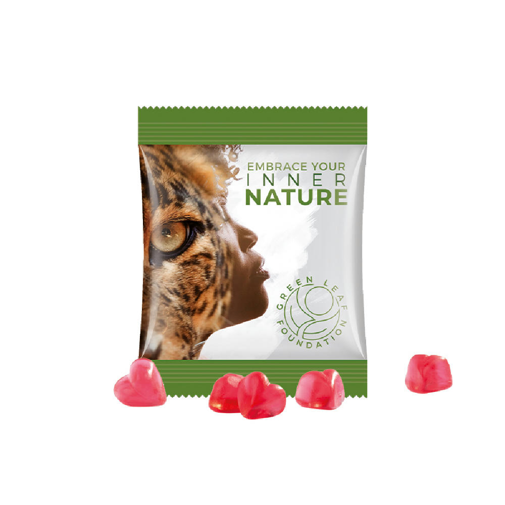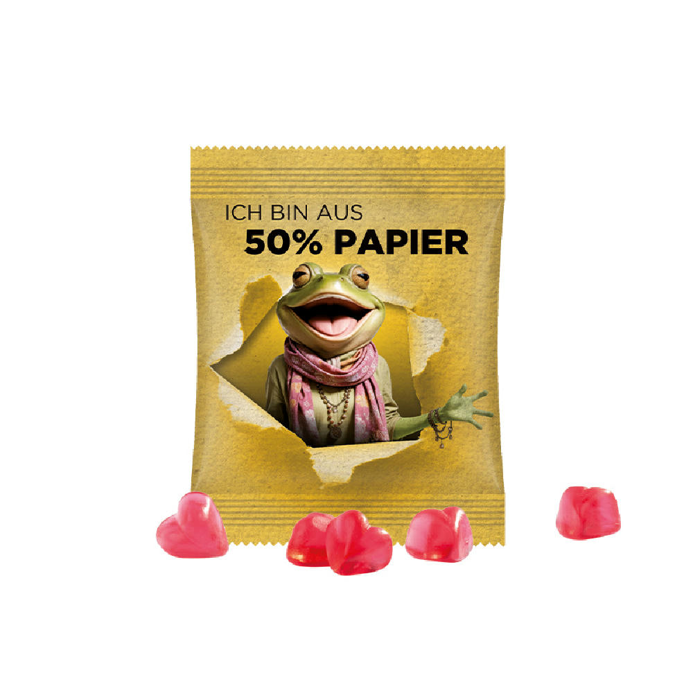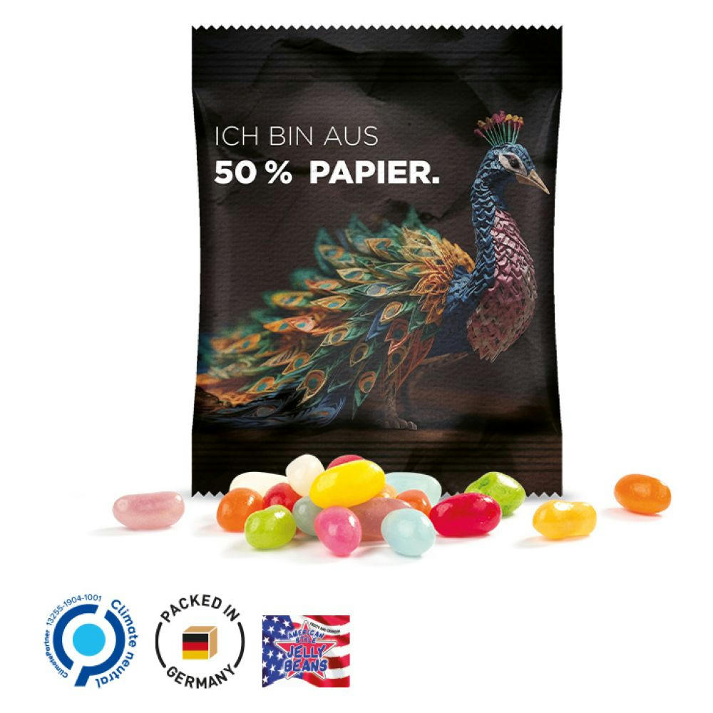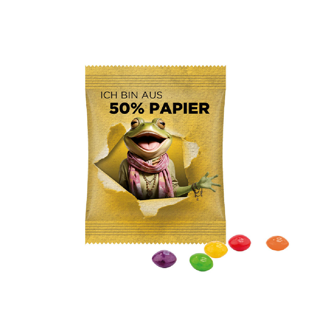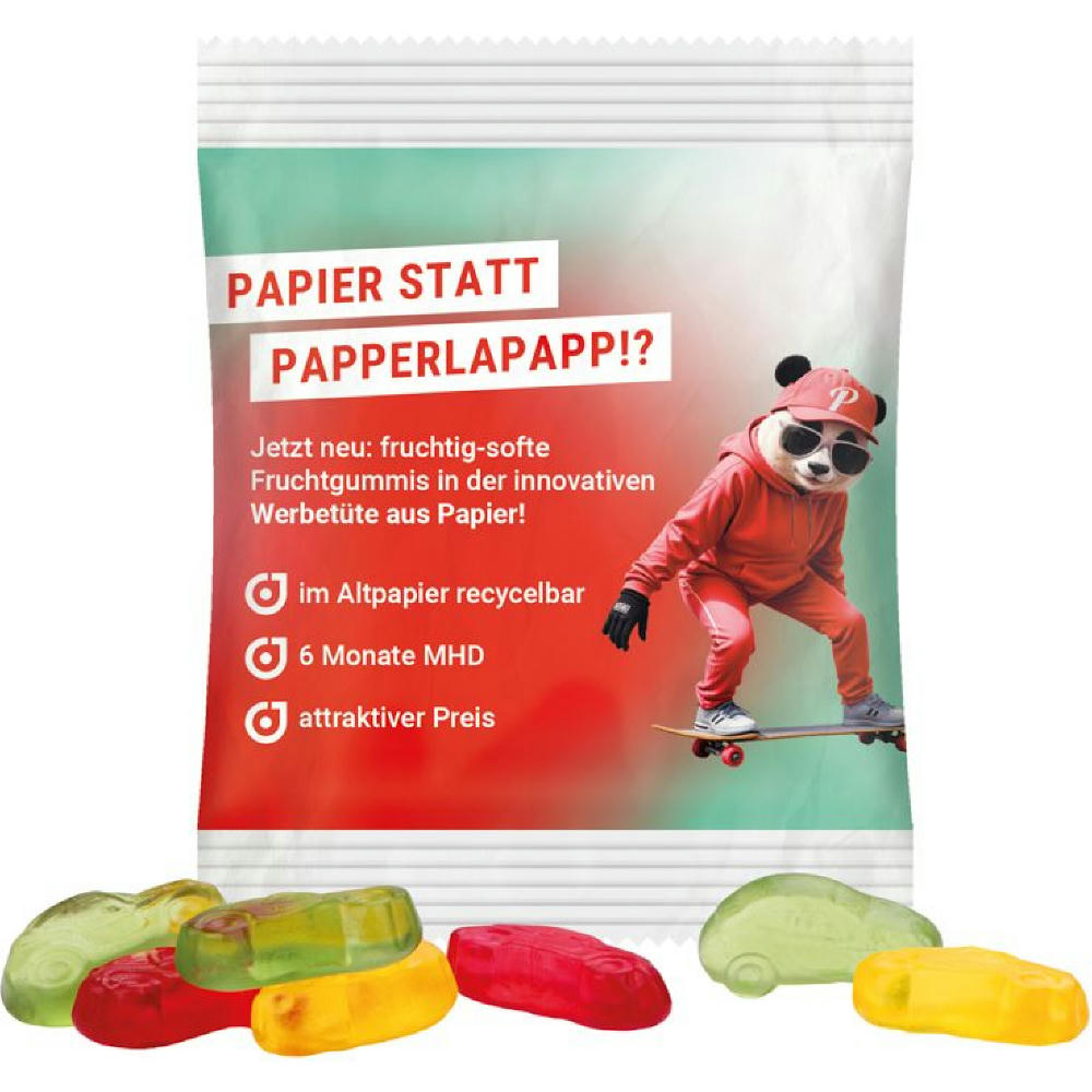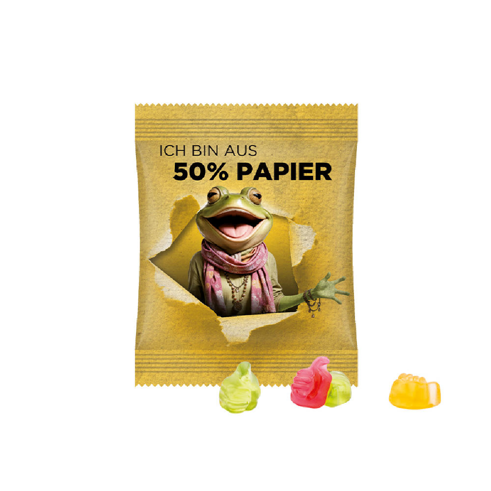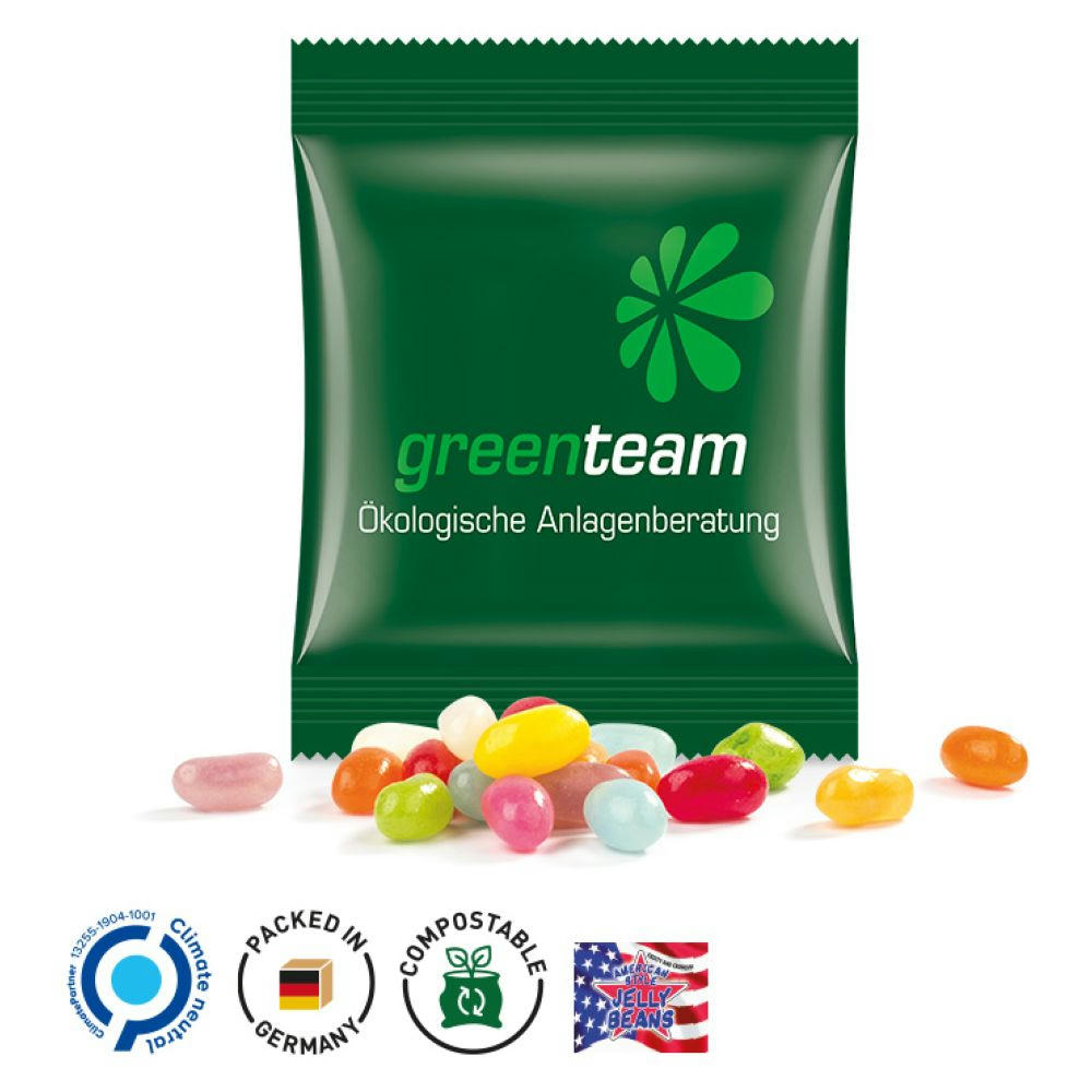 Trolli vegane Gummibärchen in Tüte aus transparenter Folie, kompostierbar, individuell bedruckt. Inhalt: Trolli vegane Gummibärchen mit 14 % Fruchtsaftanteil, bunt gemischt, 12 g