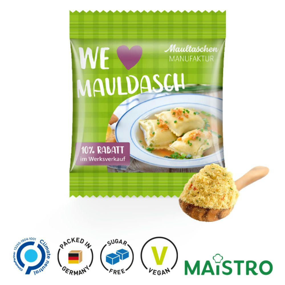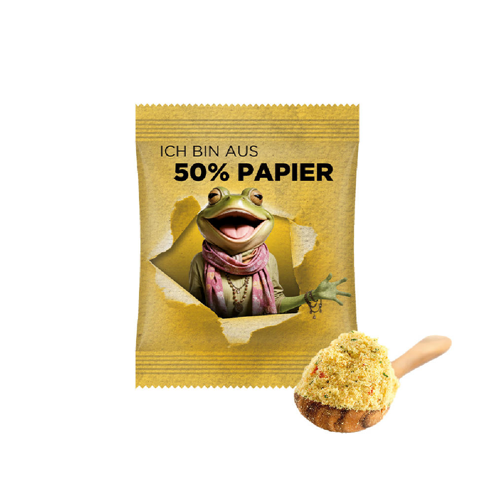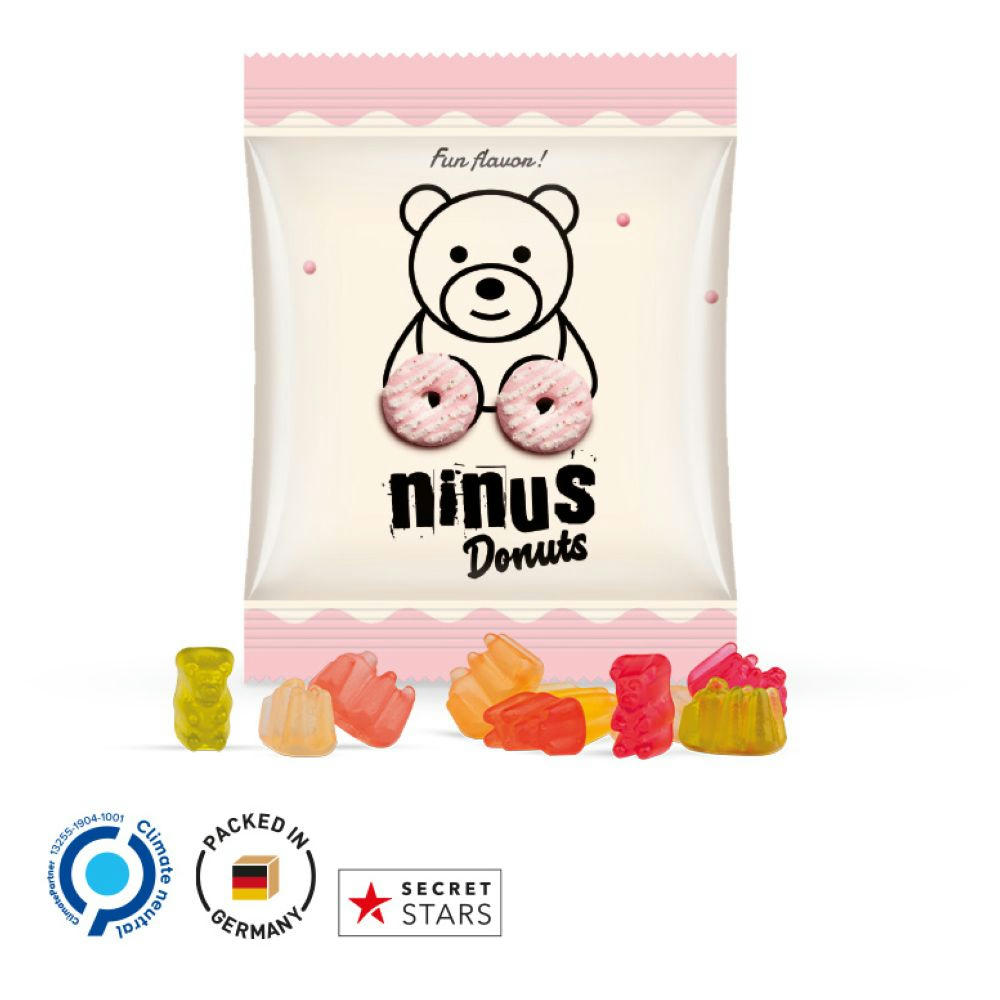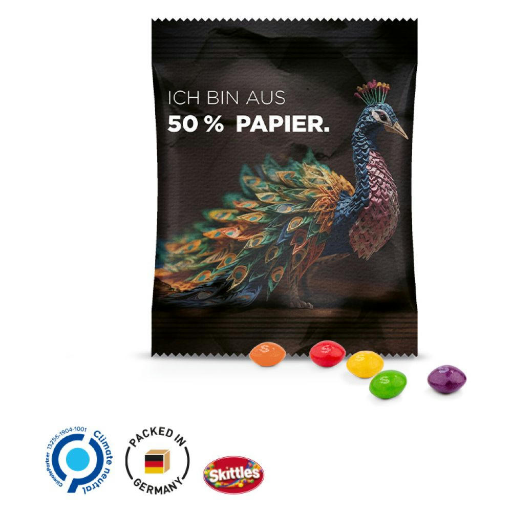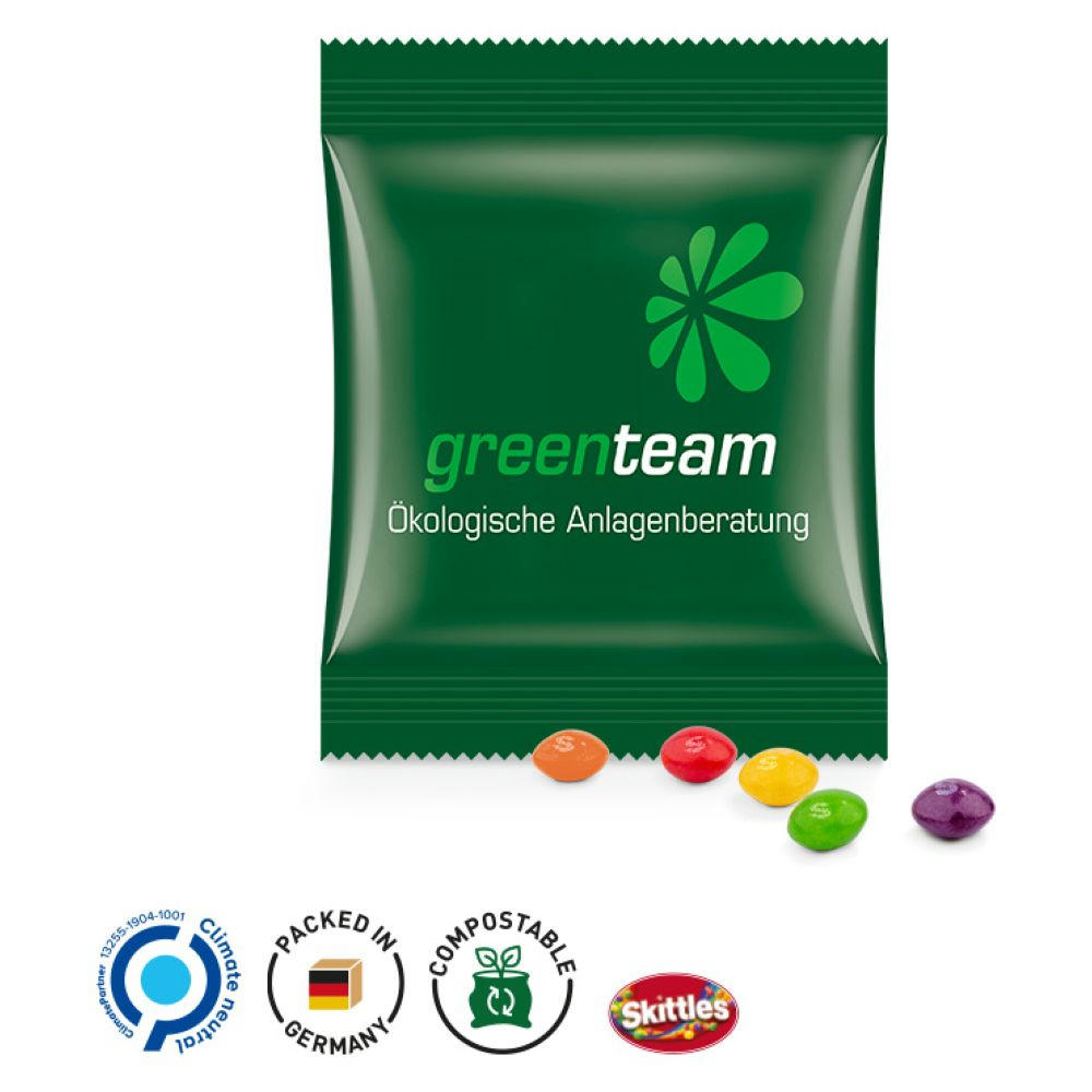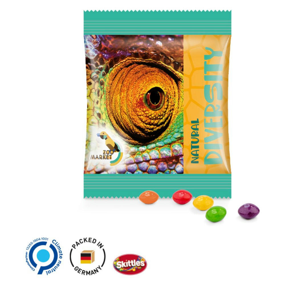 Trolli vegane Gummibärchen in Tüte aus transparenter Folie, kompostierbar, individuell bedruckt. Inhalt: Trolli vegane Gummibärchen mit 14 % Fruchtsaftanteil, bunt gemischt, 12 g