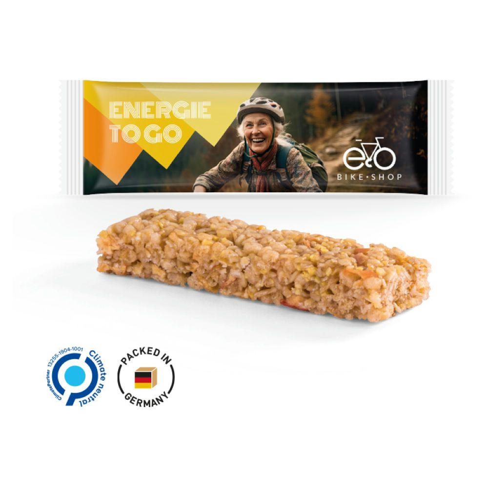Müsliriegel Multikorn Apfel in weißem, recycelfähigem Papier, individuell bedruckt. Inhalt: 1 Müsliriegel mit hochwertigen Getreidearten, Apfelstückchen und Rosinen, 25 g.