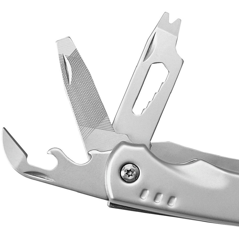 Werkzeuge: Schraubendreher Bithalter, Klaue mit Nagelheber, Bithalter mit Magnet, Schraubenschlüssel (12 mm), Hammer, Kronkorken-Heber, Dosenöffner, Abisolierer, Feile, Schlitzschraubendreher (6,5 ), Schraubenschlüssel (5/ 6/ 7/ 8/ 9 mm), Stemmwerkzeug, Messer (Klingenlänge 80 mm).