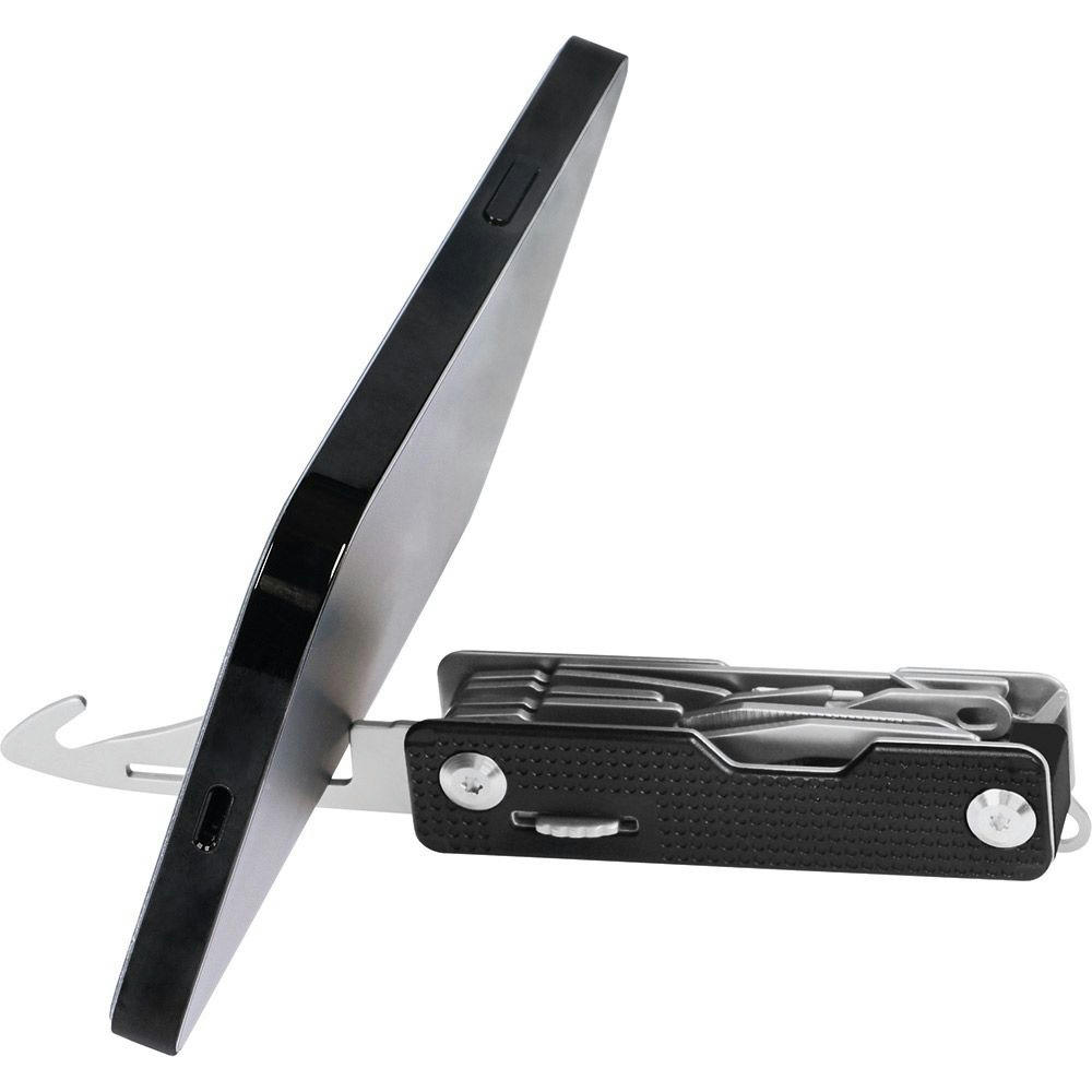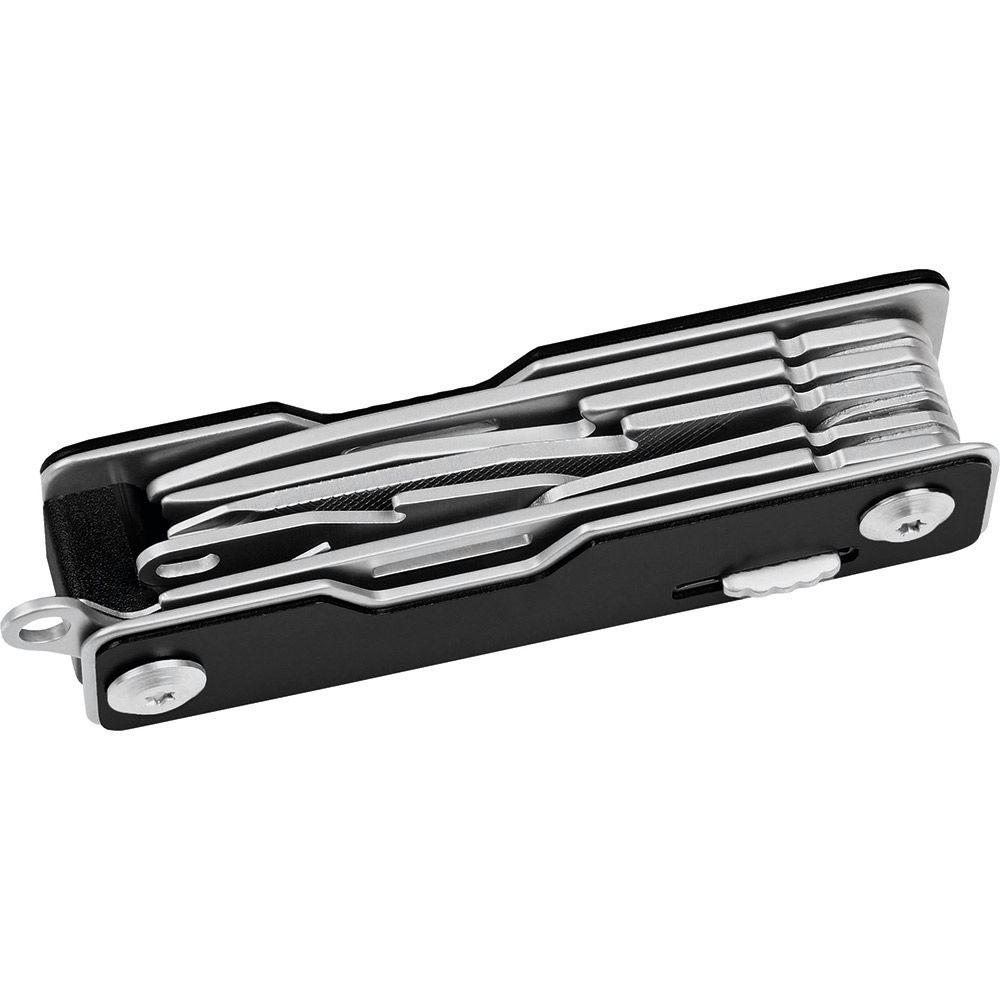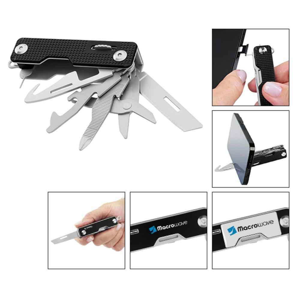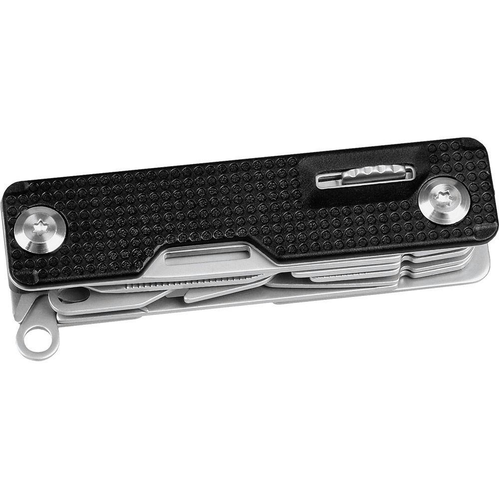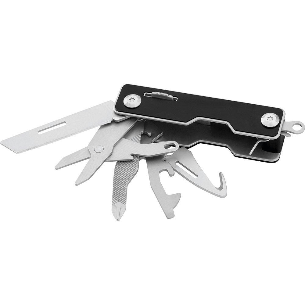 Multifunktions-Werkzeug mit 12 Funktionen. Für Rechts- und Linkshänder geeignet. Funktionen: Taschenmesser (Klingenlänge 53 mm), Schere, Metallfeile, Schlitzschraubendreher, Phillips-Schraubendreher, Dosenöffner, Flaschenöffner, Hakenklingen-Cutter, Smart