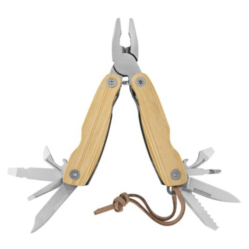 Naturverbundenes handliches Profitool mit Bambusgriffschalen. Vielfältige Instrumente: Zange, Schraubenzieher (Schlitz/Kreuz), Schneidmesser, Sägemesser, Drahtkneifer, Kapselheber, Getränkedosenöffner - praktisch faltbar für die Tasche