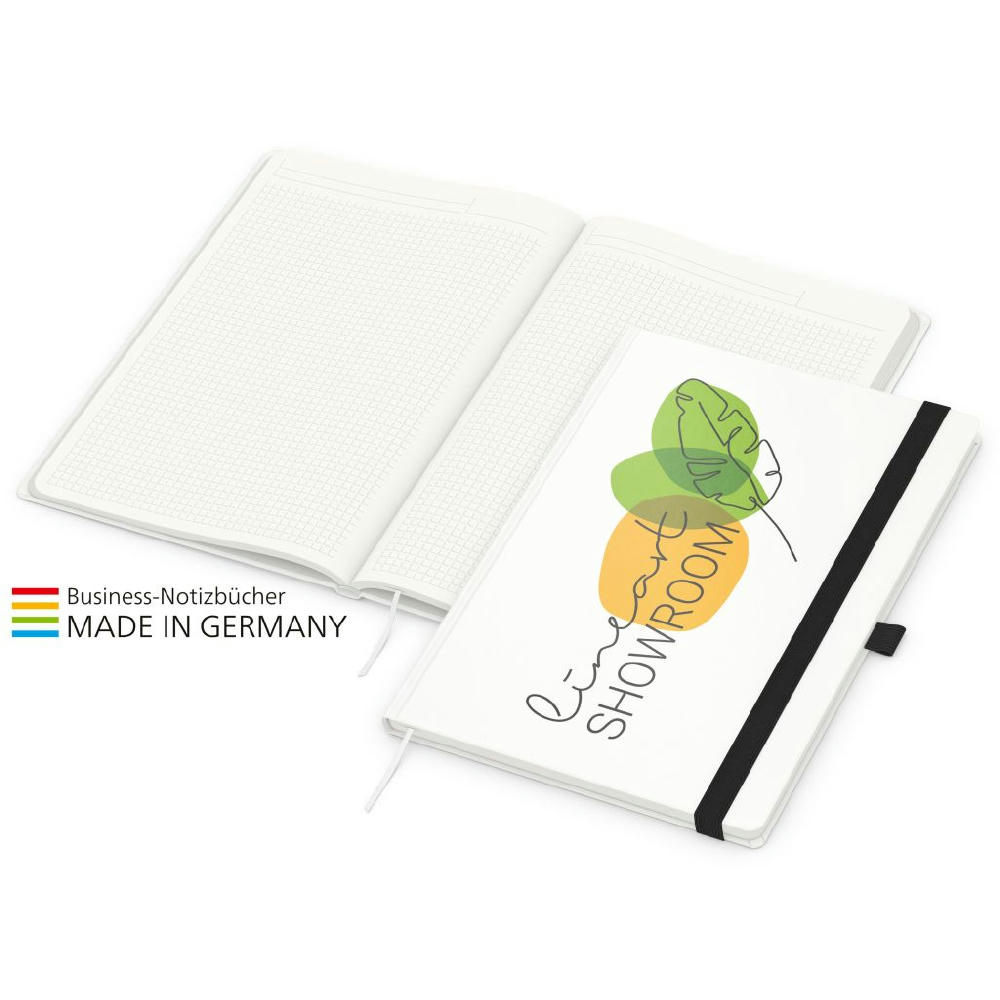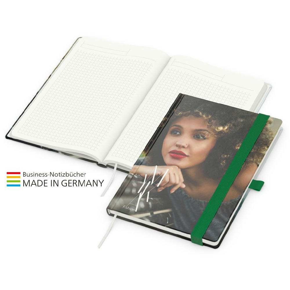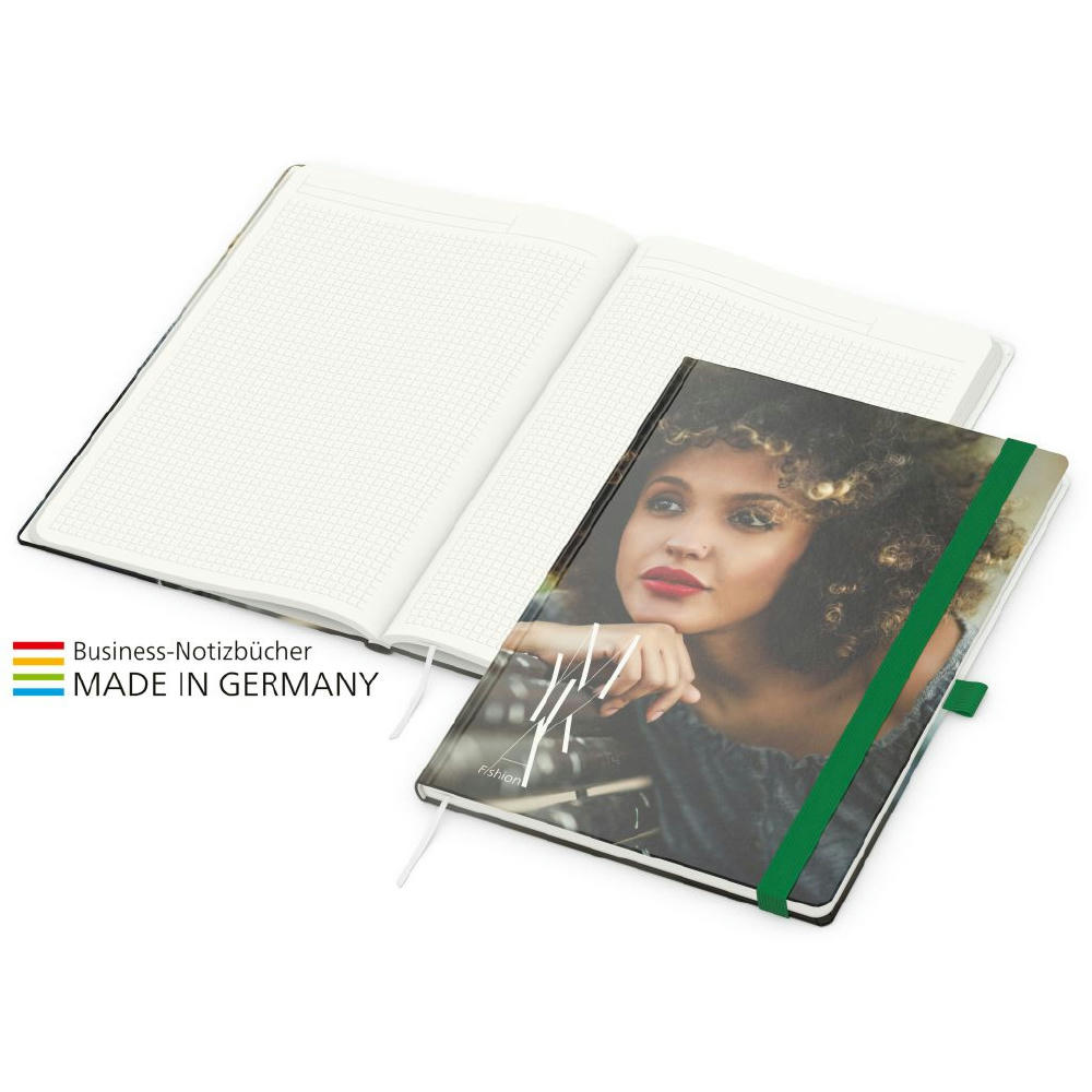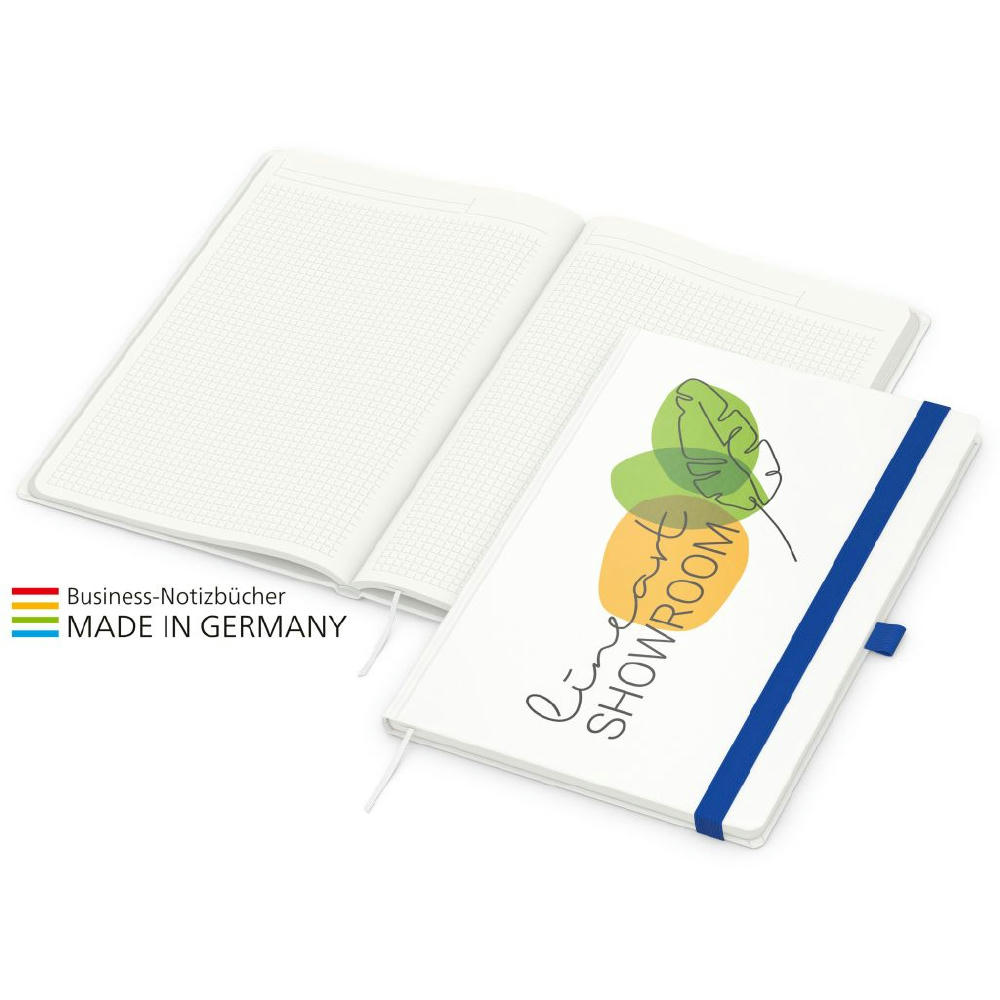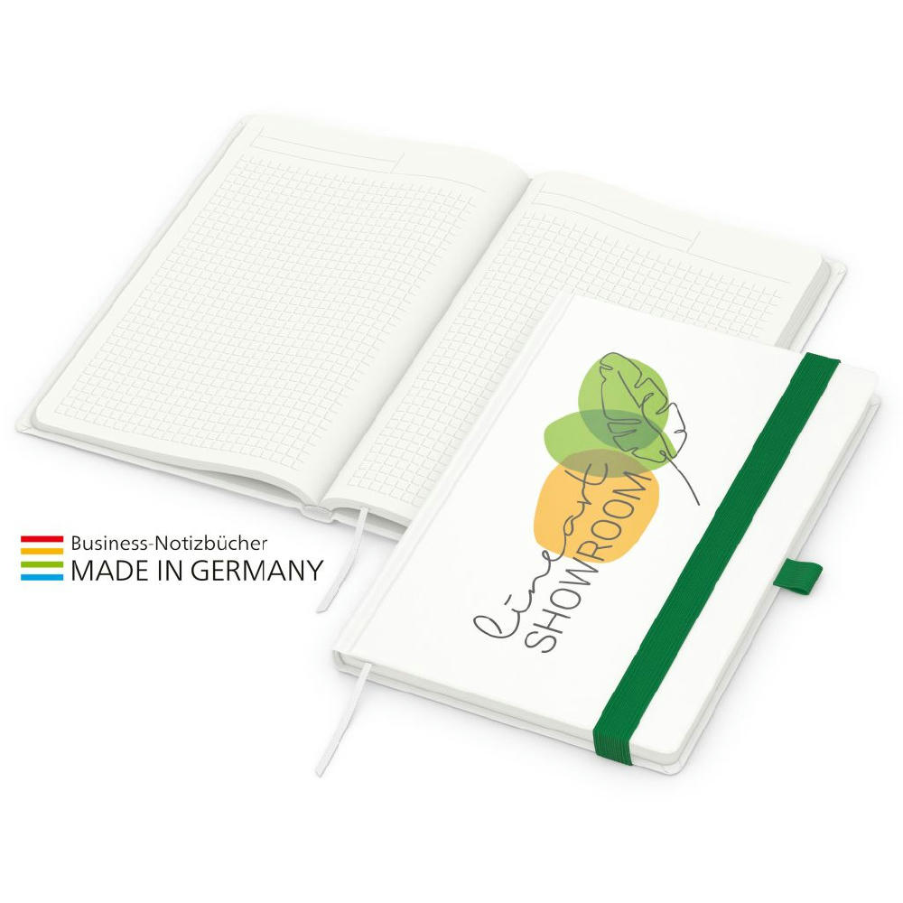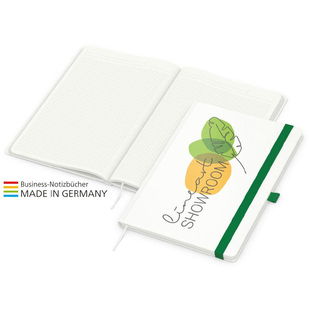 Zur Wahrung einer einheitlichen Corporate Identity: Match-Book green+blue mit Recycling-Schreibpapier, hergestellt aus 100 % Altpapier mit dem Umweltzeichen „Blauer Engel“, Gummiband sowie Stiftschlaufe in einer von 8 attraktiven Farben – individuelle Werbung in 4C-Quality Digital auf dem kompletten Einband inklusive