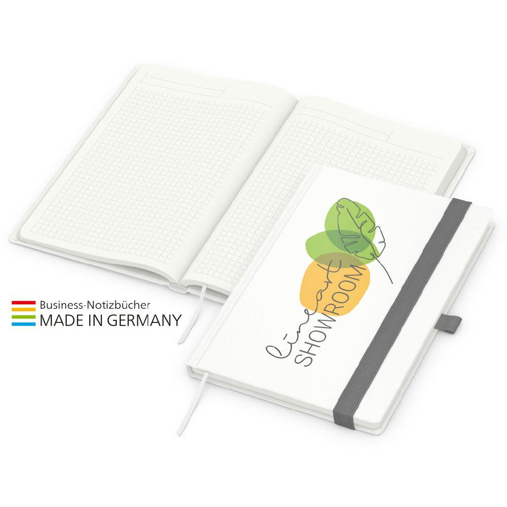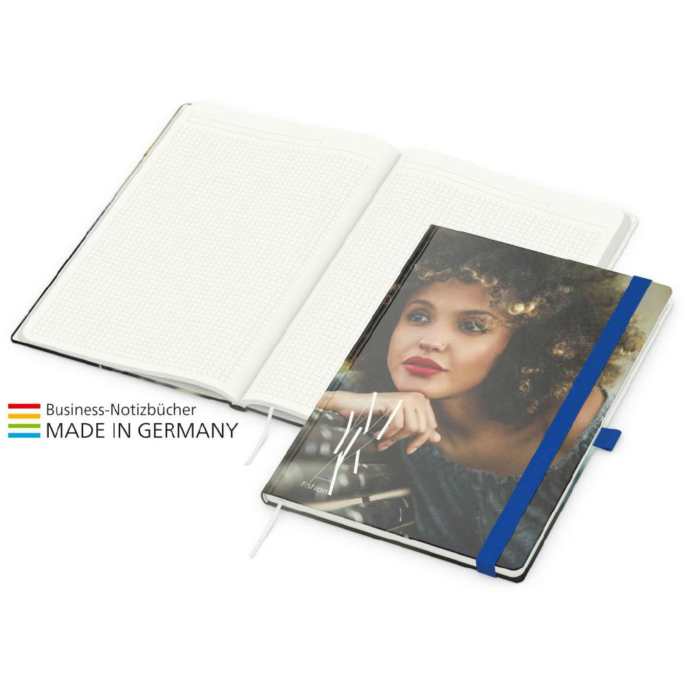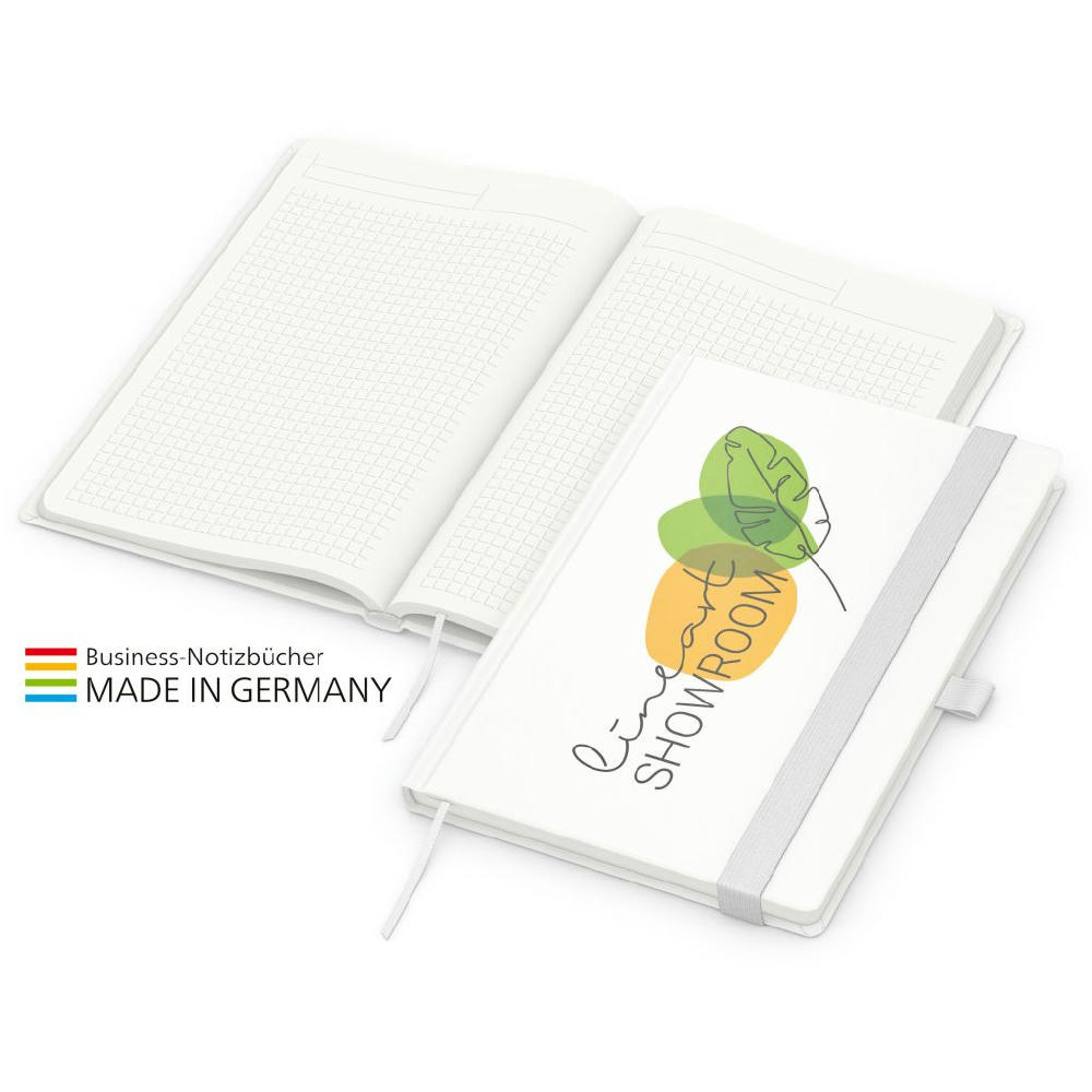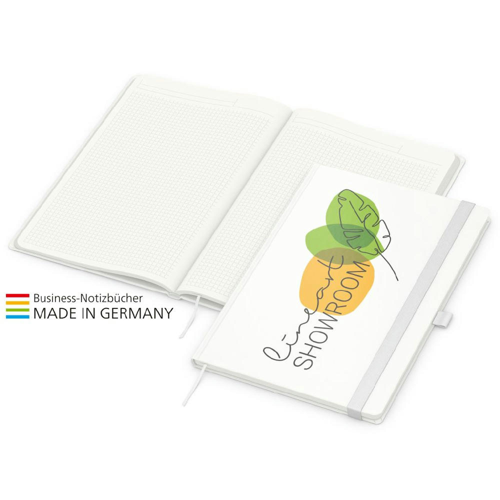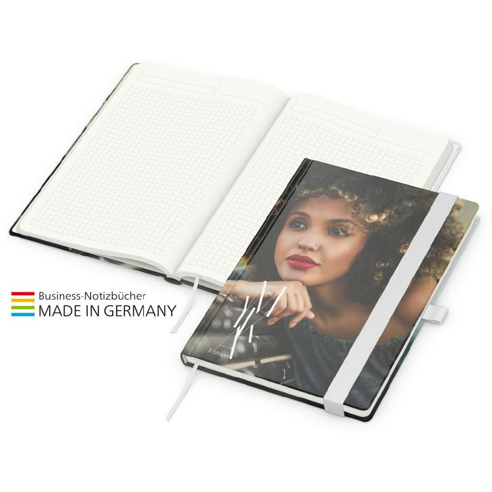 Zur Wahrung einer einheitlichen Corporate Identity: Match-Book green+blue mit Recycling-Schreibpapier, hergestellt aus 100 % Altpapier mit dem Umweltzeichen „Blauer Engel“, Gummiband sowie Stiftschlaufe in einer von 8 attraktiven Farben – individuelle Werbung in 4C-Quality Digital auf dem kompletten Einband inklusive
