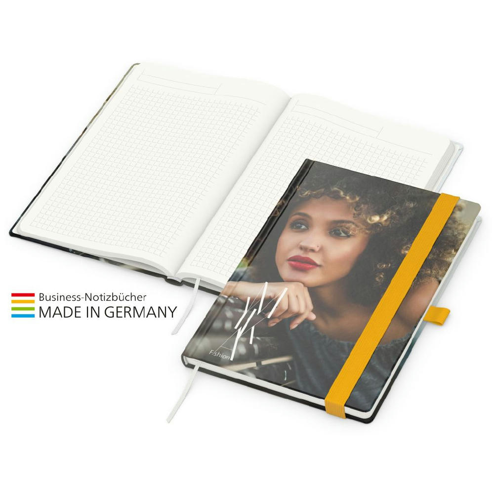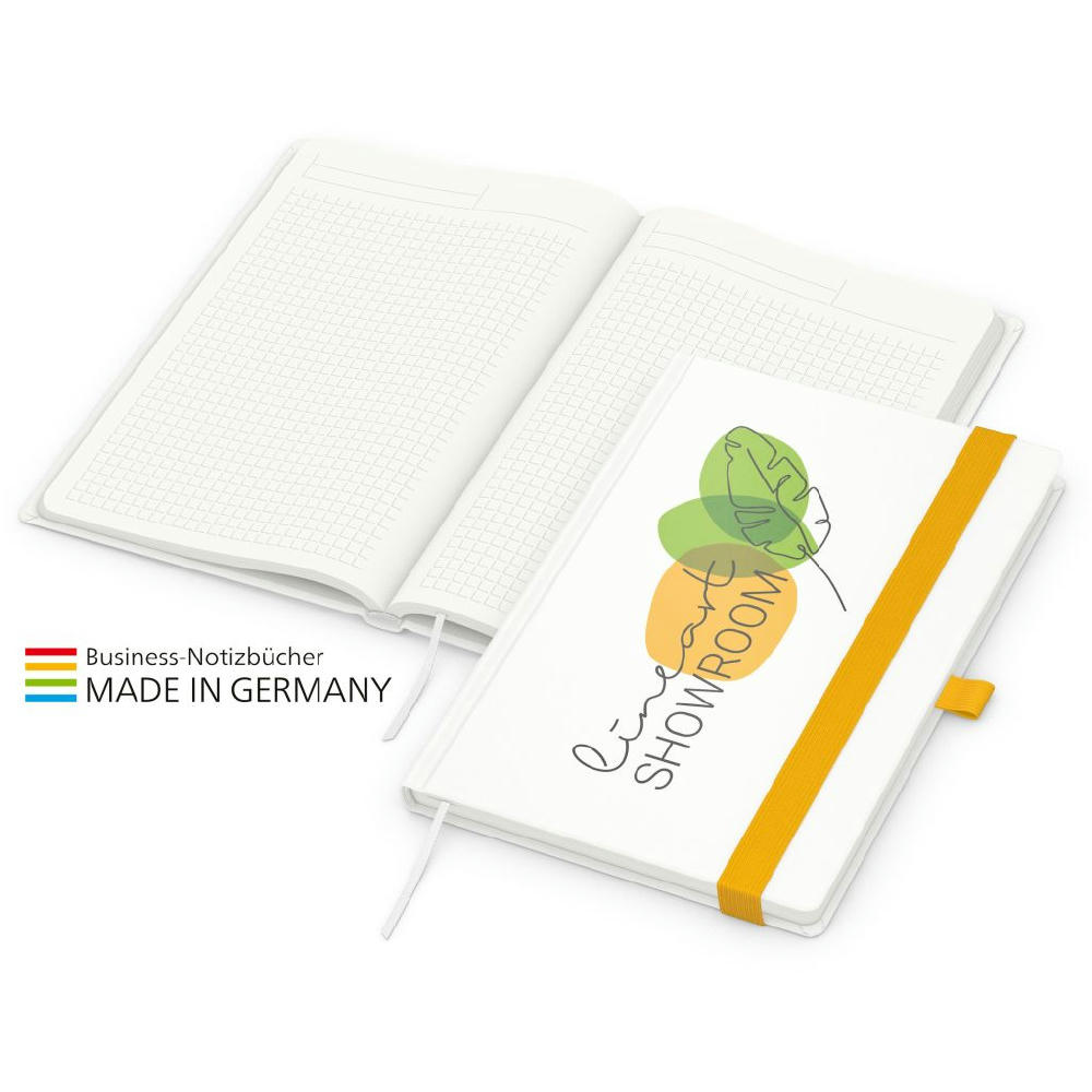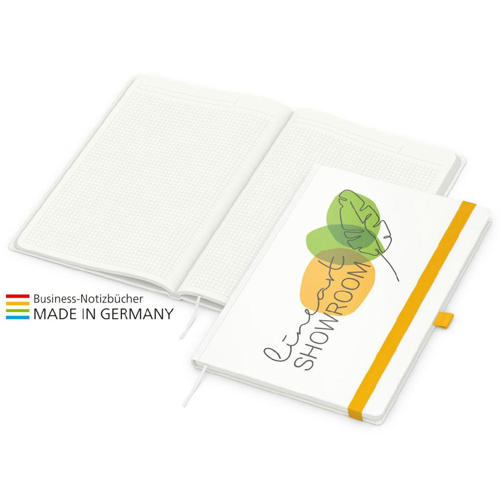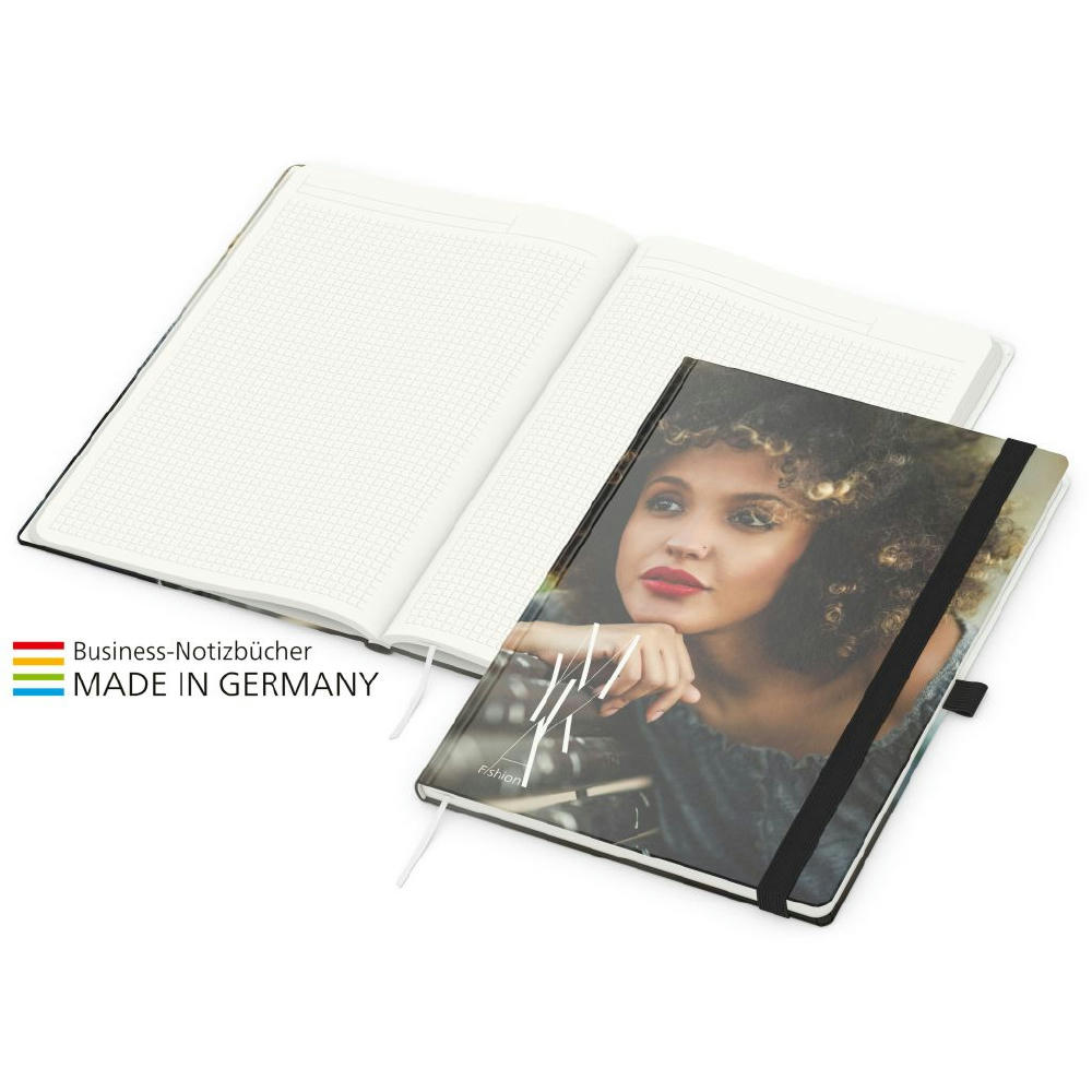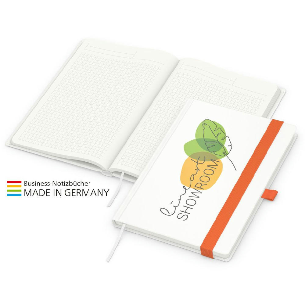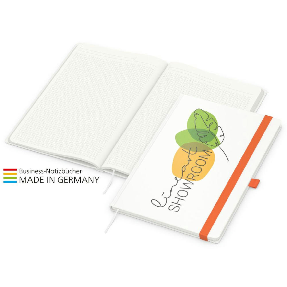 Zur Wahrung einer einheitlichen Corporate Identity: Match-Book green+blue mit Recycling-Schreibpapier, hergestellt aus 100 % Altpapier mit dem Umweltzeichen „Blauer Engel“, Gummiband sowie Stiftschlaufe in einer von 8 attraktiven Farben – individuelle Werbung in 4C-Quality Digital auf dem kompletten Einband inklusive