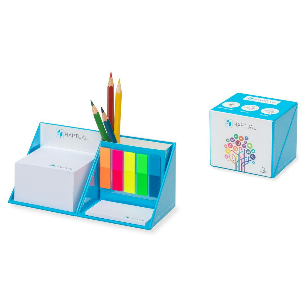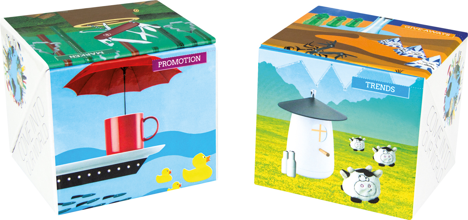 Inhalt: Notizblock (380 Blatt), Haftnotizen (25 Blatt), Indexstreifen (5 x 25 St.) und Ablage für Schreibgeräte. Der Würfel ist diagonal zu öffnen. Außen- und Innen-flächen des Würfels 4c-gestaltbar, Notizblock/Haftnotizen 1–2c bedruckbar. Preis inkl. Werbeanbringung.