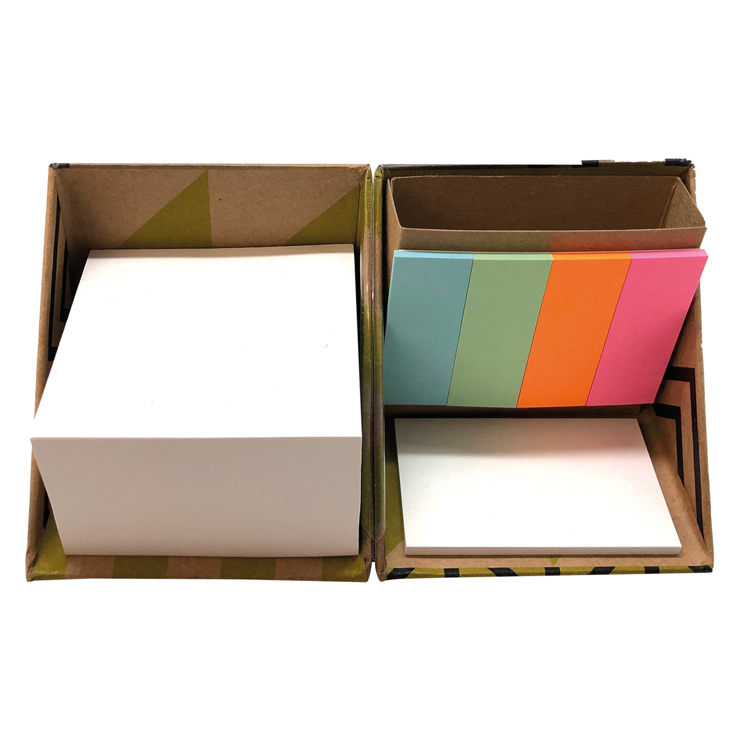 Inhalt: Notizblock (380 Blatt), Haftnotizen (25 Blatt), Papier-Indexstreifen (4x 25 St.) und Ablage für Schreibgeräte – alles aus recyceltem Papier. Der Würfel ist diagonal zu öffnen und mit braunem Recycling-Papier ummantelt (keine zusätzliche Folienkaschierung). Einzeln mit neutraler Banderole verschlossen. Außenflächen des Würfels 4c-gestaltbar, Notizblock/Haftnotizen 1–2c bedruckbar. Preis inkl. Werbeanbringung.