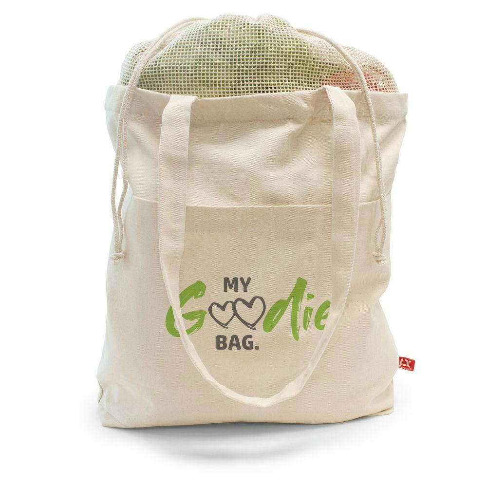 Aus 100 % OEKO-TEX® Baumwolle, 260 g/m2, mit langen Henkeln und ausziehbarem Baumwollnetz.