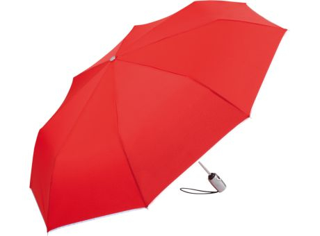 Markanter Doppelautomatik-Taschenschirm in Übergröße mit modisch reflektierender Paspelierung. Komfortable Doppelautomatik-Funktion zum schnellen Öffnen und Schließen, hochwertiges Windproof-PLUS-System für eine maximale Gestell-Flexibilität bei stärkeren Windböen, flexible Fiberglasschienen, verchromter Stahlstock, Bezug mit modischer Reflexpaspel in silber, Griff in Alu-Finish mit integrierter Auslösetaste und Werbeanbringungsmöglichkeit