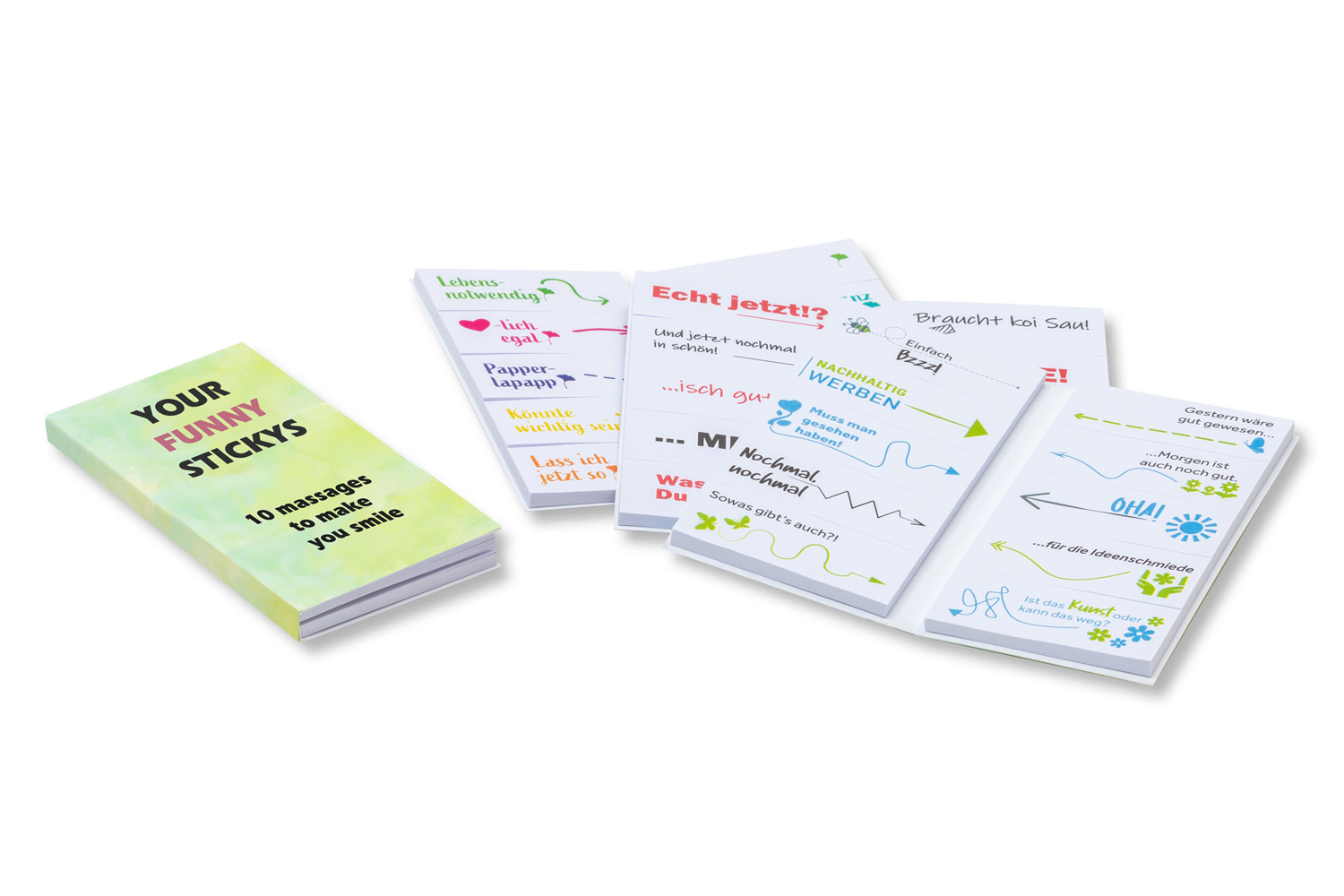 Kartoncover-Büchlein mit Haftnotizen. Papier-Index, 10x25 Blatt aus Papier, 20*x50 mm, 80 gr, inkl. Druck 4/0c CMYK auf Cover und Papier-Index.