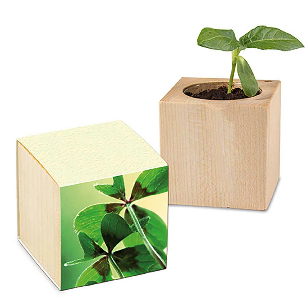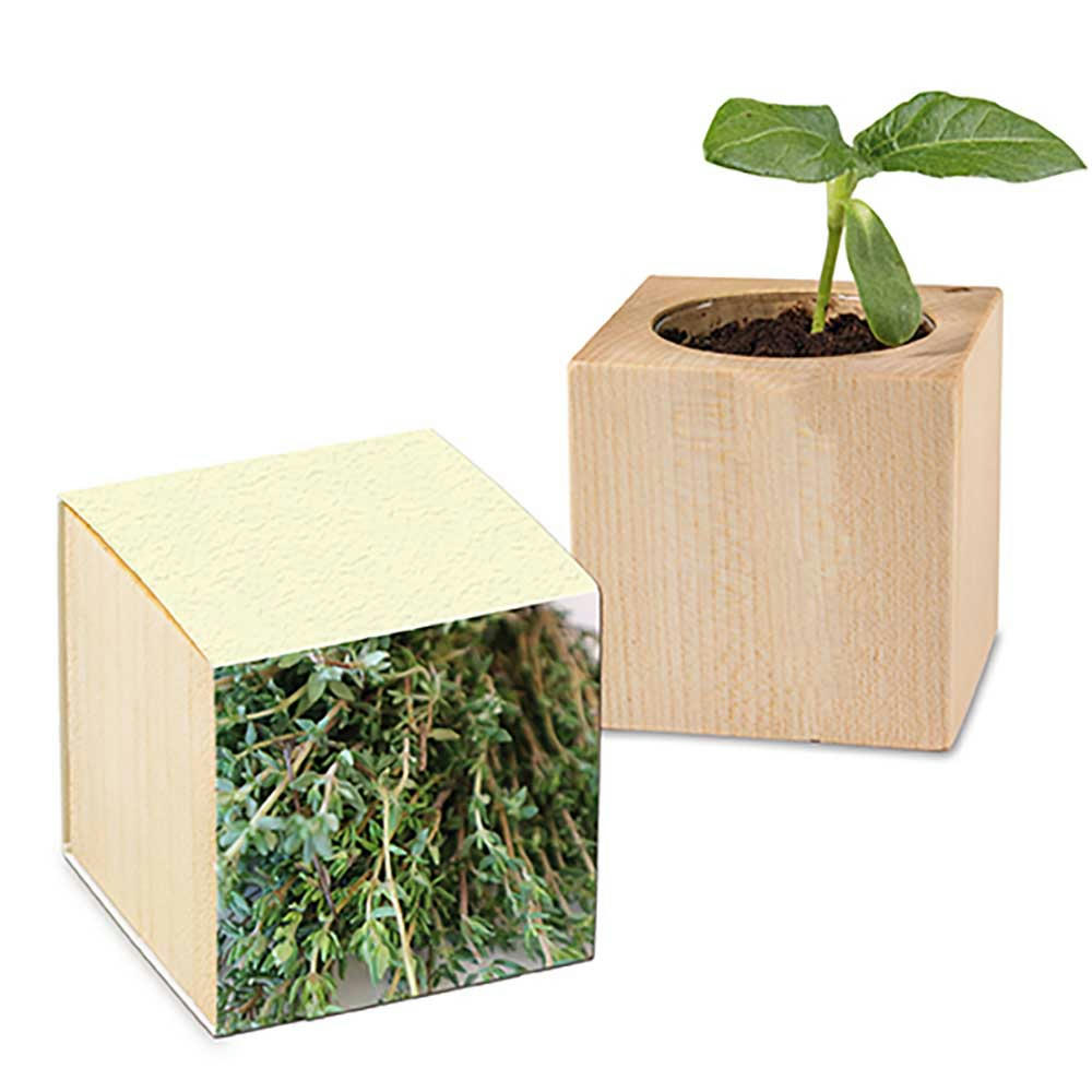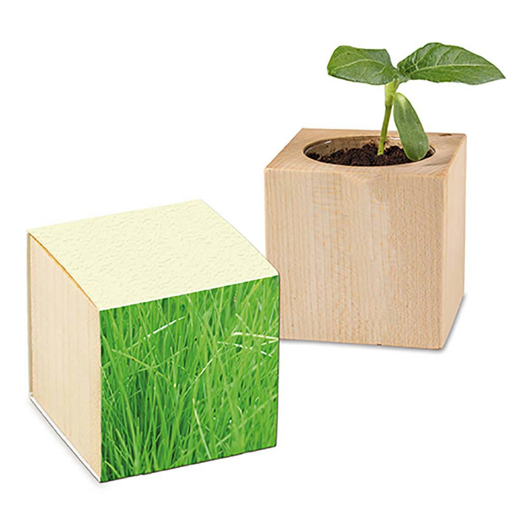 Der Würfel aus europäischem Holz wird mit beliebigem Samen und einer Substrattablette als Erde geliefert. Ihre Werbung findet auf der umliegenden Banderole aus Graspapier Platz und eine Lasergravur auf dem Holzgefäß ist optional möglich. Ein Stück Natur auf dem Schreibtisch oder der Fensterbank zeugt von umweltbewusstem Handeln des werbenden Unternehmens.