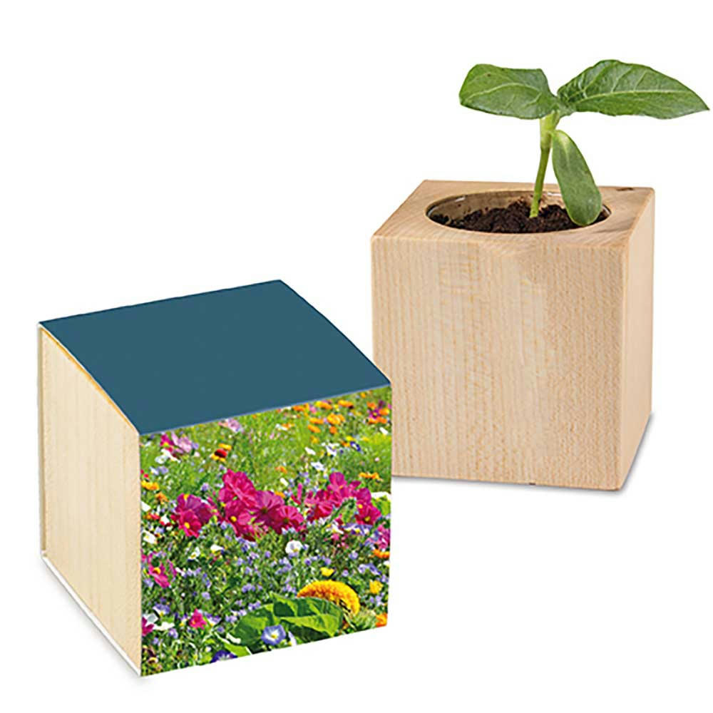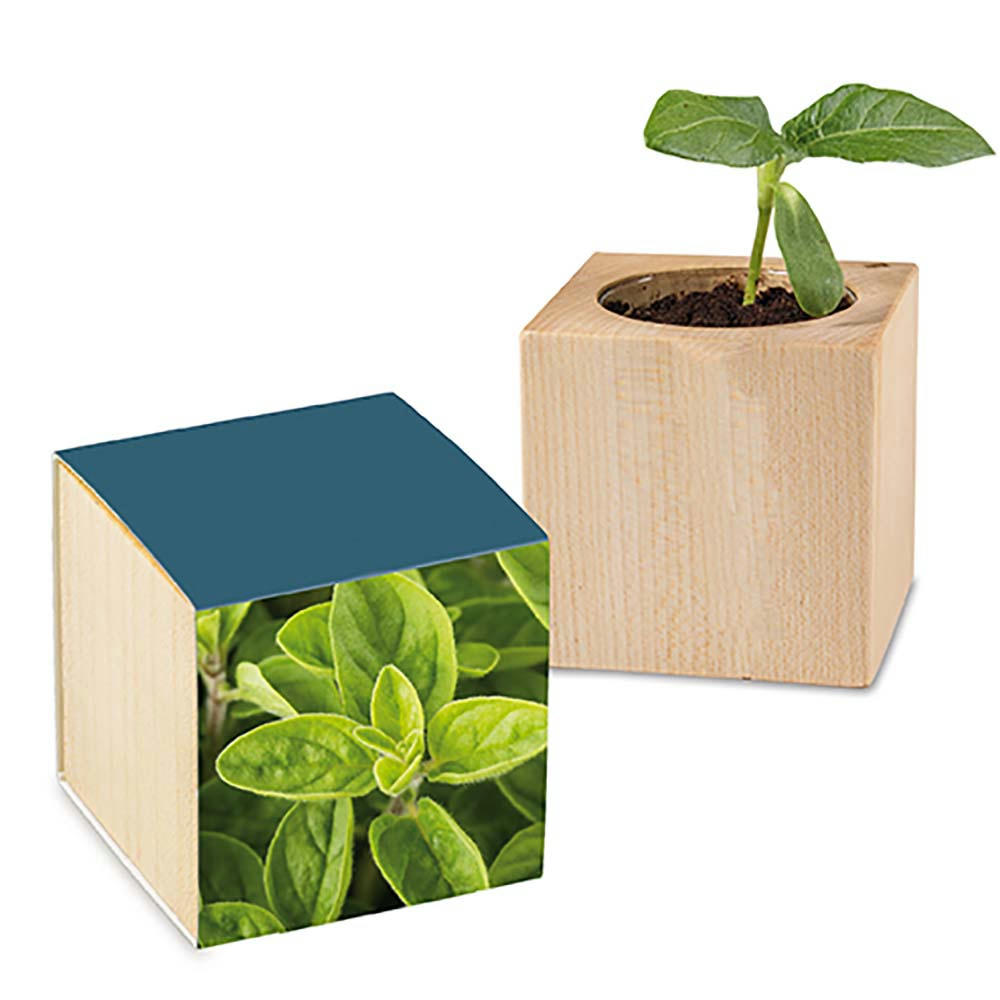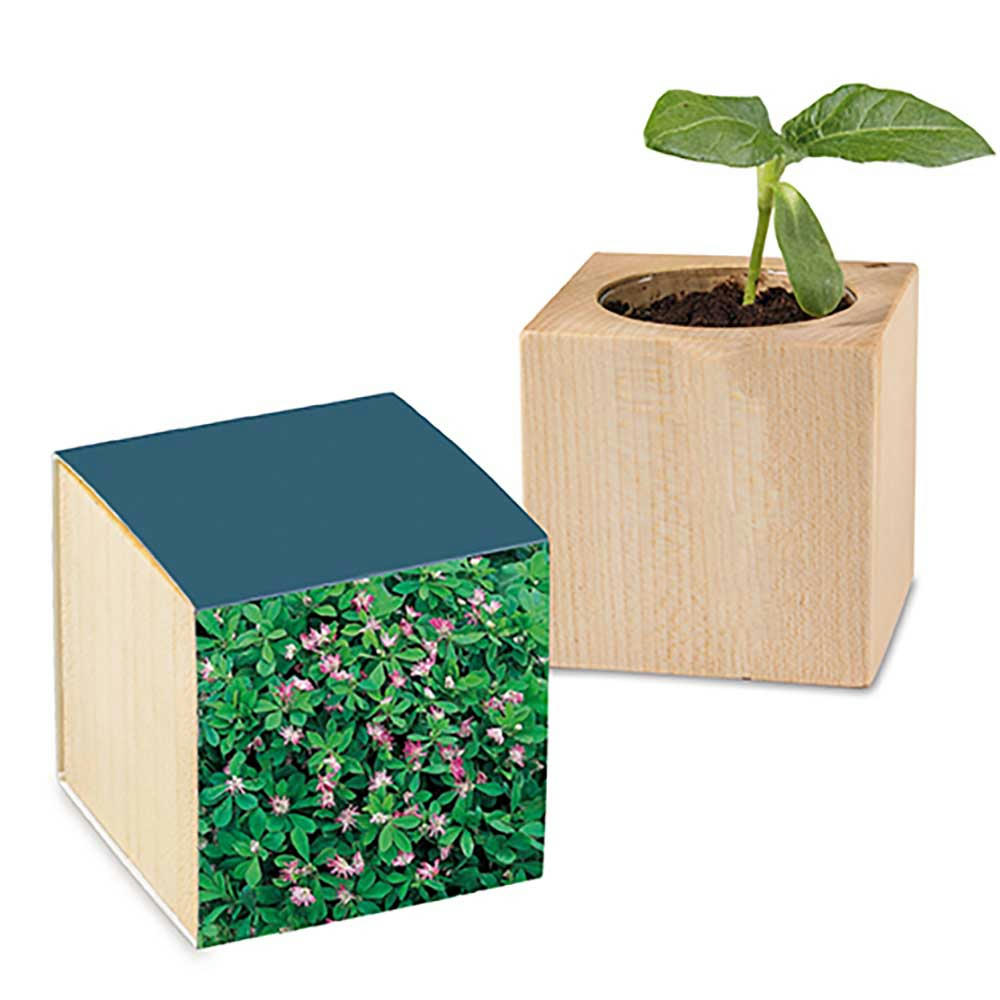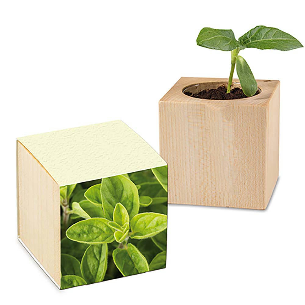 Der Würfel aus europäischem Holz wird mit beliebigem Samen und einer Substrattablette als Erde geliefert. Ihre Werbung findet auf der umliegenden Banderole aus Graspapier Platz und eine Lasergravur auf dem Holzgefäß ist optional möglich. Ein Stück Natur auf dem Schreibtisch oder der Fensterbank zeugt von umweltbewusstem Handeln des werbenden Unternehmens.