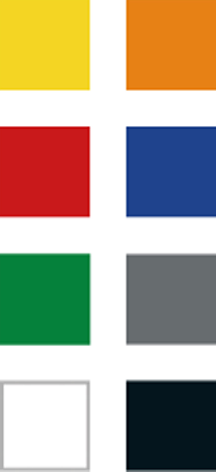Vollton: weiß,gelb,schwarz,metallic-anthrazit; transparent gefrostet: blau,rot,grün,orange