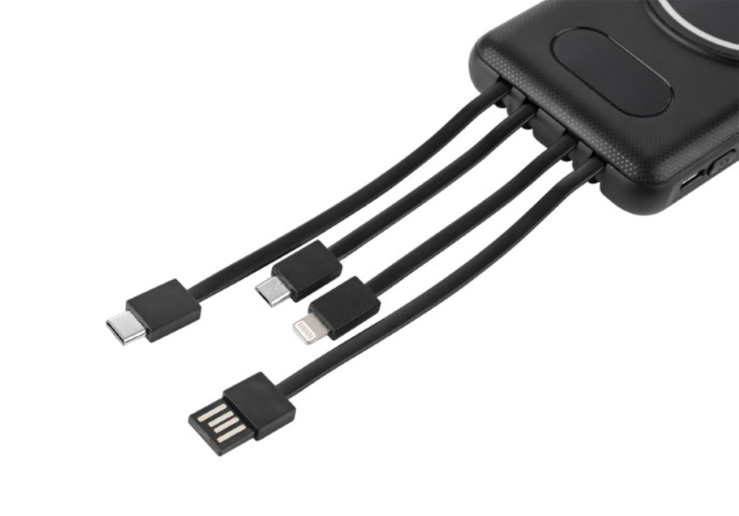 Integriertes induktives Laden (10 watt quick charge) mit magnetischer Halterung (magnetic safe z.B. ab Iphone® 11 & jetzt erhöhter Ladeplattform für alle Iphone® >14 ), Über/Unterlade/Kurzschlussschutz und allen gänigen Ladekabeln (USB-C Micro USB und Lightning Plug bereits elegant integriert und damit immer griffbereit für alle Handys und Gelegenheiten - mit high Power Anschlüssen , Micro USB 2.0 A) samt Kapazitätsanzeige.