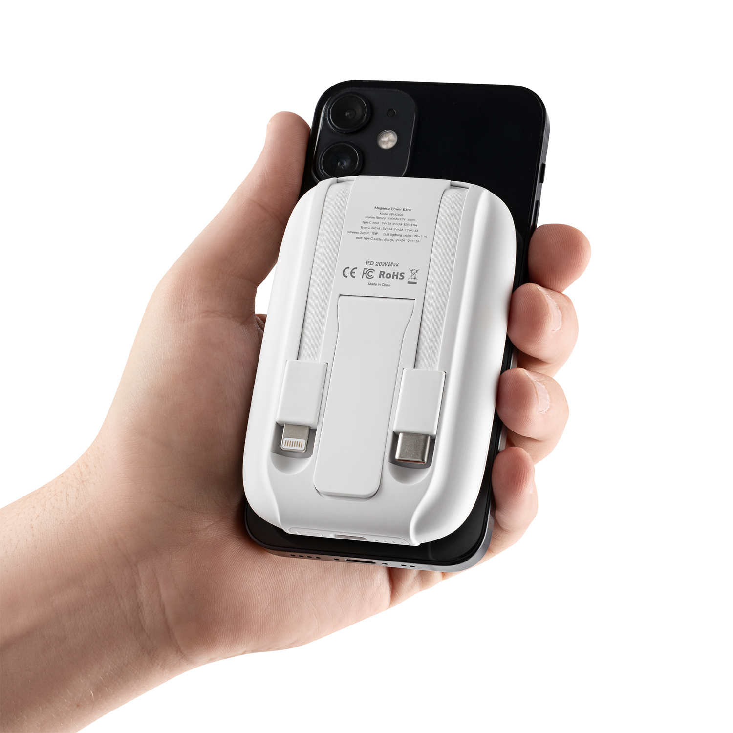 Mit wireless Magsafe charging 15 Watt High Speed, PD (Power Delivery), 20 Watt High Speed Charging (In/Out), integriertes Ladekabel (USB-C/Lightning). SecurityCircuit: Unterlade/Überlade/Kurzschluss/Überhitzungsschutz), LED Kapazitätsanzeige, im Designkarton