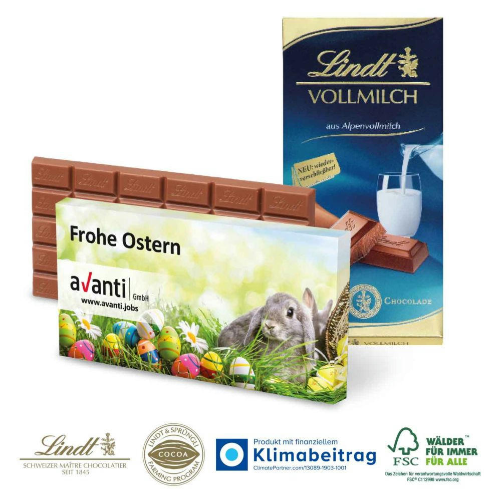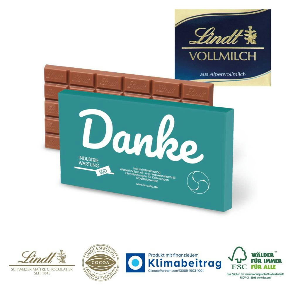 Qualität für höchste Ansprüche! Erfreuen Sie Ihre Kundinnen und Kunden oder Ihr Team mit feinster Schokolade von Lindt. Für einen optimalen Werbeeffekt wird die Verpackung ganz individuell bedruckt. Produktdetails: Schokoladentafel von Lindt, verpackt in einer individuellen Werbekartonage. Gleich mitbestellen: Einzelversandkarton für den Postversand. Das Lindt & Sprüngli Farming-Programm steht für nachhaltige Kakaobohnen-Beschaffung (www.farming-program.com). // Inhalt: 1 Schokoladentafel von Lindt (100 g). Geschmacksrichtung: Vollmilch