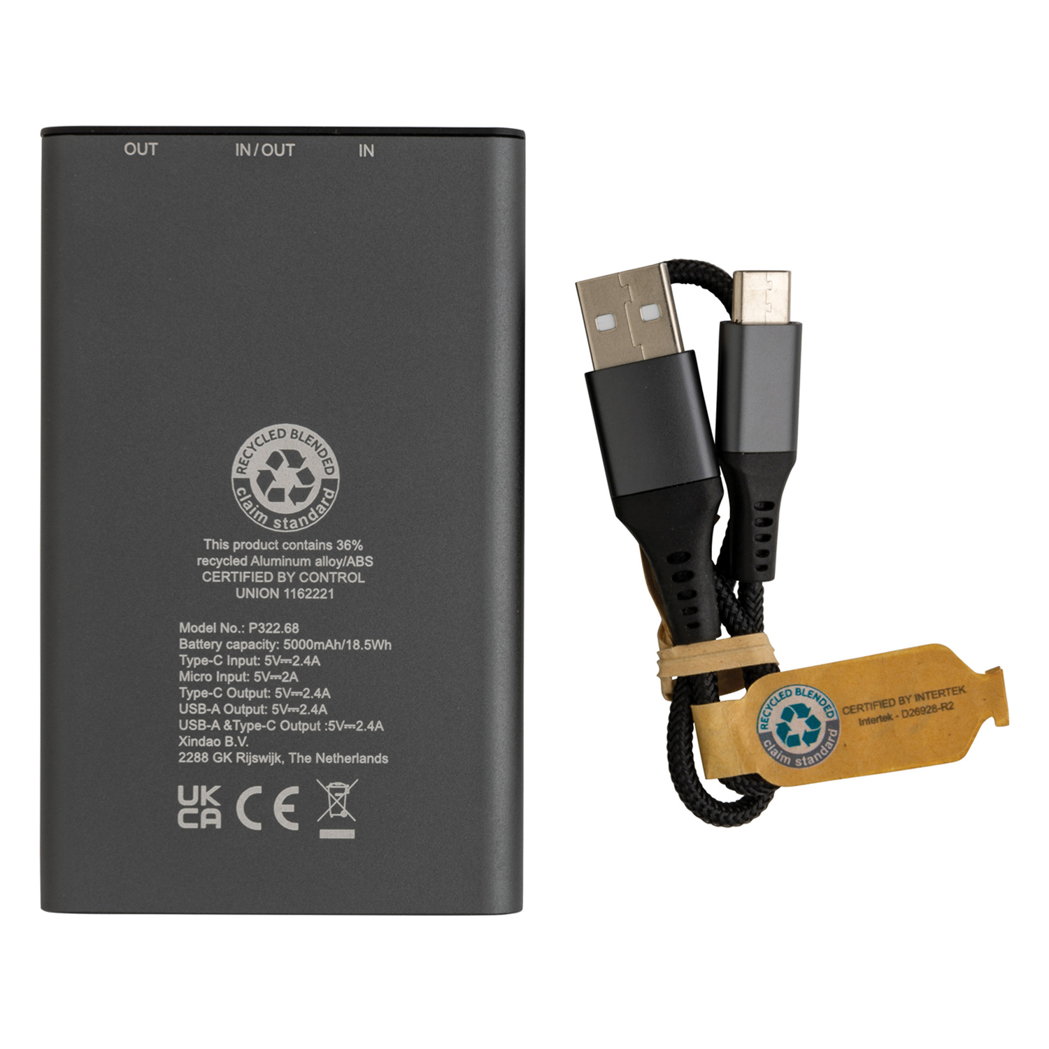 Powerbank aus RCS (Recycled Claim Standard)-zertifiziert recyceltem Aluminium und ABS. Gesamter Recyclinganteil: 36% basierend auf dem Gesamtgewicht des Artikels. Die RCS-Zertifizierung gewährleistet eine vollständig zertifizierte Lieferkette der recycelten Materialien. Aluminium verliert seine Eigenschaften im Recyclingprozess nicht und kann endlos recycelt werden. Die Powerbank enthält einen langlebigen A-Grade Lithium-Polymer-Akku mit 5.000 mAh. Die Ladestandsanzeigen zeigen die verbleibende Energie an, sodass Sie immer wissen, wann Sie wieder aufladen müssen. Artikel und Zubehör 100% PVC-frei. Inklusive Type-C-Ladekabel aus RCS-zertifiziert recyceltem Aluminium, TPE und PET. USB-Output: 5/2,4A, Type-C-Output: 5V/2,4A. Type-C Input: 2,4 A. Micro-USB-Input: 5V/2A.