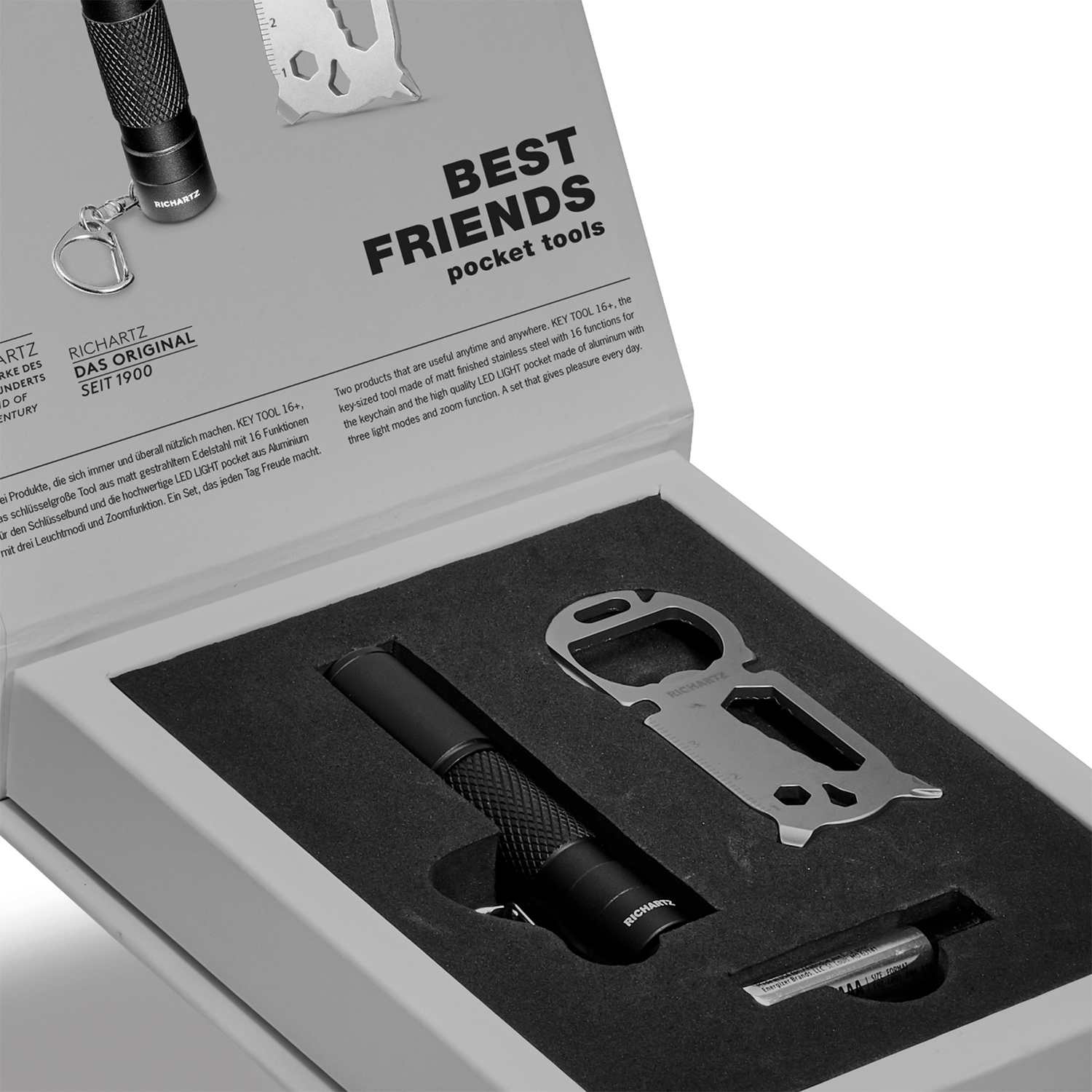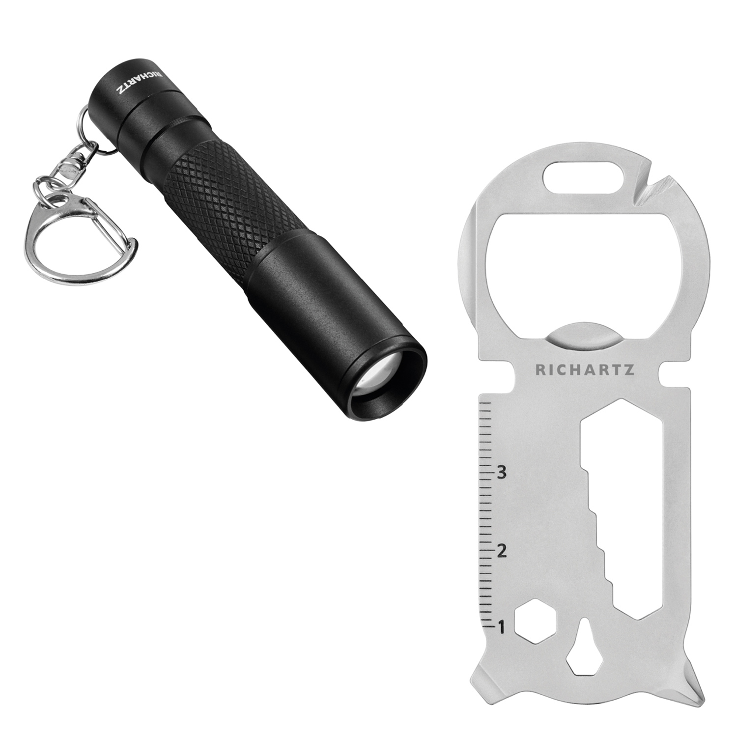 Zwei Produkte, die sich immer und überall nützlich machen: KEY TOOL 16+, das schlüsselgroße Multifunktionstool aus matt gestrahltem Edelstahl mit 16 Funktionen für den Schlüsselbund und die kompakte Taschenlampe LED LIGHT pocket aus Aluminium mit drei Leu