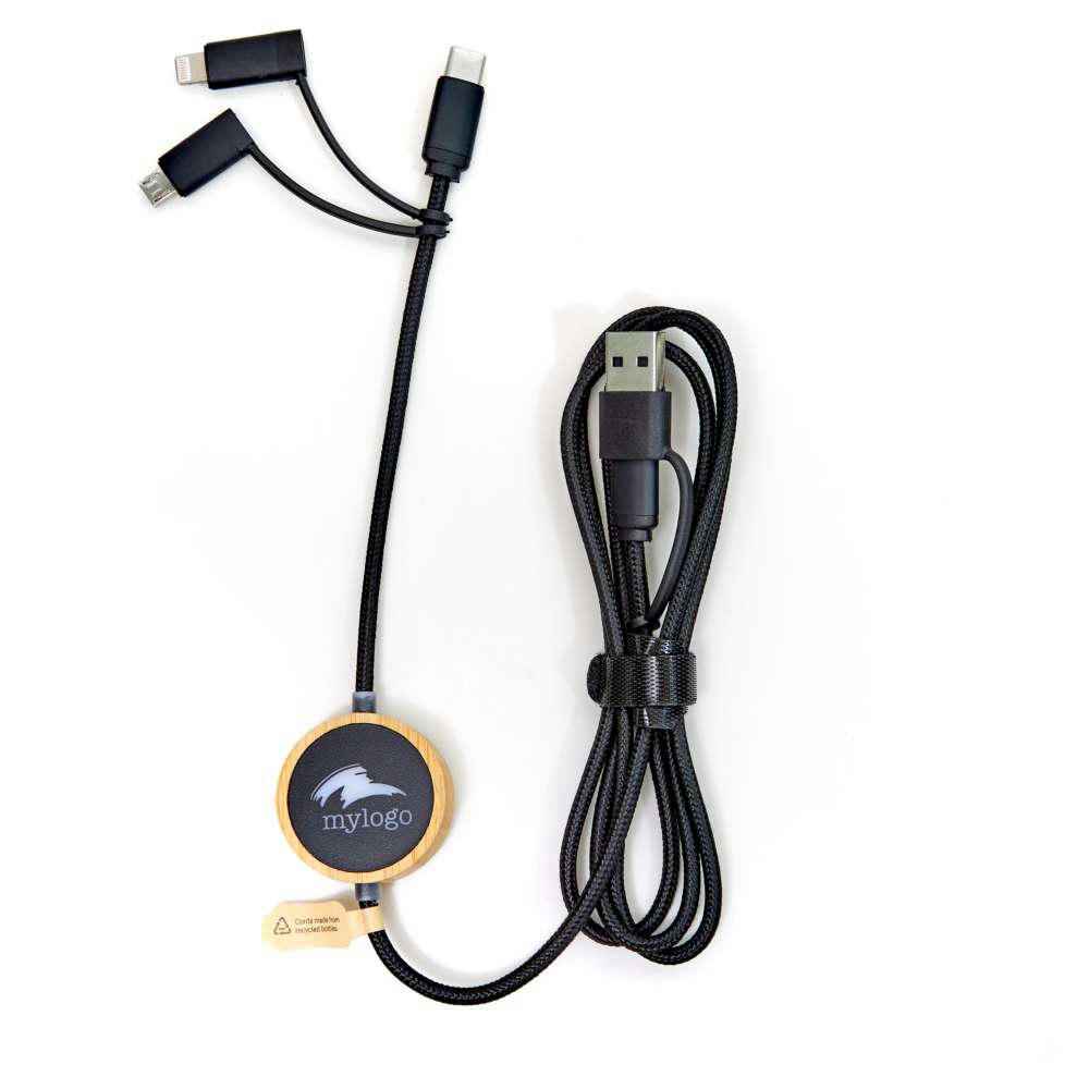 Ladekabel mit beleuchteter in Bambus eingefasster Logo Fläche. Eingang USB Type-C Stecker mit Adapter auf Type A Stecker auf Ausgang Type-C Stecker mit Adaptern für iPhone Lightning und Micro USB.