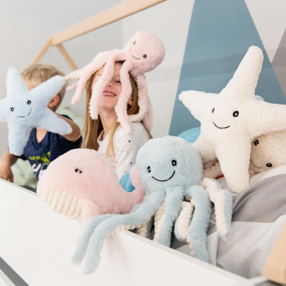 Studien haben gezeigt, dass Kuscheltiere in Form eines Oktopus ideal für den Start von Früh- und Neugeborenen sind, weil die Tentakel an die Nabelschnur erinnern. Liebevoll designt und entwickelt leisten die Recycel-Tieren außerdem einen wichtigen Beitrag zum Thema Nachhaltigkeit: Alle Recycle-Tiere bestehen aus genutzten und recycelten Plastikflaschen. Augen und Nase sind gestickt, es werden also keine zusätzlichen Plastikteile verwendet. Diese liebevoll gestalteten Schätze des Meeres aus zartem Plüsch eignen sich perfekt zum Schmusen, Kuscheln und Liebhaben. Versicherungen, Banken, Krankenhäuser, Kinderärzte und Kommunen können mit diesen Lieblingen im Willkommenspaket für den neuen Erdenbürger nicht nur ein Lächeln schenken, sondern auch Verbindungen fürs Leben schaffen. Eine Veredelung ist via Druck oder per eigenem Plott auf der angebrachten Werbefahne möglich und erinnert so stets an den Schenker.