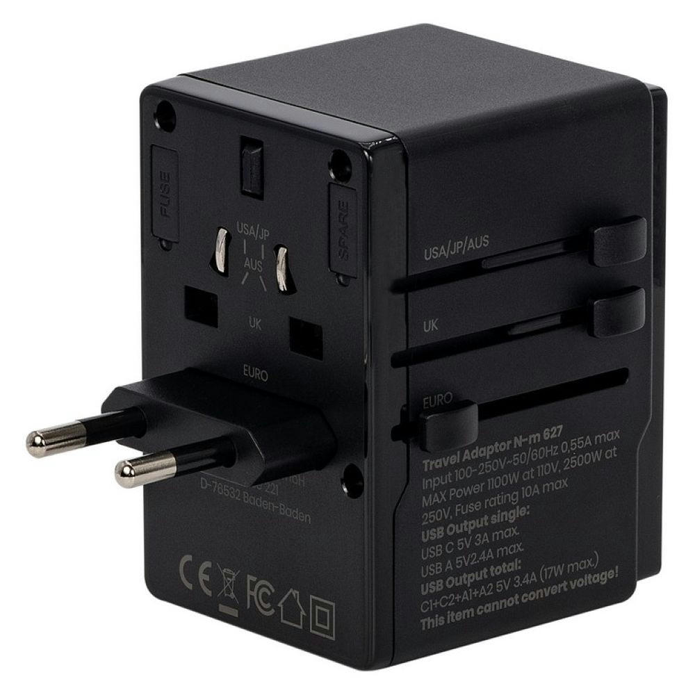Universeller Reiseadapter stellt fast überall sicher, dass Ihre Geräte Energie erhalten (UK, EU, AUS, US) Input: 100 - 250V, 50/60 Hz, 0,55A max. Maximale Belastung 1100W bei 110V, 2500W bei 250V 10A Überlastungssicherung Output USB A (einzeln): 5V/2,4A (max.) Output Typ-C (einzeln): 5V/3A (max.) Output USB A und Typ-C kombiniert: 5V/2,4A (max.)