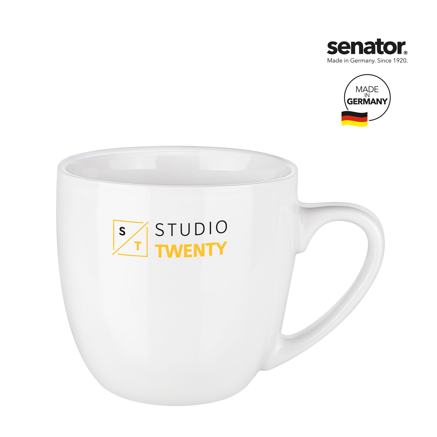 Große Porzellantasse in bauchiger Form, hochglänzend weiß.