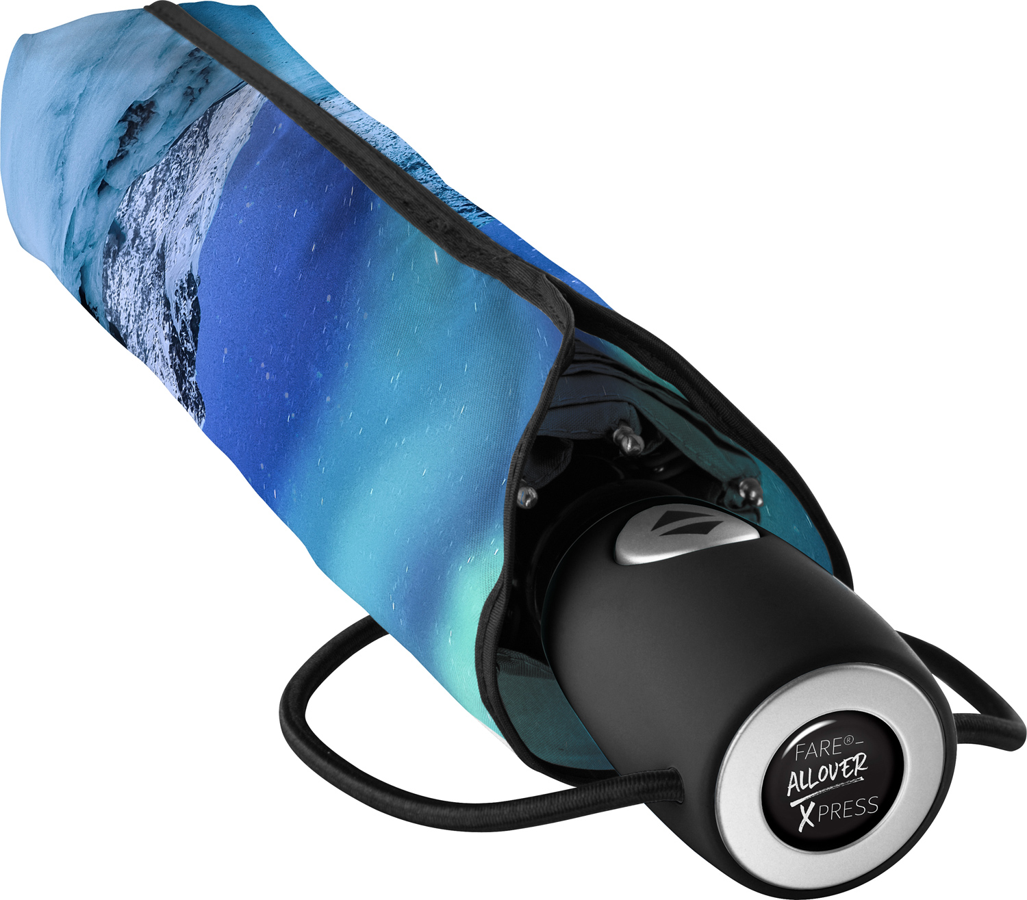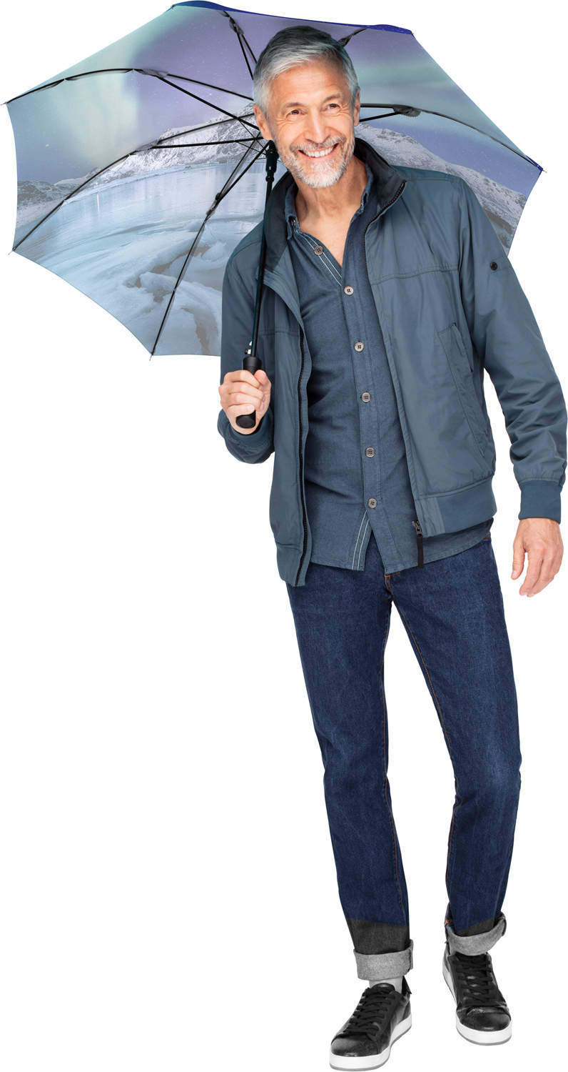 Individuelles Design im Allover-Druck. Bereits ab 100 Stück lässt sich ein vollflächiger Digital-Allover-Druck des Wunschmotivs umsetzen. Dabei stehen Ihnen 8 verschiedene Schirmmodelle zur Auswahl. Darüber hinaus stehen Ihnen noch weitere Veredelungsmöglichkeiten zur Verfügung wie Druck auf dem Futteral, Domingsticker im Griff oder Druck auf dem Schließband. Fragen Sie uns nach den Möglichkeiten.