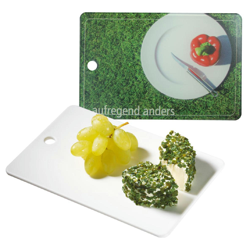 Schneidbrett in handlicher Größe mit Loch zum Aufhängen. Für die kleine Mahlzeit zwischendurch. IMould-Veredelung möglich.